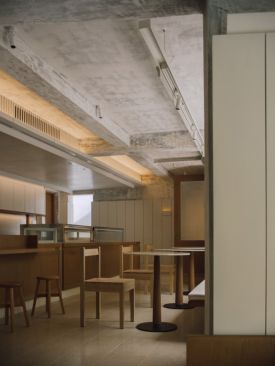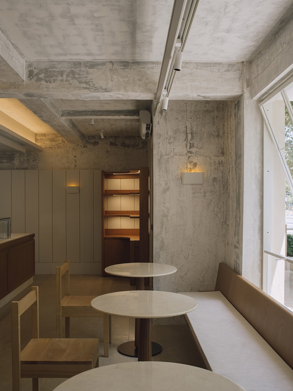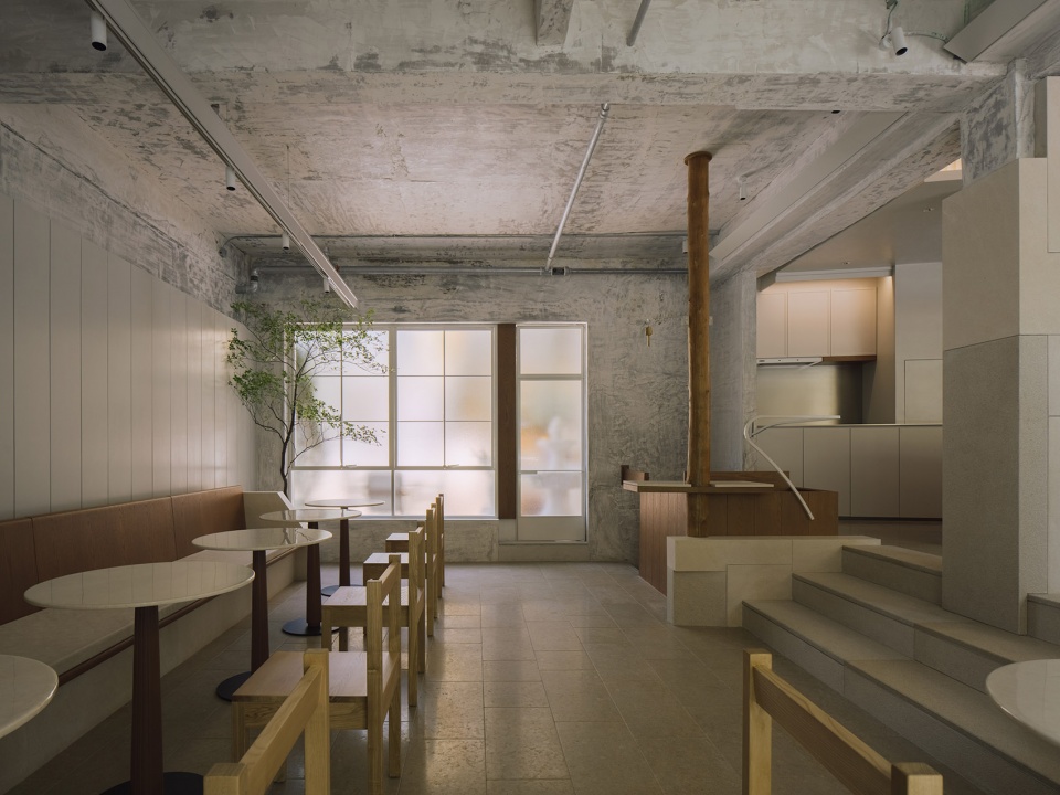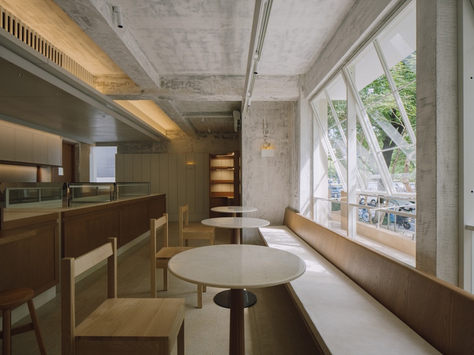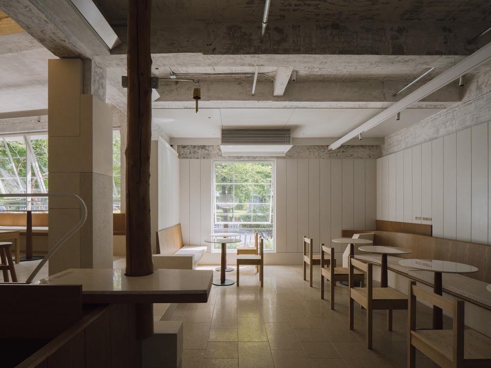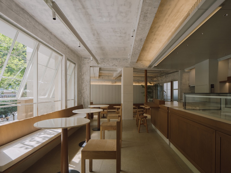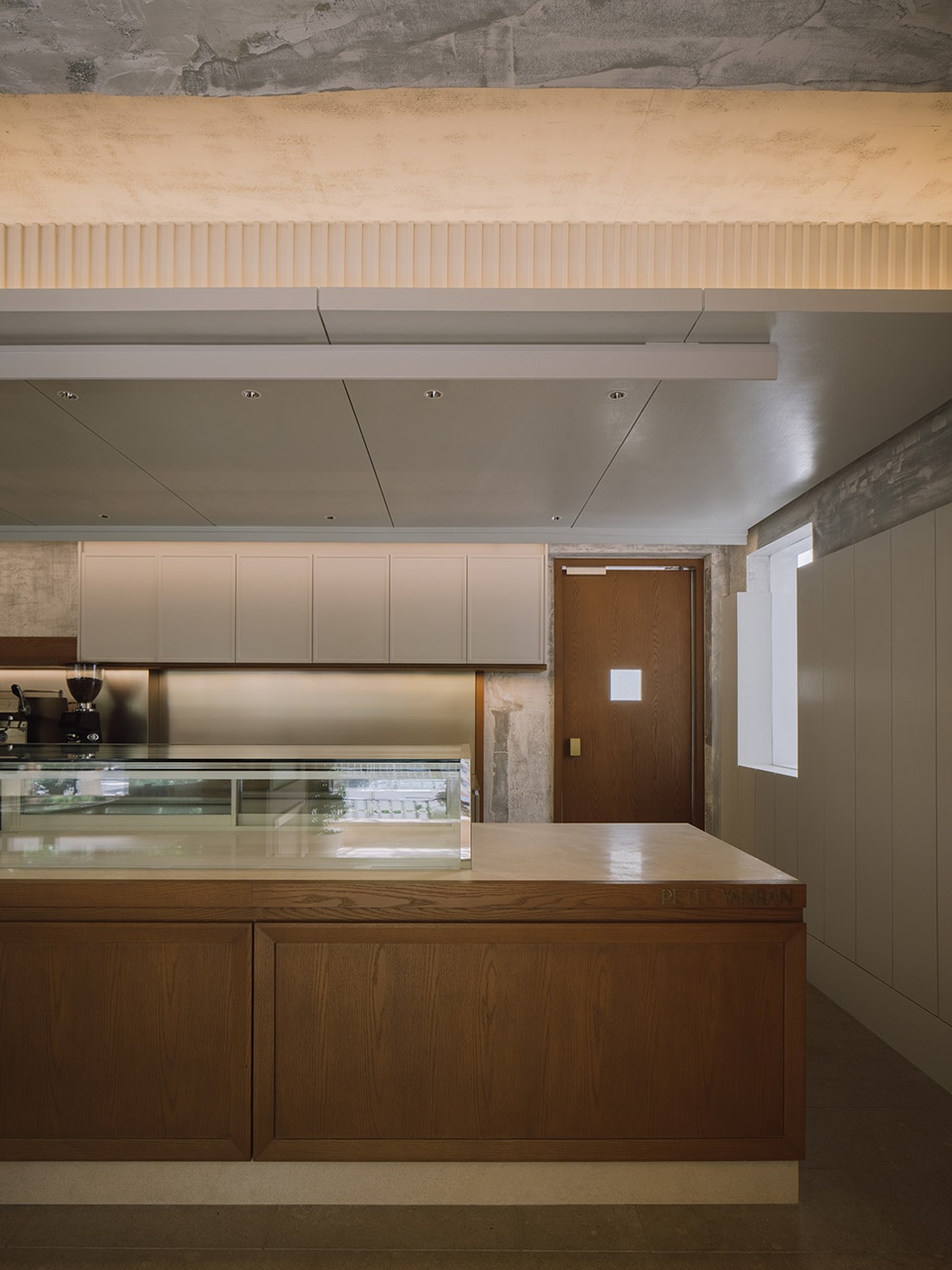 PETIT YANRAN 需要的,是一个让人慢下来的环境——而不是一个让人兴奋、很快离开的空间。因此,我们保留了一些“拙感”,将原有建筑的混凝土顶面与粗粝墙体保留下来,作为空间的底层界面;新加入的木、石与金属,被压在相近的对比关系中,与原始材质并置,而不是覆盖;光被收在界面边缘,不在空间中形成明确的视觉焦点。