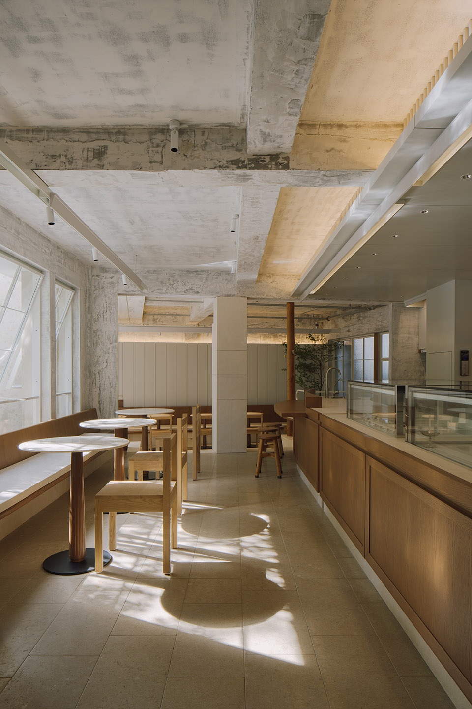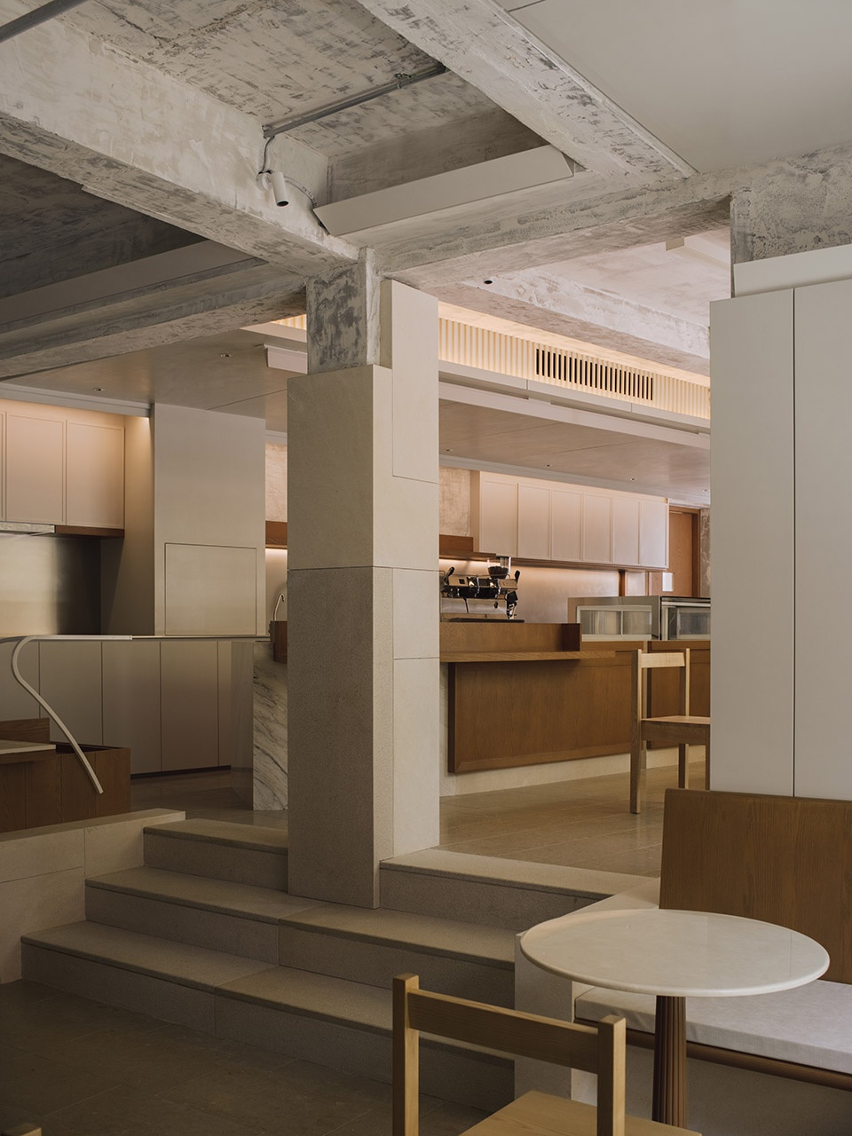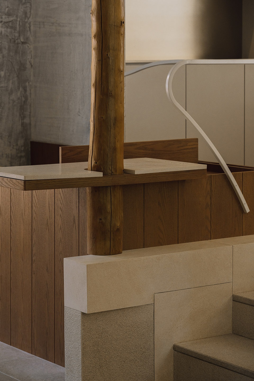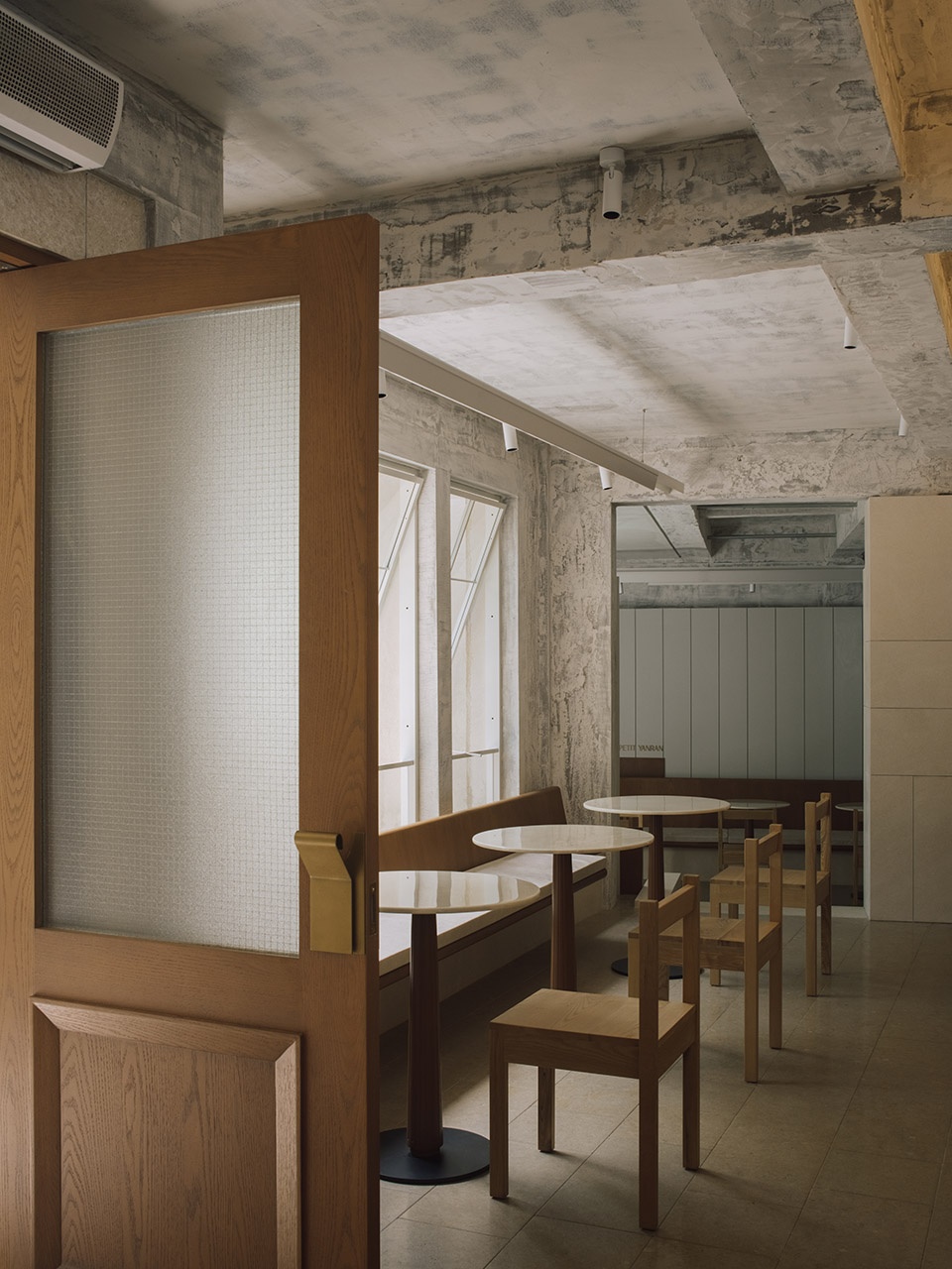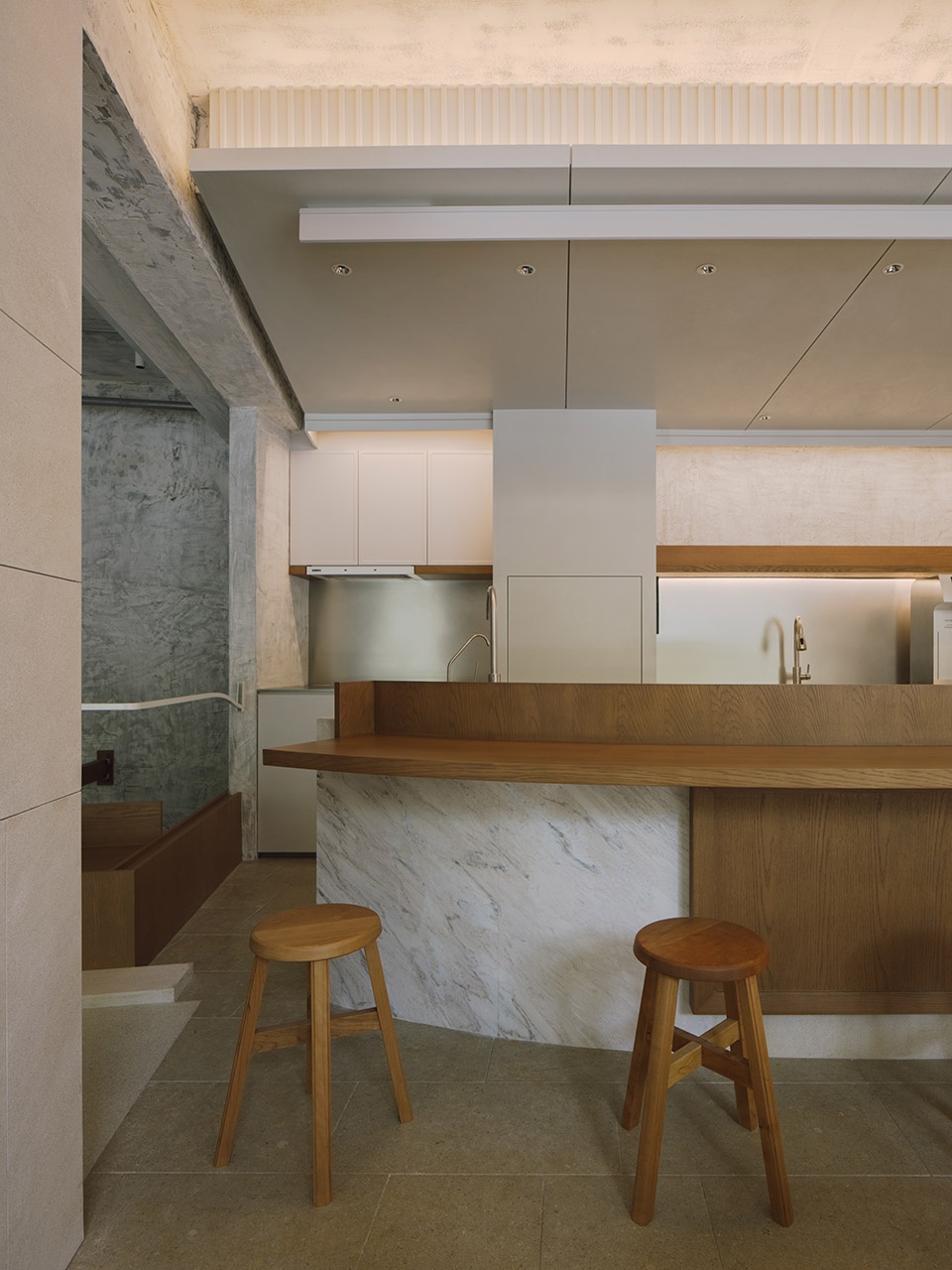 PETIT YANRAN 需要的,是一个让人慢下来的环境——而不是一个让人兴奋、很快离开的空间。因此,我们保留了一些“拙感”,将原有建筑的混凝土顶面与粗粝墙体保留下来,作为空间的底层界面;新加入的木、石与金属,被压在相近的对比关系中,与原始材质并置,而不是覆盖;光被收在界面边缘,不在空间中形成明确的视觉焦点。