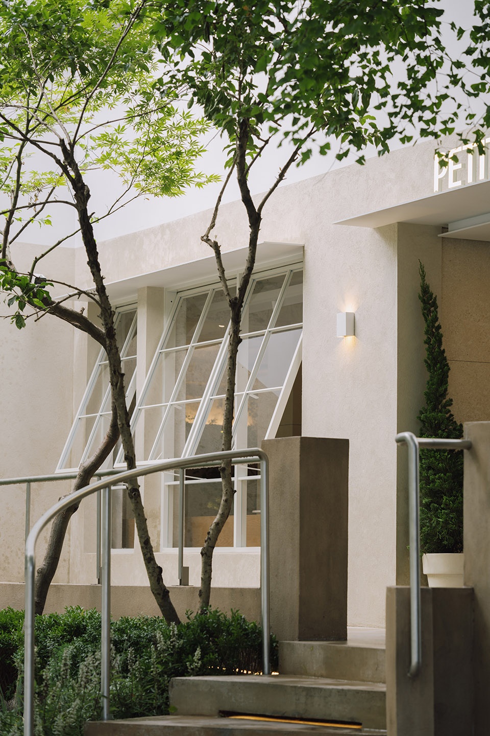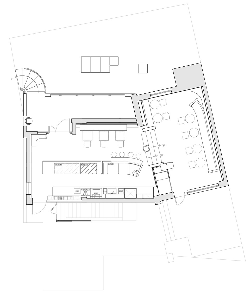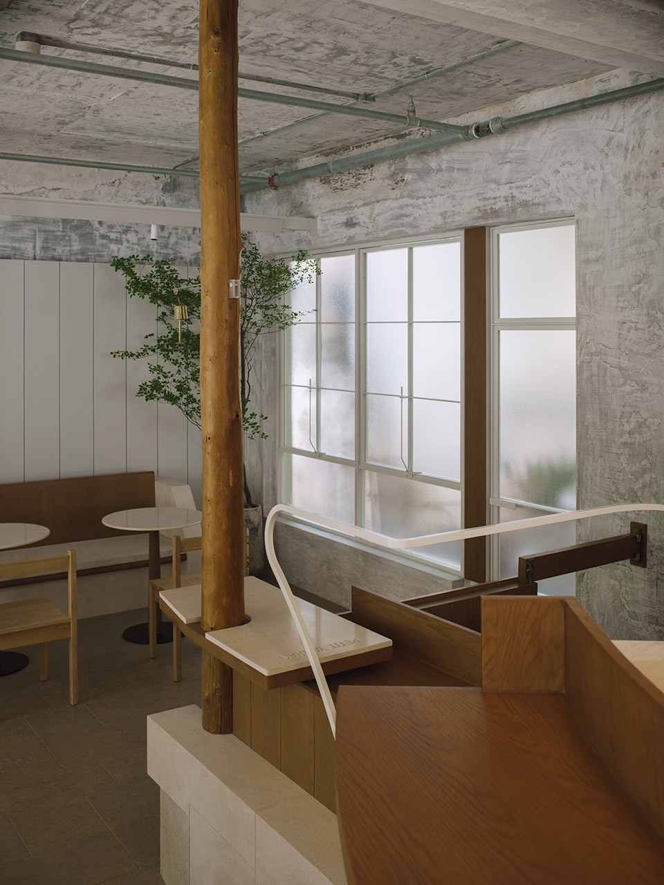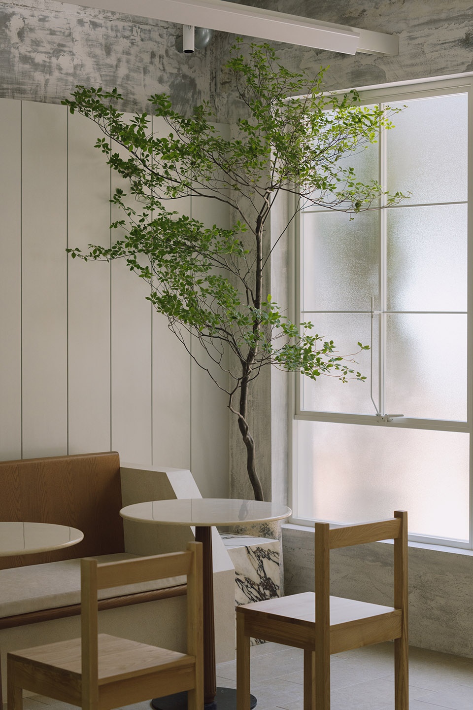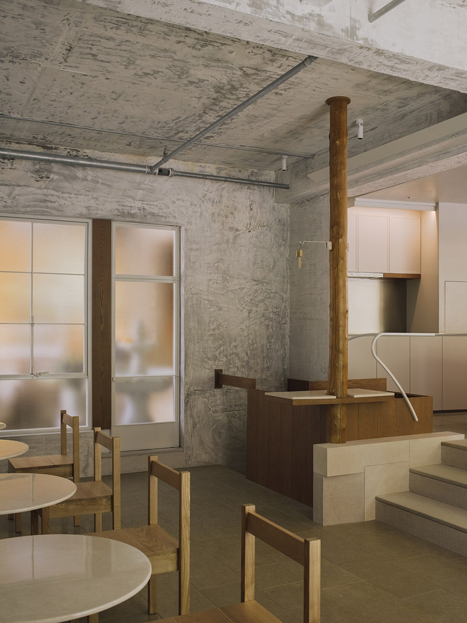 PETIT YANRAN 需要的,是一个让人慢下来的环境——而不是一个让人兴奋、很快离开的空间。因此,我们保留了一些“拙感”,将原有建筑的混凝土顶面与粗粝墙体保留下来,作为空间的底层界面;新加入的木、石与金属,被压在相近的对比关系中,与原始材质并置,而不是覆盖;光被收在界面边缘,不在空间中形成明确的视觉焦点。