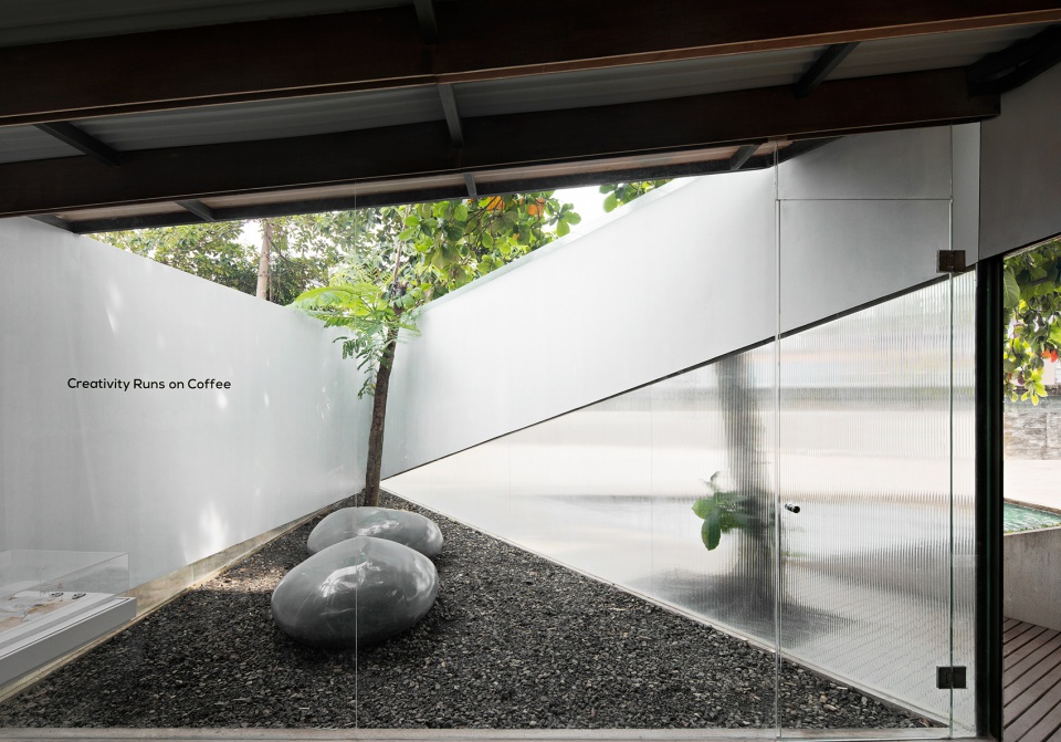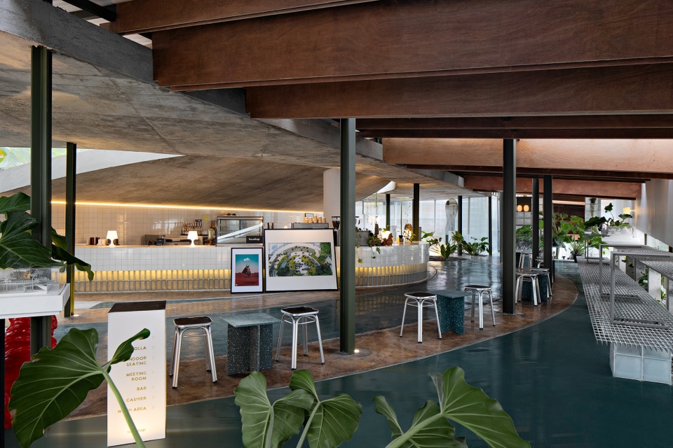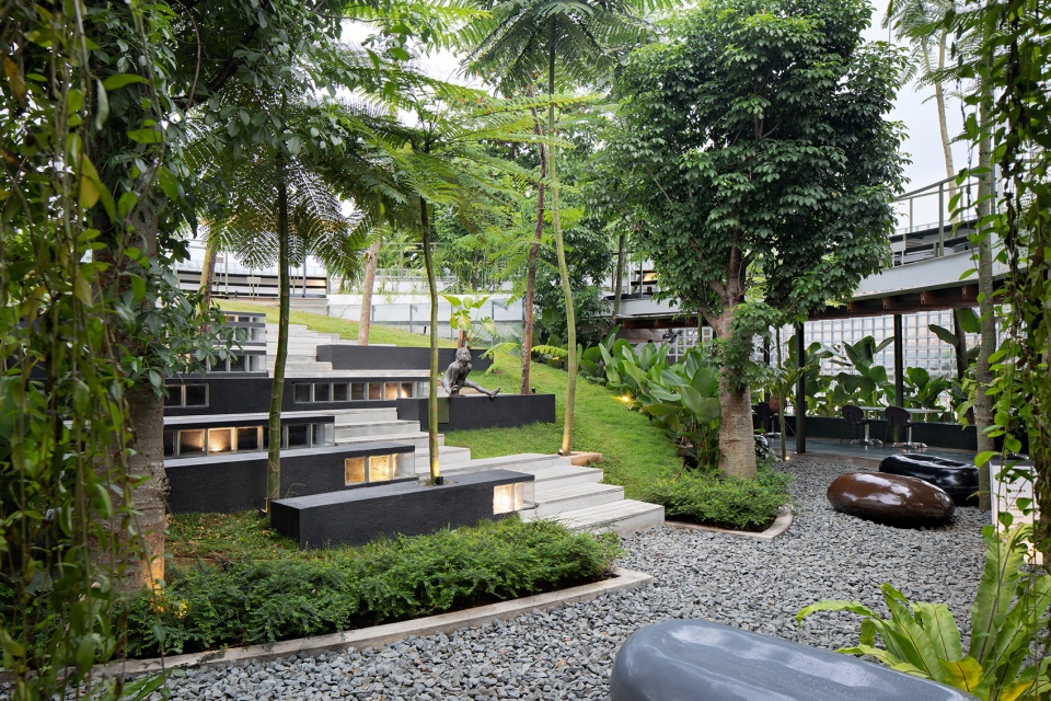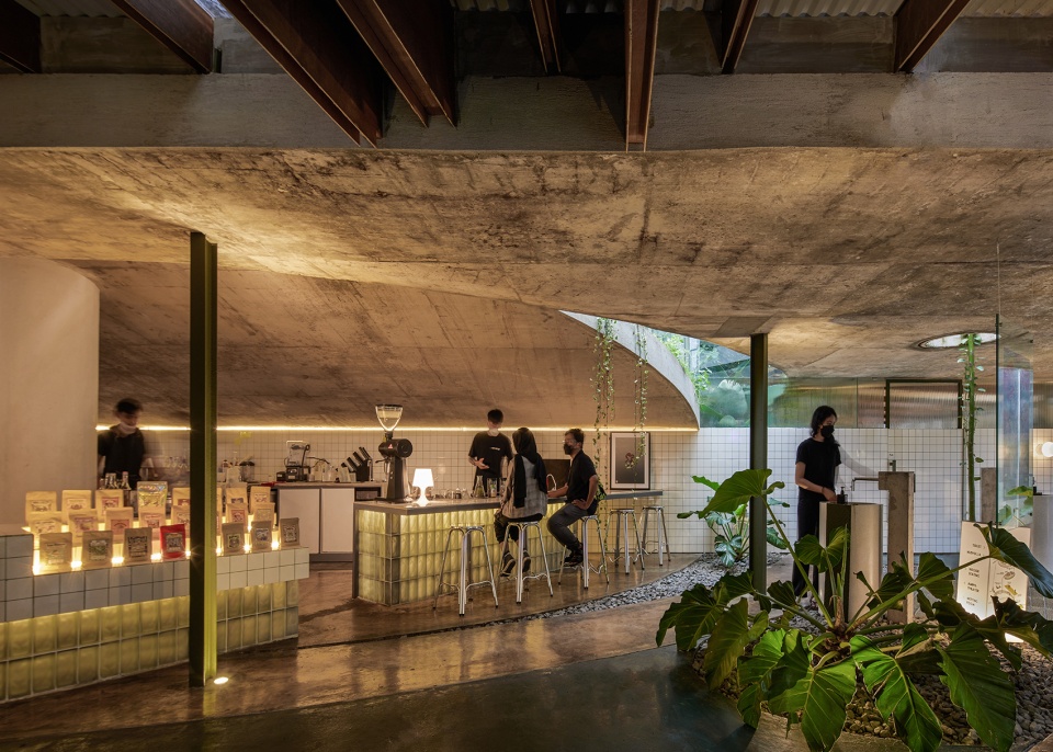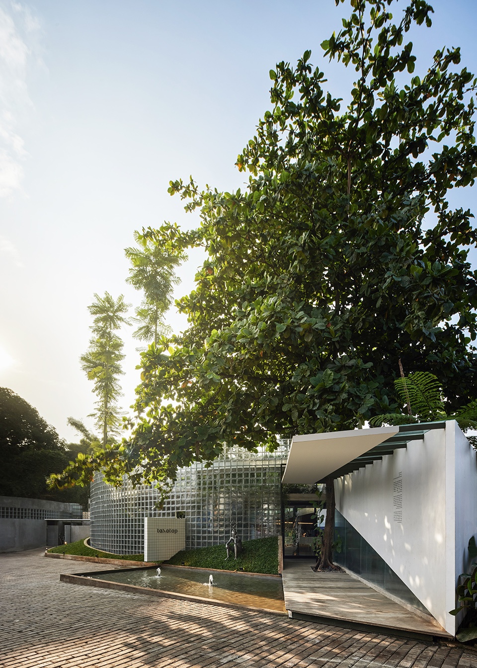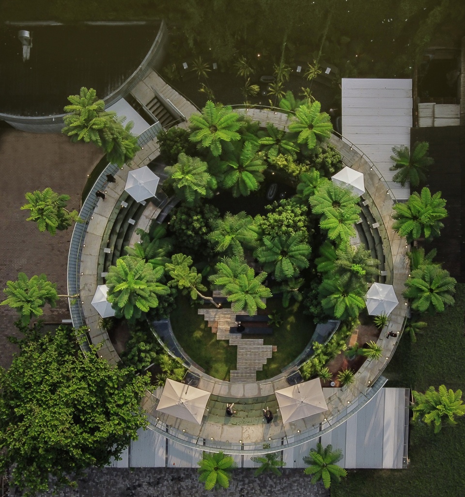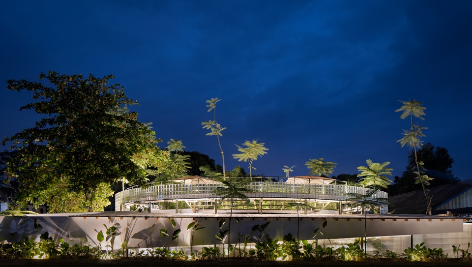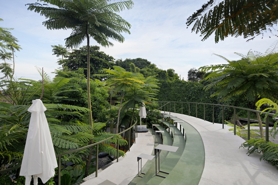 Tanatap环形花园咖啡店是微缩版的多层次绿化空间,其起落平台构成可以行走的屋顶露台。屋顶露台相连成漂浮的圆形剧场,围绕着中间的绿化空间和热带户外活动区。