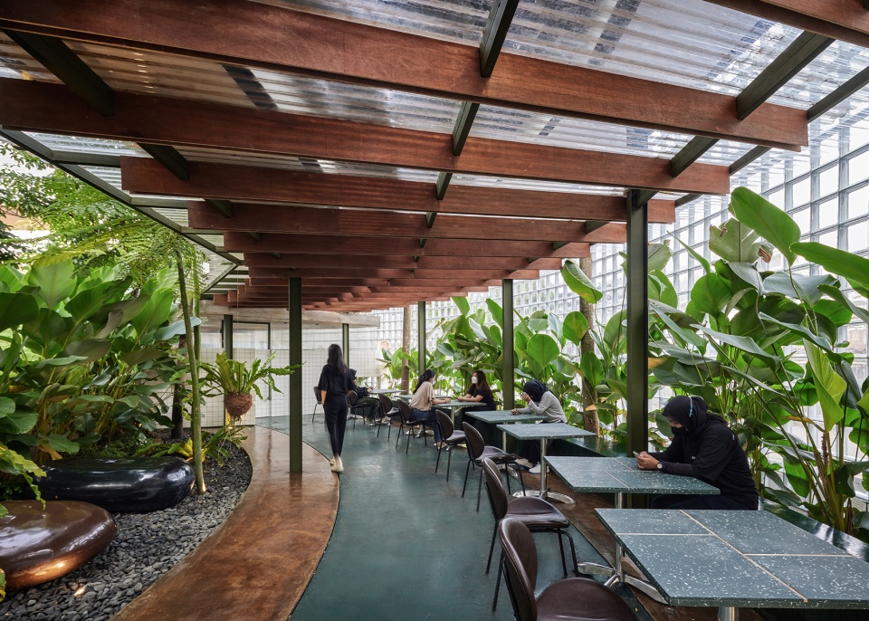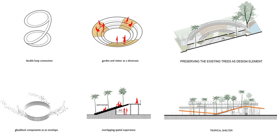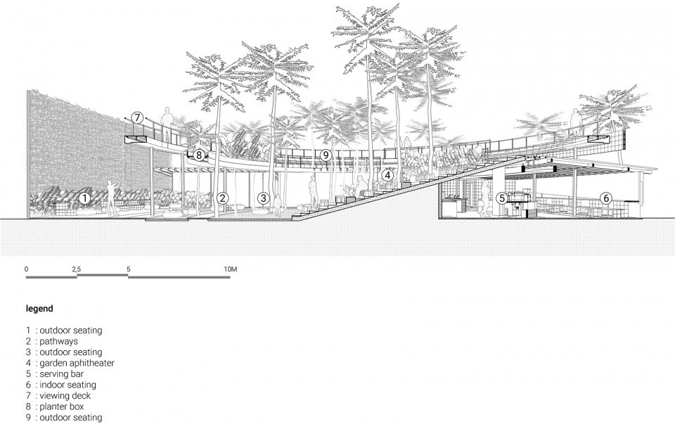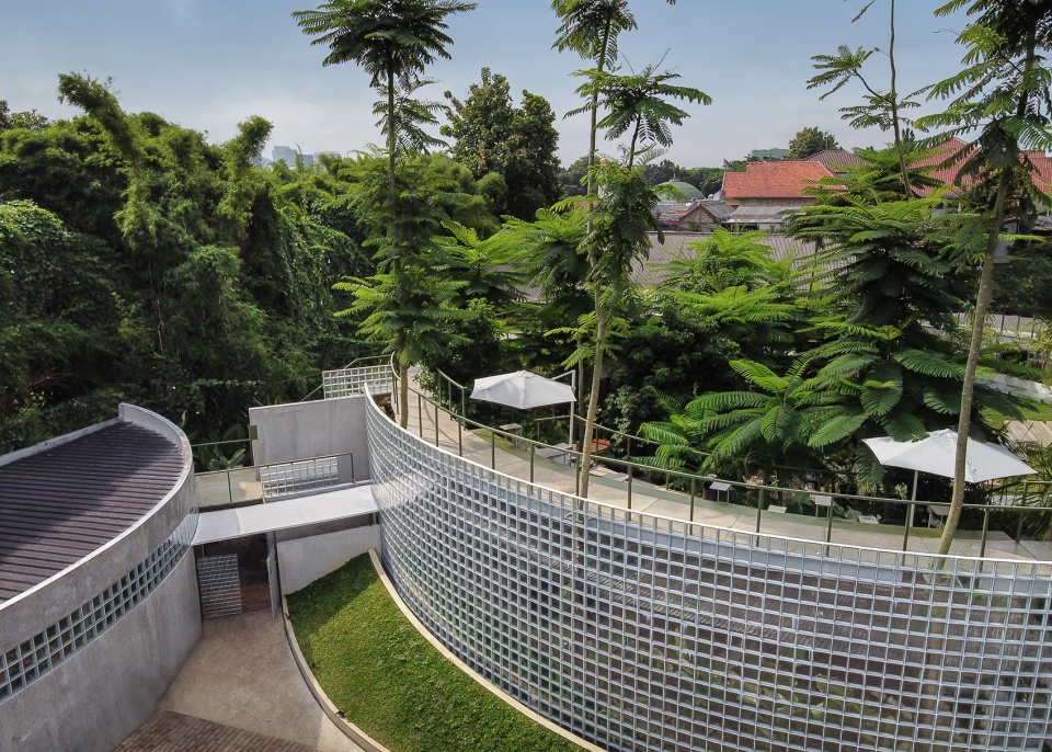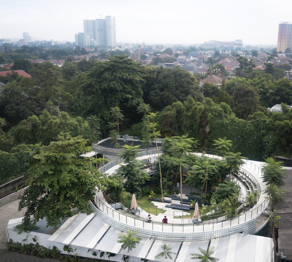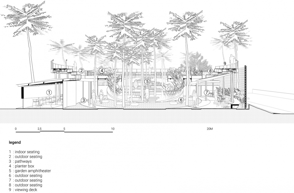 如果功能空间和建筑只作为开放花园的外壳会怎么样?设计以这个问题为出发点,旨在展示隐藏在多层次花园中的室内空间。该空间并非原始空间,而是经过设计的连续空间。项目的核心理念是“嬉戏共处”,设计团队希望打造出令人耳目一新的、充满活力的、可持续发展的城市空间,因为在雅加达这样的发展中国家城市,政府运营的公共空间并不可靠。