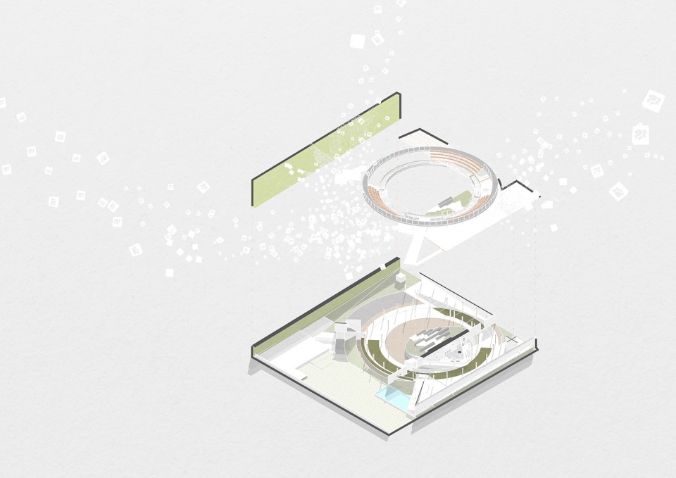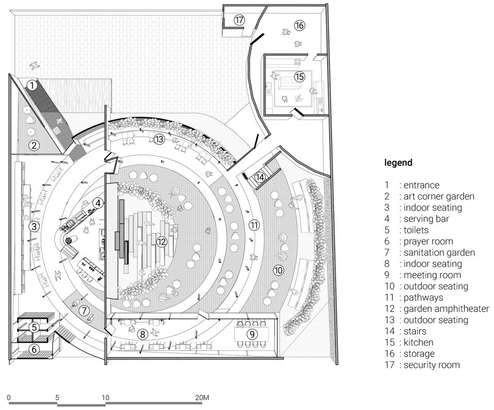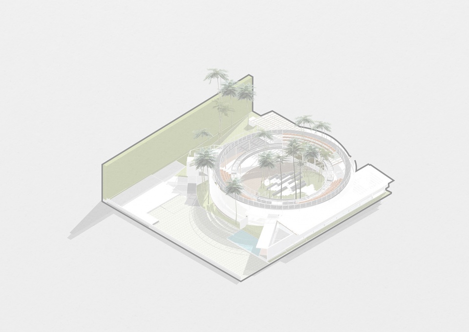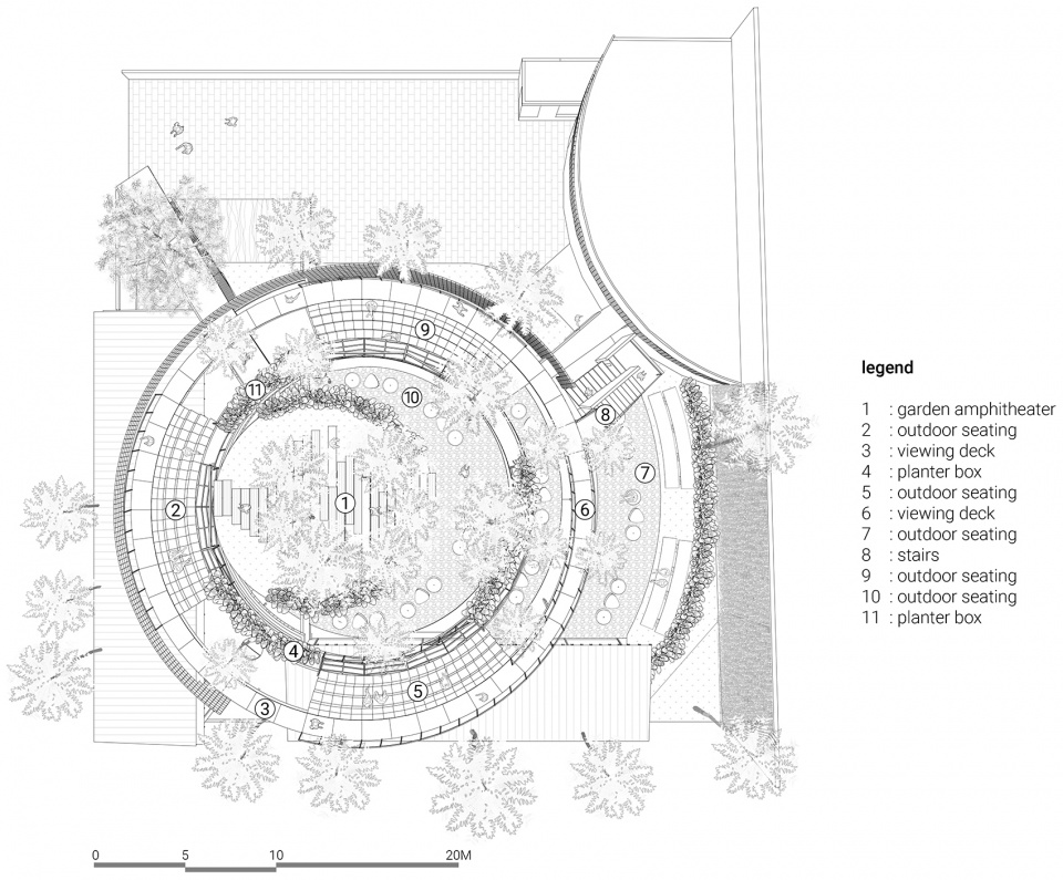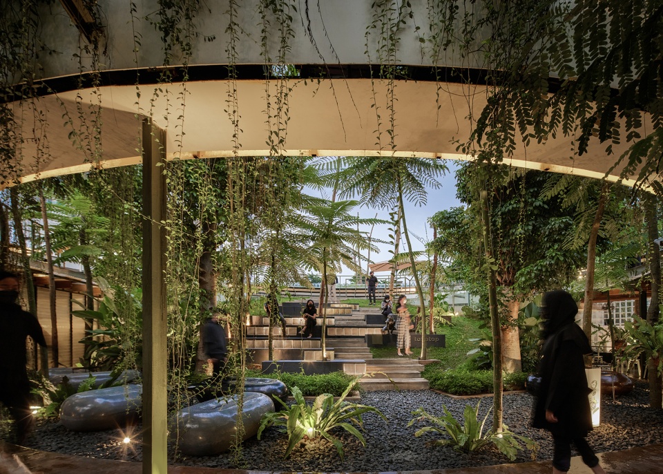 如果功能空间和建筑只作为开放花园的外壳会怎么样?设计以这个问题为出发点,旨在展示隐藏在多层次花园中的室内空间。该空间并非原始空间,而是经过设计的连续空间。项目的核心理念是“嬉戏共处”,设计团队希望打造出令人耳目一新的、充满活力的、可持续发展的城市空间,因为在雅加达这样的发展中国家城市,政府运营的公共空间并不可靠。