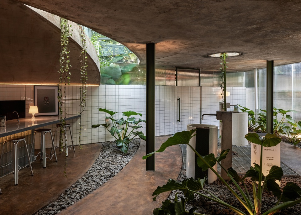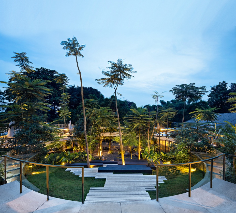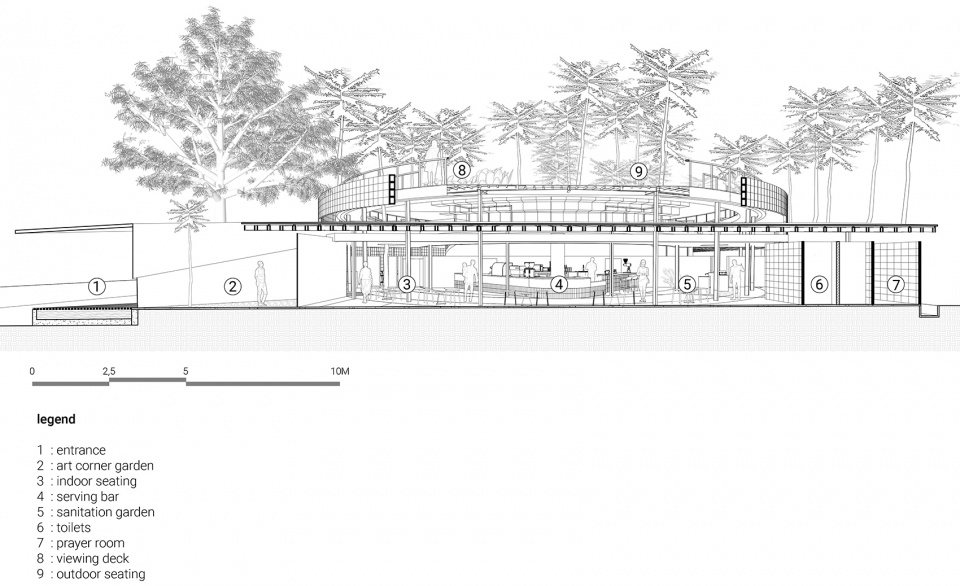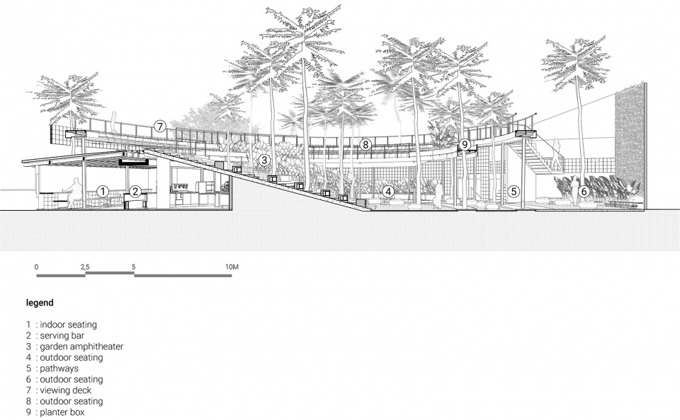 当游客走向环形花园咖啡厅,他们会被连接两棵树木的栈道所包围,树木模糊了室内外空间的界限。进入建筑内,他们会被天窗和上方花园里人们的活动所吸引。同心圆的中间是咖啡吧,空间在暗门后面一分为二,逐渐变得不那么私密并且充斥着更多自然光。这两个空间都通向宽敞的多层次花园,花园作为空间的结尾,间接地鼓励游客去享受更多热带花园带来的乐趣。