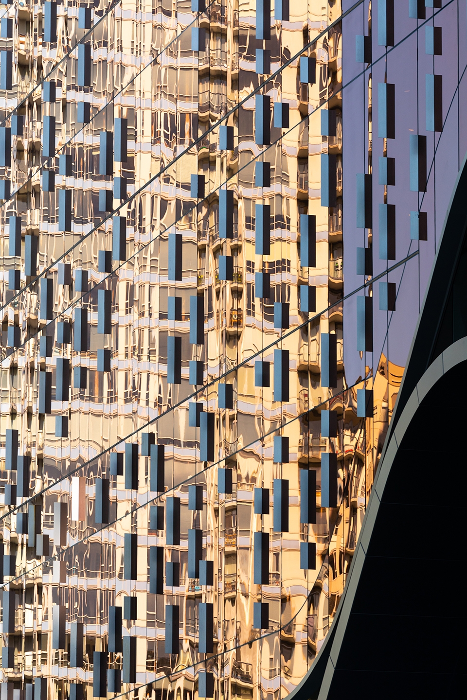 PARQ的设计利用一系列线条、形状、弧度和坡度塑造出了多样化的立面,同时回应了其周围的复杂环境。流畅的轮廓和富有动感的体态反映了城市标志性的山脉、谷地、峡谷和海洋。主立面的玻璃幕墙呈现出类似于铜的色调,闪烁着微光的金属百叶窗按照像素化的山脉图案进行排列,随着阳光的照射和移动在一天中不断变化,犹如在太平洋的海面上空舞动。