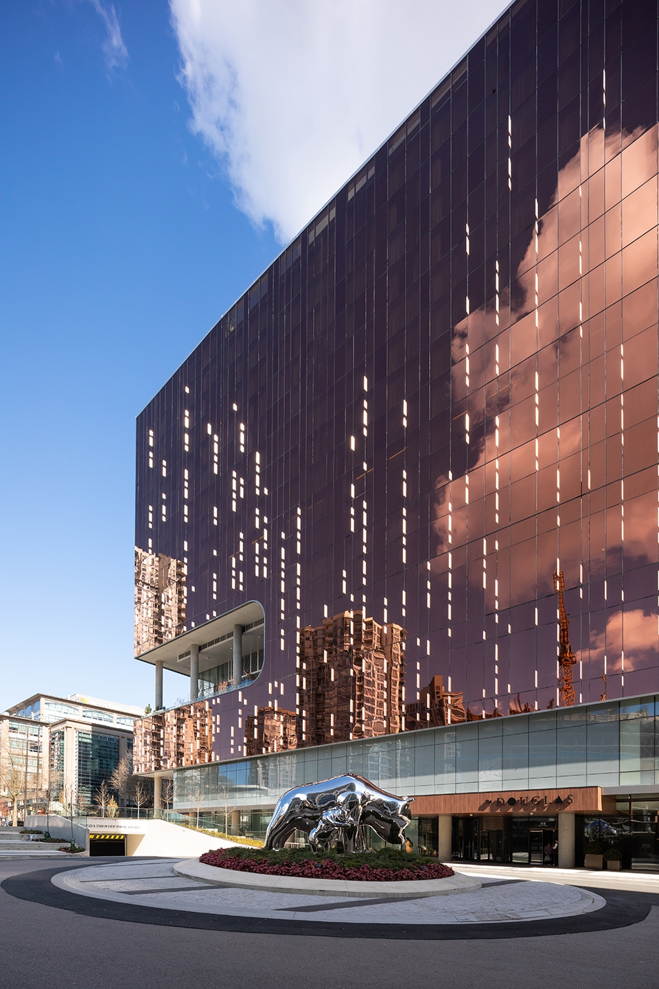 ▼主立面的玻璃幕墙呈现出类似于铜的色调