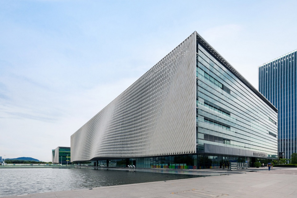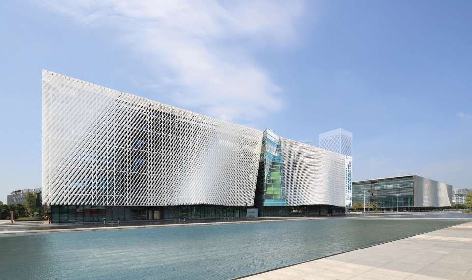 建筑外立面的设计意念继承着岭南通花木雕和象牙绣球的精巧技艺,营造一套玲珑通透、层次丰富的节能遮阳外墙。三座建筑采用同样精致的铝合金网状外皮,视觉上彼此融合、相互呼应,塑造出具有独立个性但理念统一的形体组合。