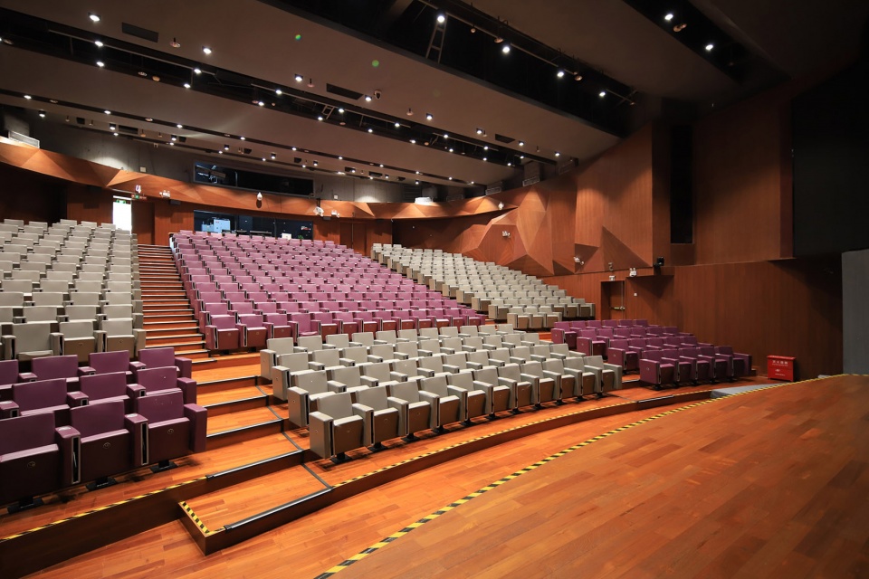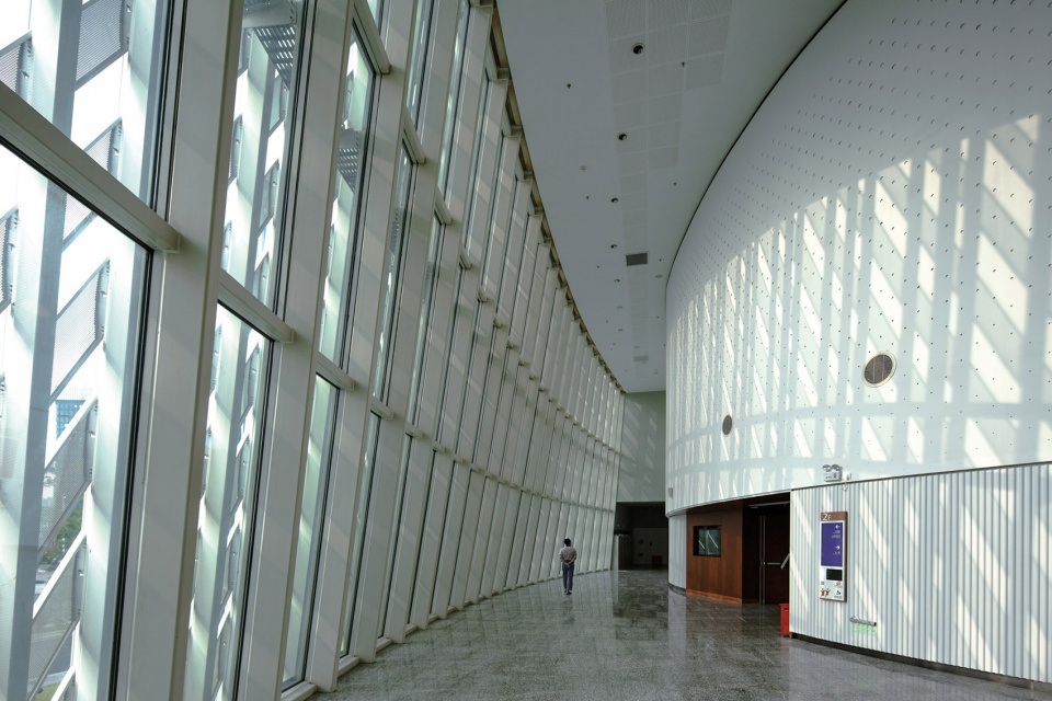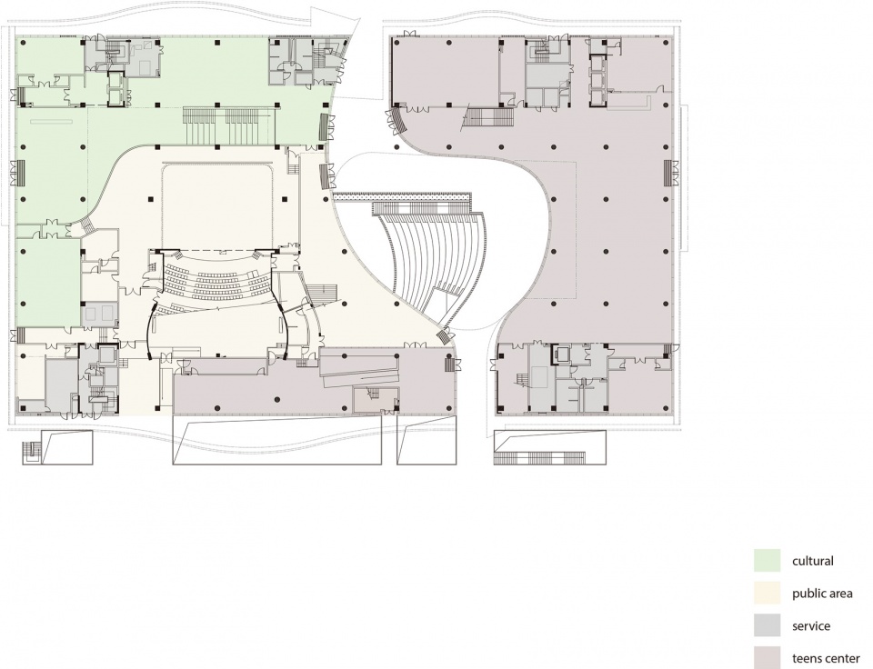 临近图书馆的是一座34,000平方米的青少年宫及文化艺术中心。设计上以中央的户外广场及露天剧场将两个功能组织独立的运营单位分隔开。青少年宫位于户外广场的南侧而文化艺术中心则设于北侧。为了增加运作上的弹性,两部分功能以桥廊连接,运作单位可于个别楼层按功能需要选择连接或分隔,使有限的资源得以共享。中央户外广场与露天剧场是整栋建筑的焦点空间,此中庭在首层向开放的室内展示空间延伸,强化了室内外空间的联系,引入天然光线,提供自然通风的舒适宁静环境。