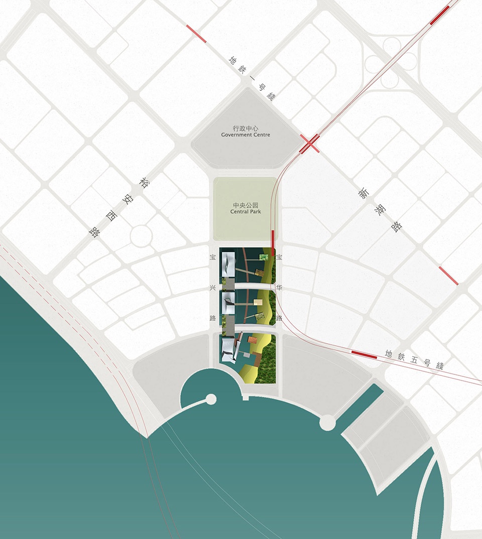 三座建筑布局一气呵成,依傍着宝安中心区中央绿轴,由城市一直延伸向海湾,中间交织着不同主题的广场空间,疏密有致,为宝安区市民提供了连接着滨海与城市的一系列室内外文化活动场所。