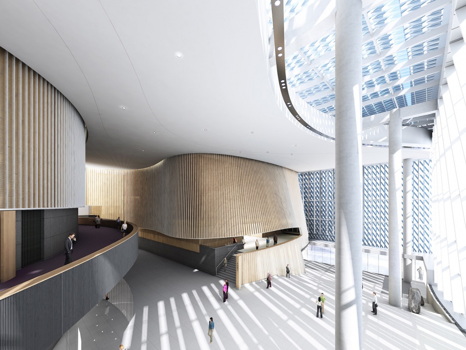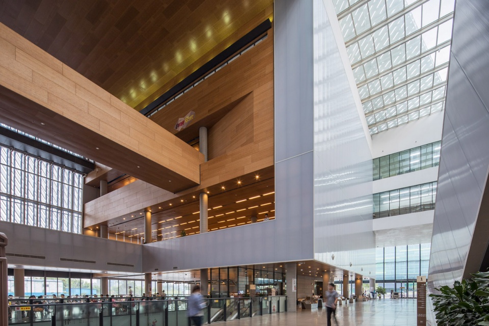 第一座48,000平方米的图书馆设在文化综合体的北端,建筑以南北向的室内中庭为中轴,东翼以开阔的阅读区为主线,连接着各种辅助设施;西翼为展览馆及小型博物馆。中庭大堂层高20米,与室外绿化景观平台有机连接,提供访客各类型公共活动及交流场所。