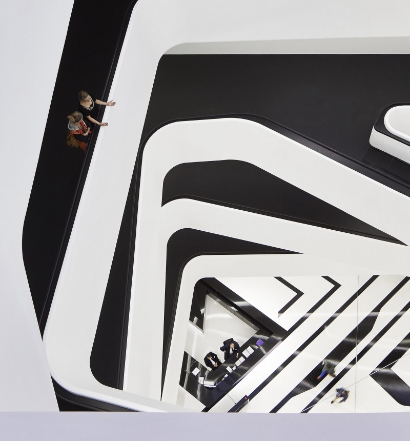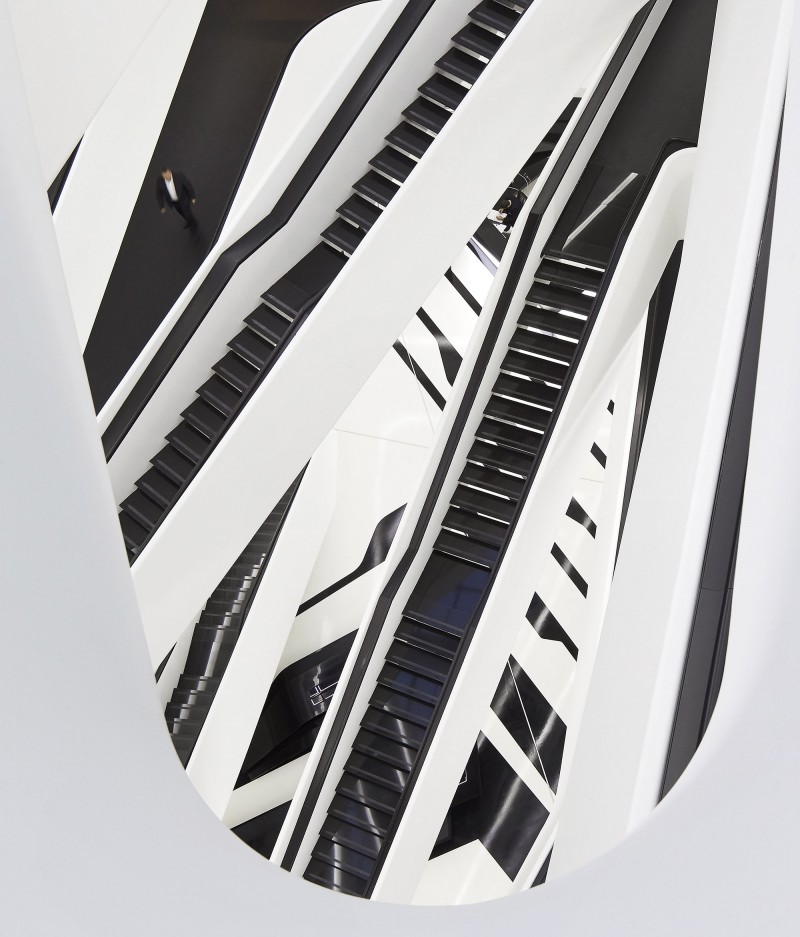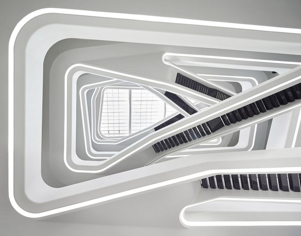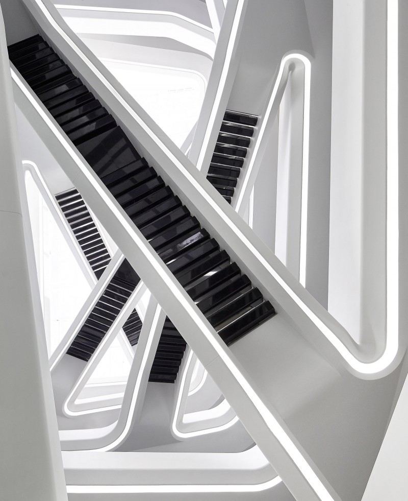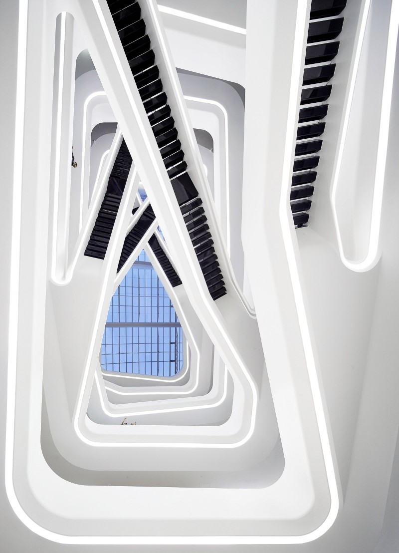 与外立面一层层伸缩的外形相呼应,在建筑内部,每层的平台也向着中庭出挑。极具造型感的楼梯通过中空区域将各个楼层串联起来。