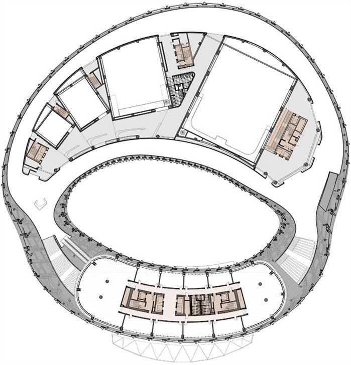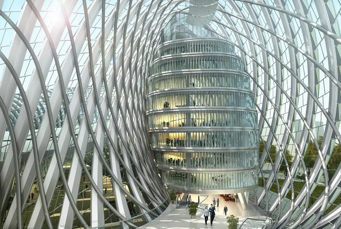 建筑的双层外皮很好地提高功能区的舒适度和建筑能耗。设计利用数字技术对外壳和实体功能空间进行量体裁衣,精确地吻合彼此的空间关系。共享空间利用30米的高差的下大上小的烟囱效应,在过渡季中,可以形成良好的自然气流组织,节省能耗。