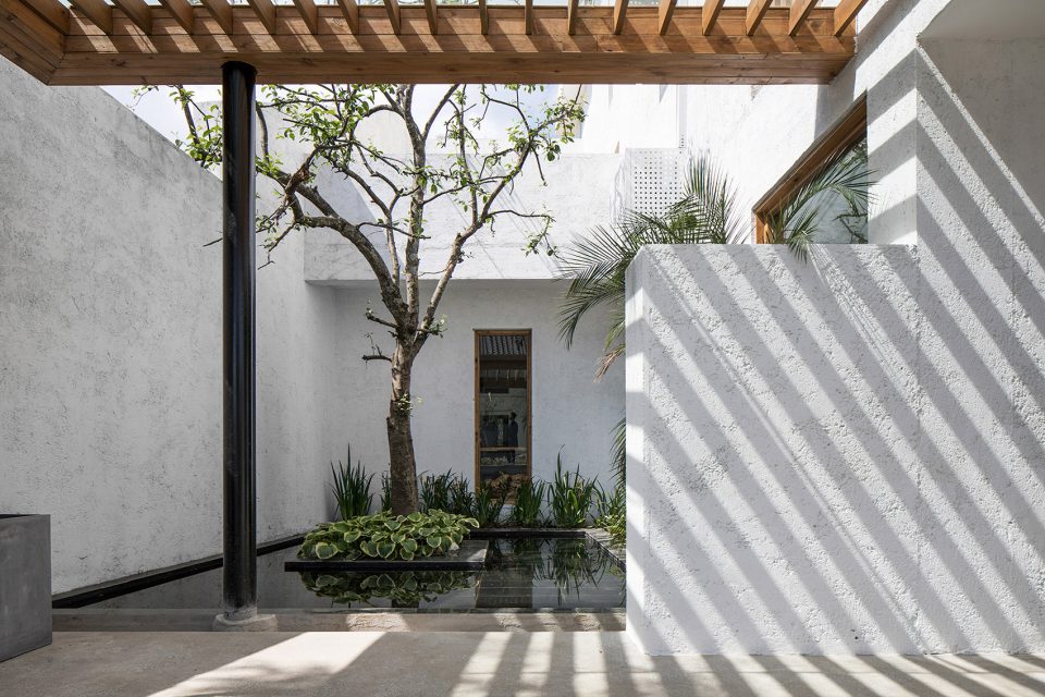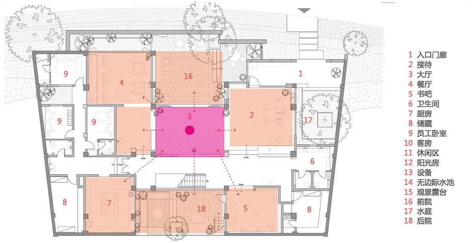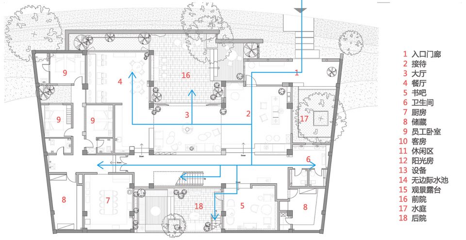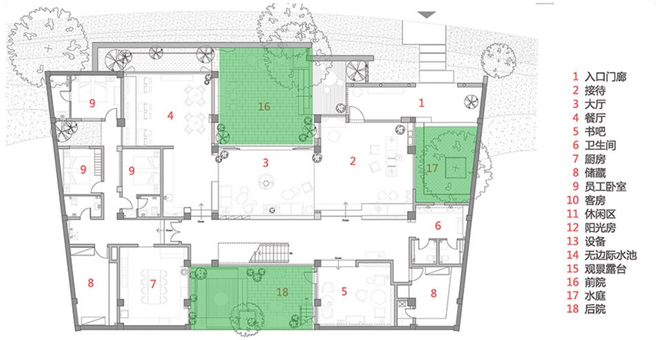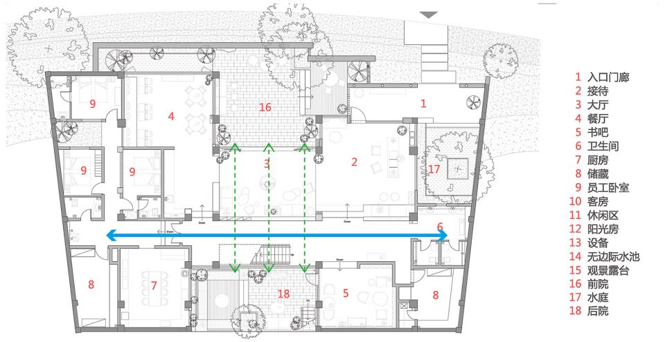 大厅前后各有一个庭院,增加采光的同时也为下沉的首层提供了内向的景观。两个庭院和大厅之间都以落地玻璃连接,视线可以在前后院之间交流,形成一种透明性,同时与东西向楼梯和走道所形成的主流线发生交错。下沉的前庭和后院是对自然坡地的呼应,同时也避免主干道的人流车流所造成的干扰,营造了一个安静的独立交流空间。