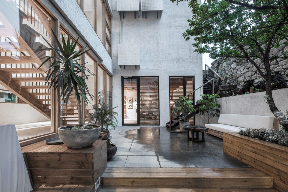 拾山房在材料的运用上也秉持着低调的特点。主体是略带粗粝的清水混凝土,配以木格栅和木质的窗框,顶层则是以木为主,与自然更为相融。首层院落则有山石堆砌的围墙,从坡地里长出。整体用色也非常克制,在这山水之中丝毫不显突兀。