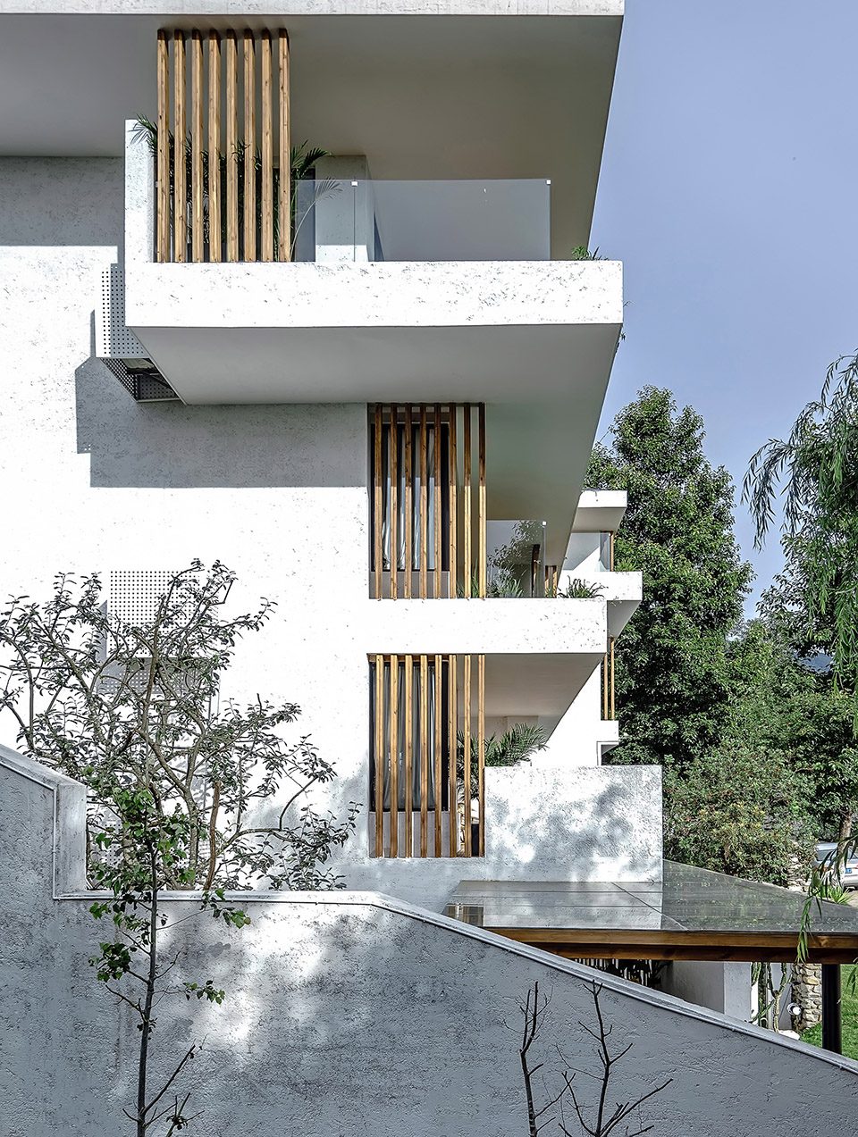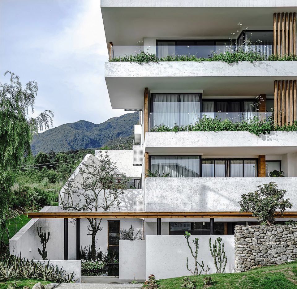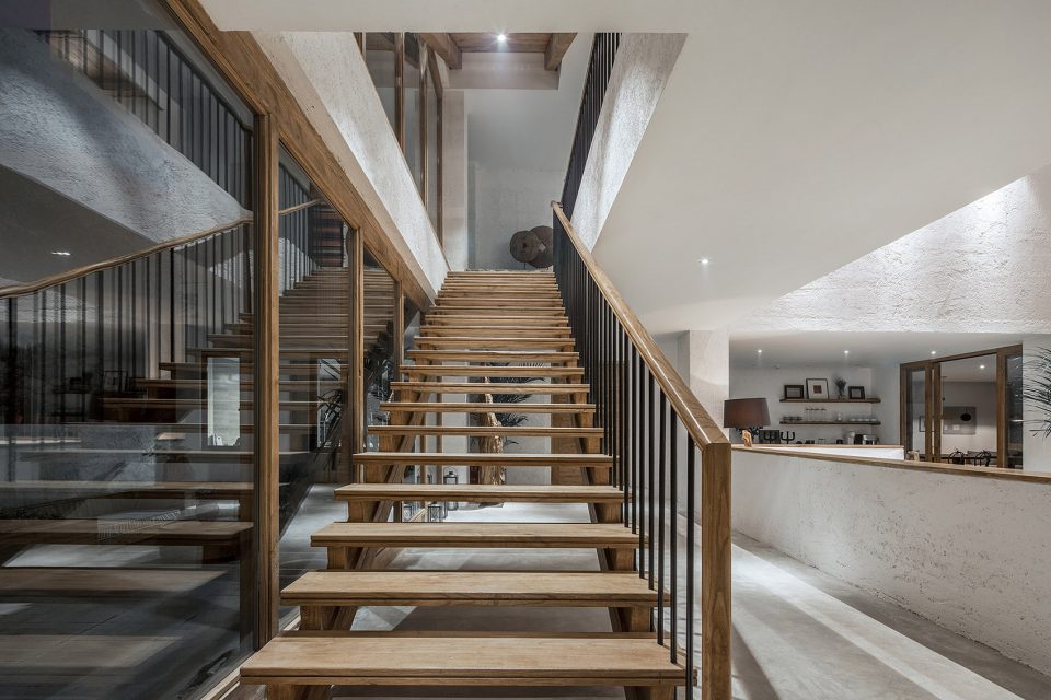 首层以公共空间为主,一到三层则是客房。每间客房都设计有巨大的露台和落地窗,最大程度将苍山洱海的绝妙景观收入房内。露台向外出挑,各层之间相互错落,为立面增添些许变化,也令整个建筑显得更为轻盈。