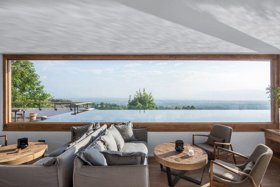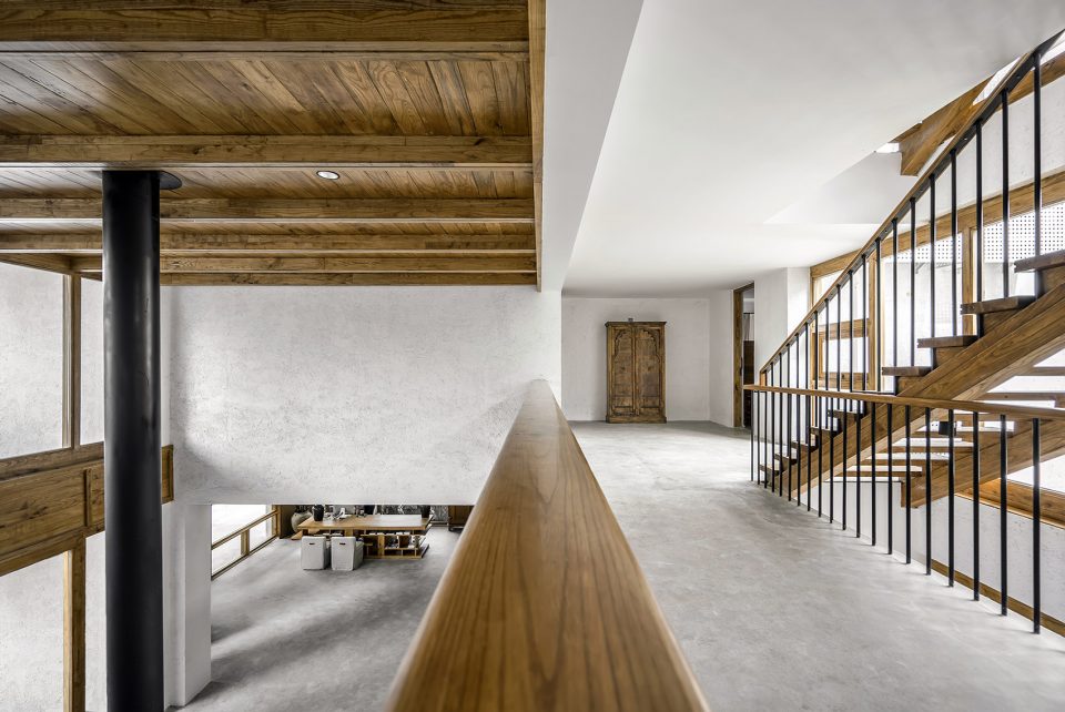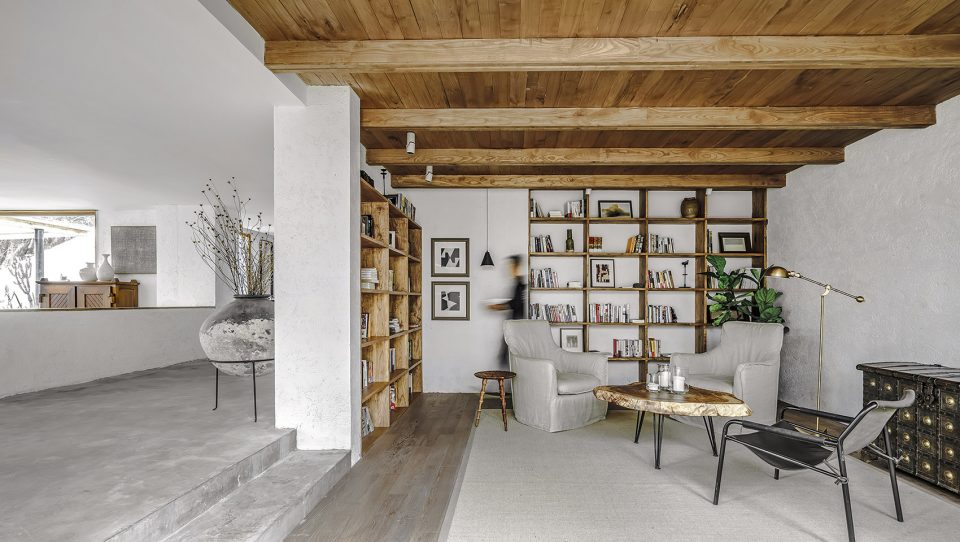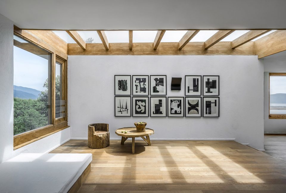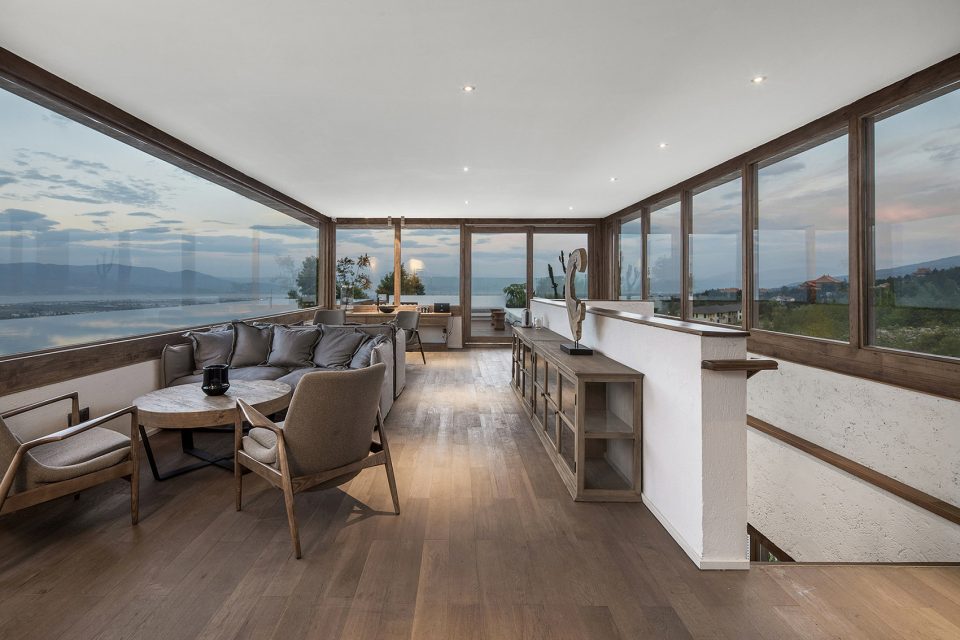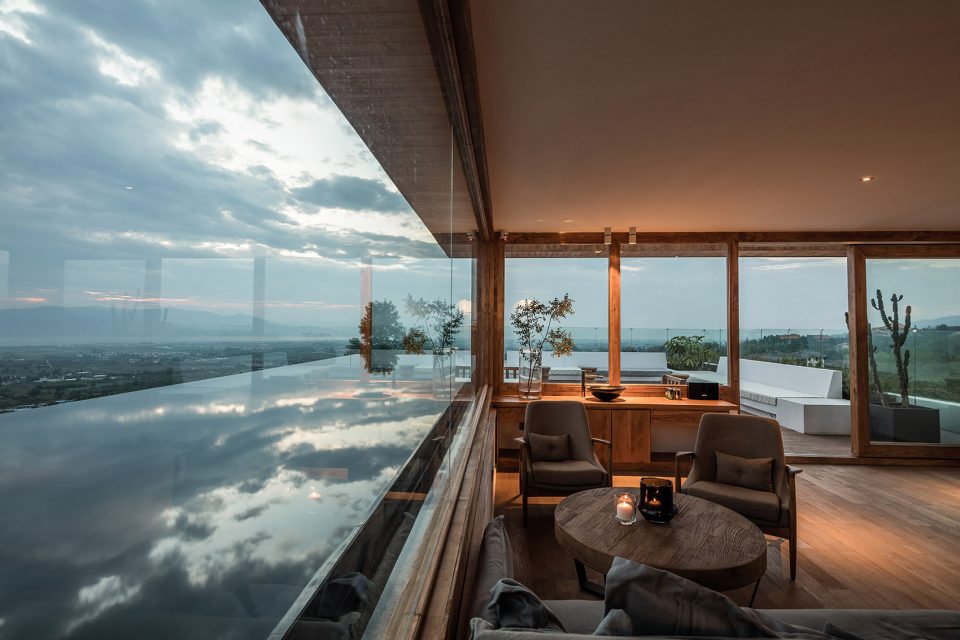 顶层是整个建筑的高潮。北侧面向洱海有一个长方形的浅水池,仿佛一面镜子收入大理最曼妙的流云,又像是洱海的一种微妙延续,将视线送出远方。这种无边际水池所带来的仪式感令拾山房的建筑空间达到一个高潮,也像是对于自然美景的一种敬畏与郑重。而面向苍山的一侧则是一个三面透明的阳光房,两级台阶的高差将这个阳光房的空间微微抬升,赋予其更为贴近苍山的姿态。家具都是低矮的几凳,盘膝而坐,山林苍翠环绕,倒生出几分禅意来。