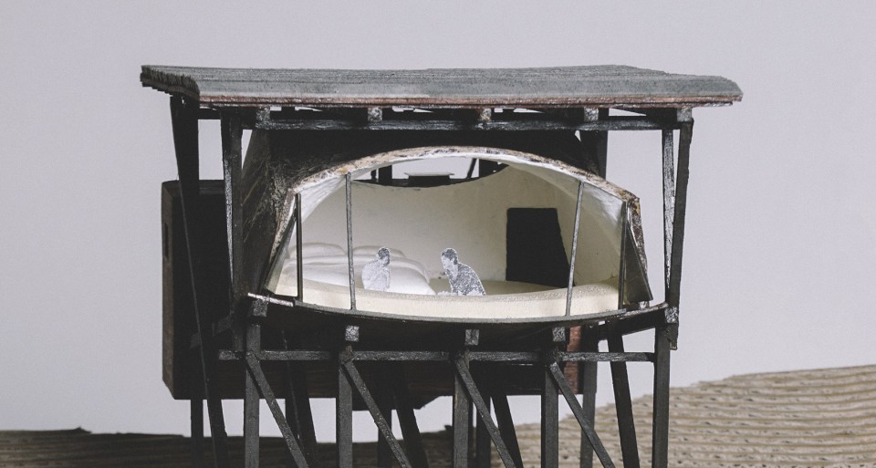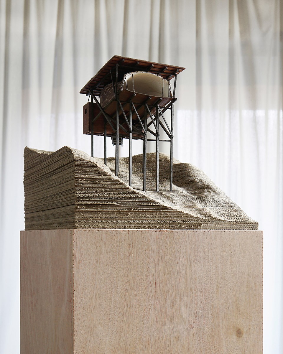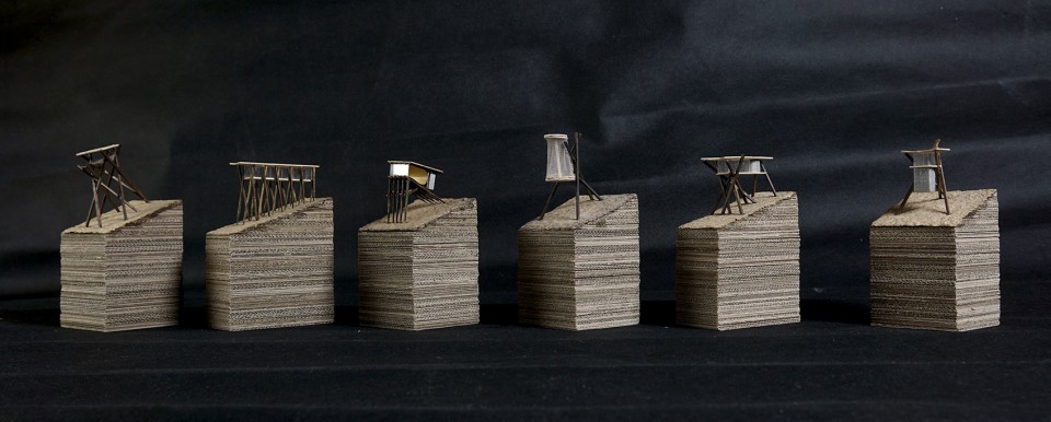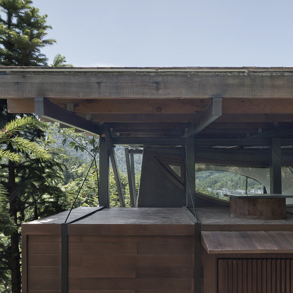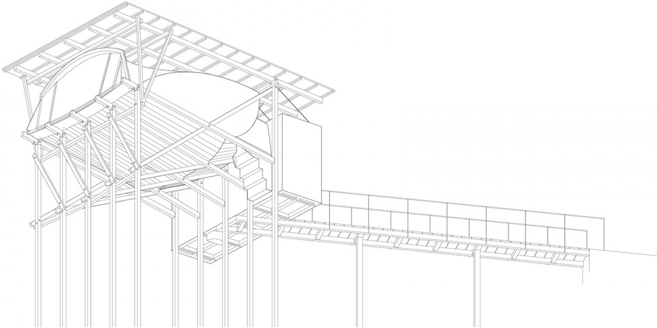 “介于物件和房子之间”——围绕着这个主题,我们在设计之初试探着各种思路。记忆总在不经意间发挥着作用,一个原始的瞭望塔出现在脑海中,它来自宫崎骏的《幽灵公主》,三根巨大的原木,脚部稳稳地扎在地上,向上逐渐收拢,在半腰处交汇并捆扎固定,上部再度叉开,其间架起三角形的瞭望平台,再往上,覆盖着大上一圈的茅草屋顶,所有的要素都处于最基本的状态,简单直白。这些意象为何彼此牵连?不论是马扎还是瞭望塔,都是由二元的形态构成,下部的支撑是受力的逻辑,上部的形态则是人体使用的要求,但是这两者并不是简单地并置,而是彼此调适的,马扎的坐面既是屁股的需要,也是结构的一部分,瞭望塔的平台和屋顶也必须是三角形,否则就要大动干戈。卒姆托在挪威的女巫纪念物,木架的列队拉扯起一个长长的帐篷,金属的落脚将其带离潮汐。再看看生活中的其他东西,雨伞、帆船、悬索桥、风筝,很多东西都是这样结合起来的,我们看到这样的东西时,总能在其中感到某种——弹性?或许这种印象来源于我们自己的骨骼和肌肉,亦或是花草树木。