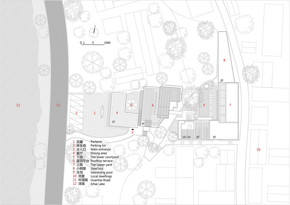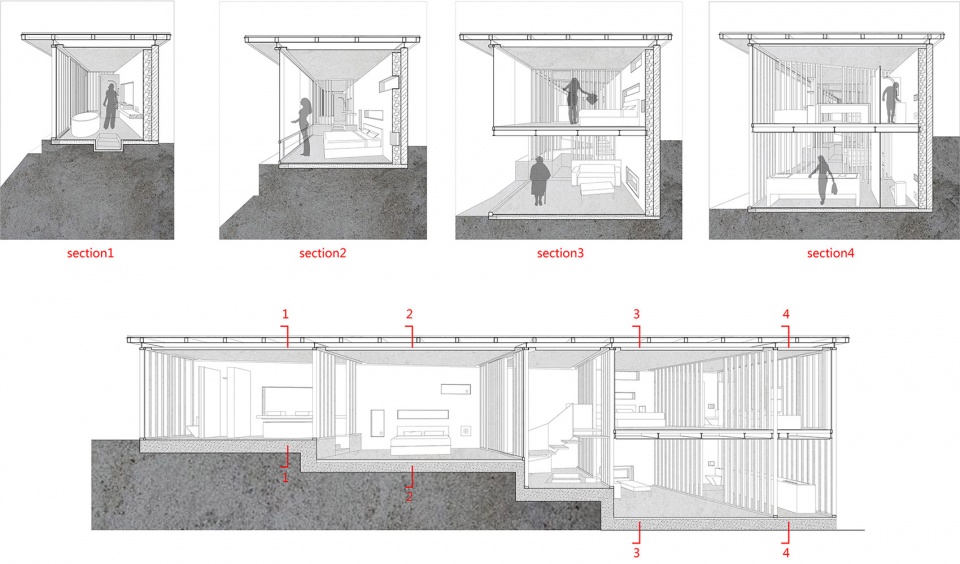 针对用地面积较小且不规则的现实条件,建筑师决定将两个客房空间的墙面处理成斜线,呈“八字型”,以使客房空间面对洱海获得更为宽阔的景观面,而被这两个客房空间“切割”剩下的三个“倒梯形”空间则成为了卫生间、厨房及公共楼梯等。这个划分方式再结合对缓坡地形的分台及错层处理,产生了路易·康(Louis I.Kahn)所说的“服伺与被服伺空间体系”:作为“服伺空间”的交通体、厨房、卫生间等;作为“被服伺空间”的客房、公共客厅等。