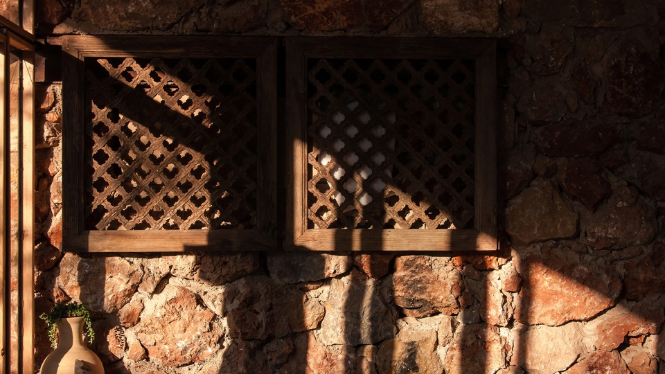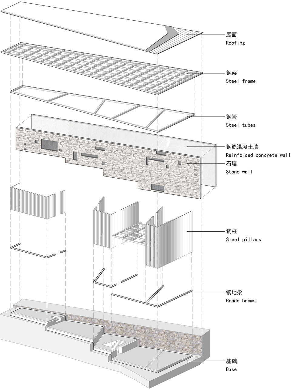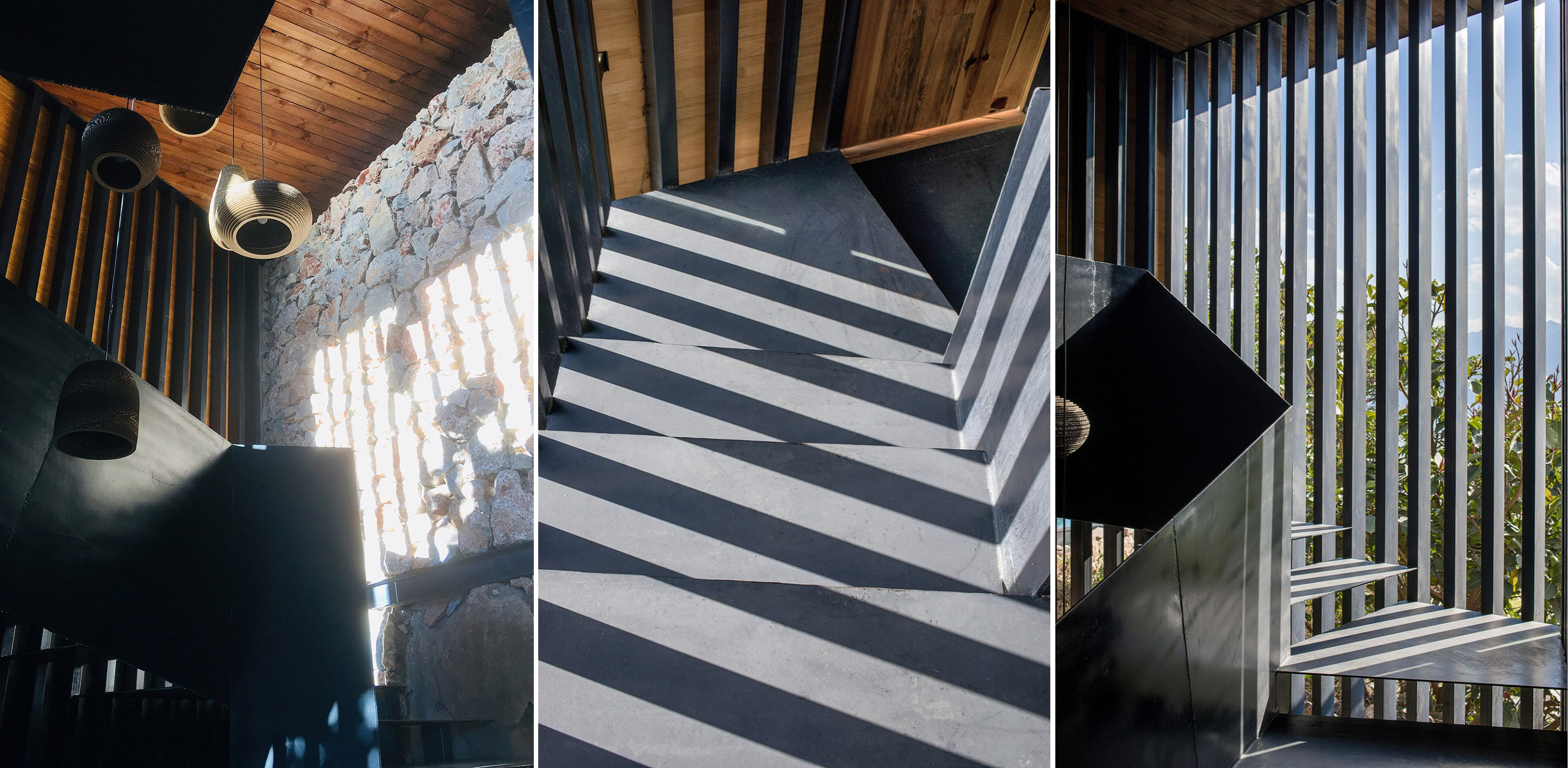 在空间秩序确定之后,建筑师希望结构秩序与空间秩序是一体的,三个“服伺空间”成为了结构支撑筒,考虑到结构体系经济性以及施工便捷度,结构设计采用了由小尺寸矩形钢管排列形成的“钢格栅筒体”作为主体支撑结构,由于矩形钢管格栅之间留有较大的缝隙,光可以投射进来,所以该结构形式上与传统的“筒体”不一样,而更像是“光筛”,客人在钢结构的“光筛”里行进的时候,能够感受到与自然的互动,特别是傍晚时分,西晒阳光透过钢格栅缝隙将石砌墙面照亮的时候,建筑师将光影作为建筑材料的一种特殊形式运用于建筑空间中——“小钢屋”本质上是一次以体验自然为出发点的建造实验。
