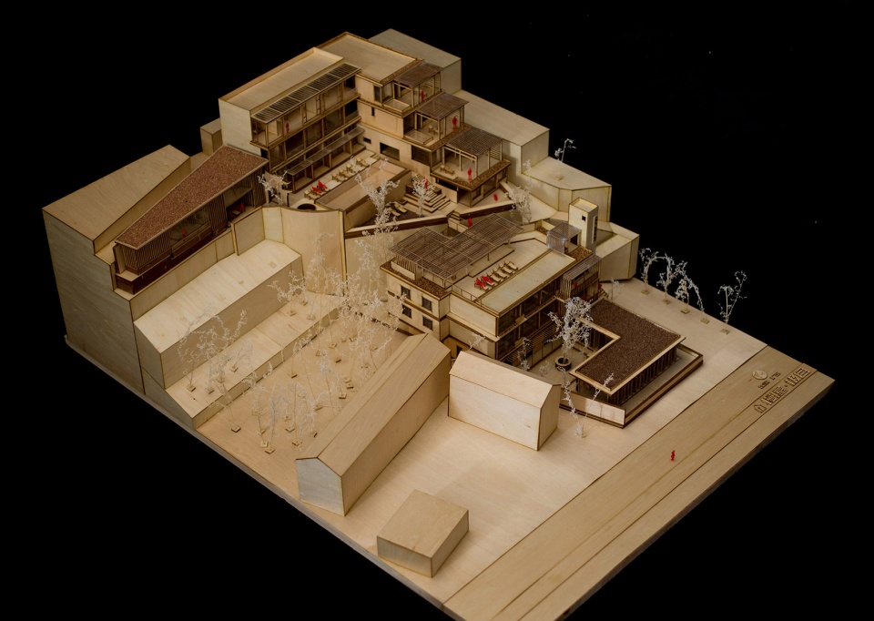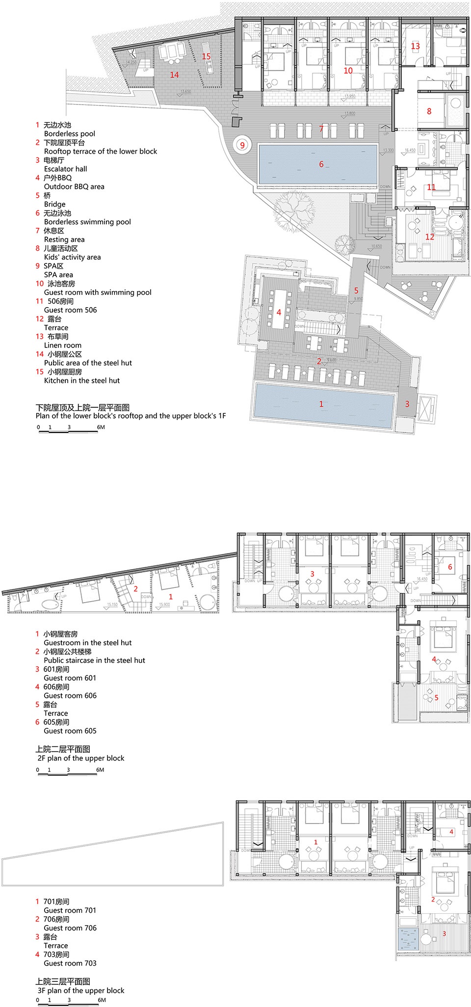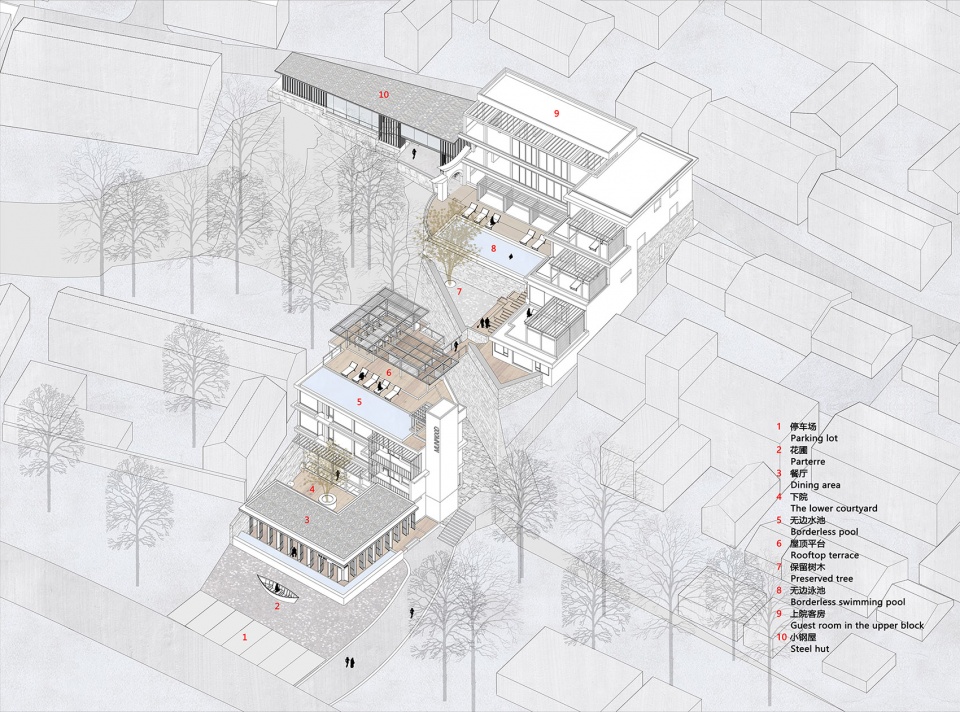 设计首先对上下院功能空间进行重新组织。下院的改造:在原有二层砖混结构农宅屋顶上加建第三层作为客房。同时在下院新建了一处呈L型的单层钢结构建筑与原有农宅围合成院落空间,置入了餐厅、接待功能。上院的改造:原有农宅为二层半的砖混结构,设计上以原有结构形式完成第三层,同时在其一侧加建三个带大露台的退台式客房空间,使其形态由一字型成为L型,使得上院空间形成以无边泳池为景观核心的半围合空间形态。在上院主体客房的北侧为新建的独立客房区,同样采用的钢结构的结构体系,简称“小钢屋”。建筑师在所有新建部分的建造方式上之所以选择钢结构,是希望更明确的表达新旧之间的空间关系以及建构层面上的区别,使其更有类型学上的差异和可识别性。