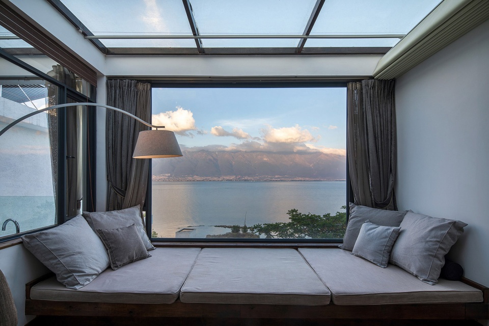 考虑到“慢屋·揽清”客人的体验是“清晨,卧于床榻可观洱海日出”,为了客人获得不同的体验,“慢屋·极目”的选址关键词自然地选定为“日落”:选址位于海东镇的文笔村,此处依山傍水,对岸正对着苍山、古城与三塔,这里是整个洱海环线上可以饱览“苍洱全景”的最佳位置,项目取名为“极目”,以场地视线极佳,适合“极目远望”而得,英文名 “Panorama” 更暗合了“苍洱全景”的画面感。