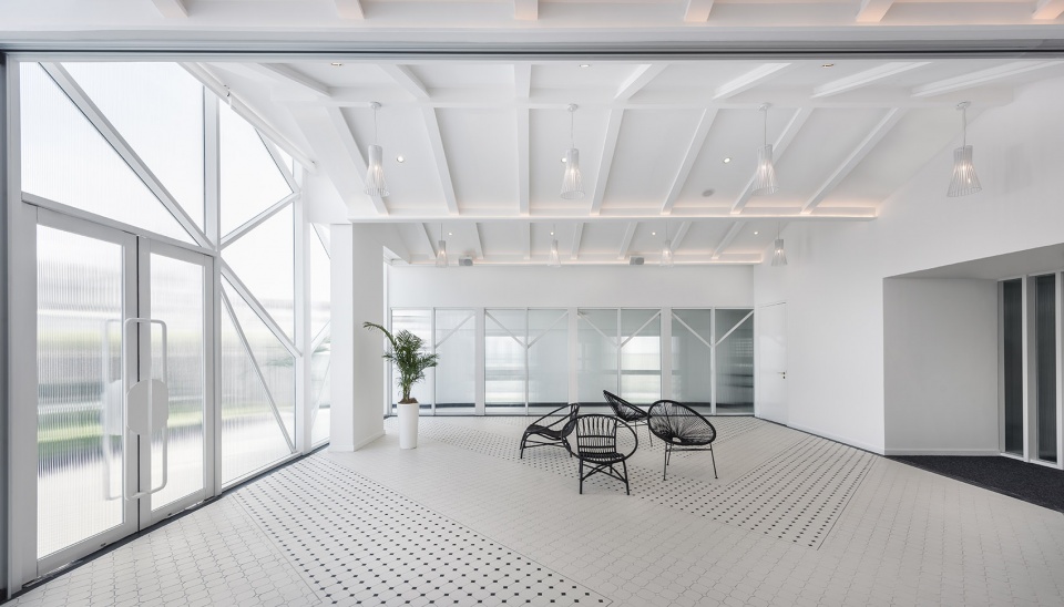 ▼接待区、玻璃屋餐厅和商店空间通过黑白相间的地面图案被统一起来