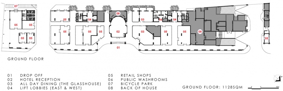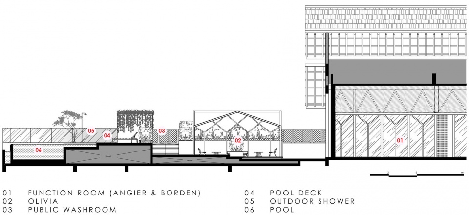 多功能厅以槽纹玻璃围合,在维持光线渗透的同时保证了室内的隐私。无边界的屋顶泳池为欣赏落日提供了绝佳的地点,人们可以一边享用鸡尾酒,一边俯瞰教堂街码头和水面的风景。屋顶的界墙被抬升以保证私密性,同时为在平台上晒日光浴和在凉亭休闲室饮酒的客人们提供了遮蔽。