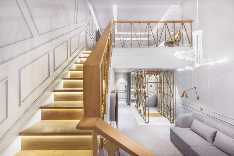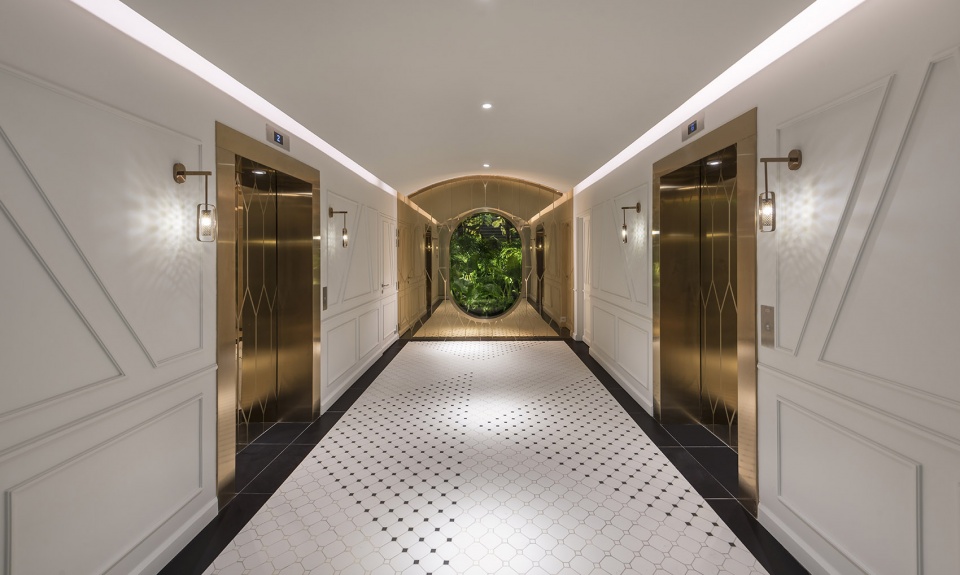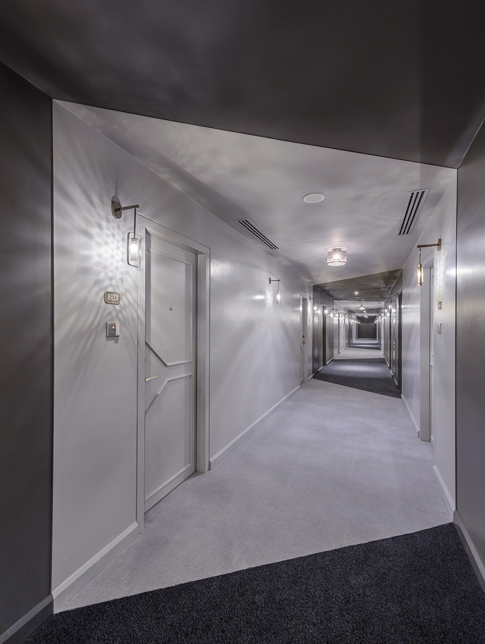 设计师沿着客房走廊使用了明暗交替的配色方案,打破了通常走廊体验的单调感觉。机械化的灯具以规则的间隔放置,在墙面上投下格子状的精致光影,为客人的行走体验赋予动态。