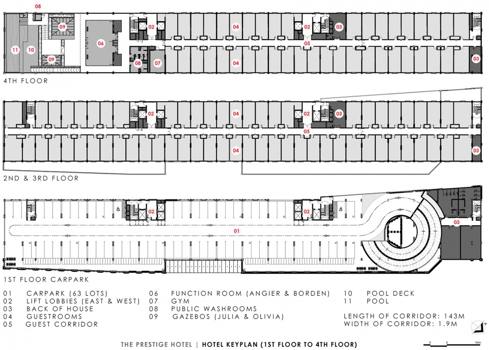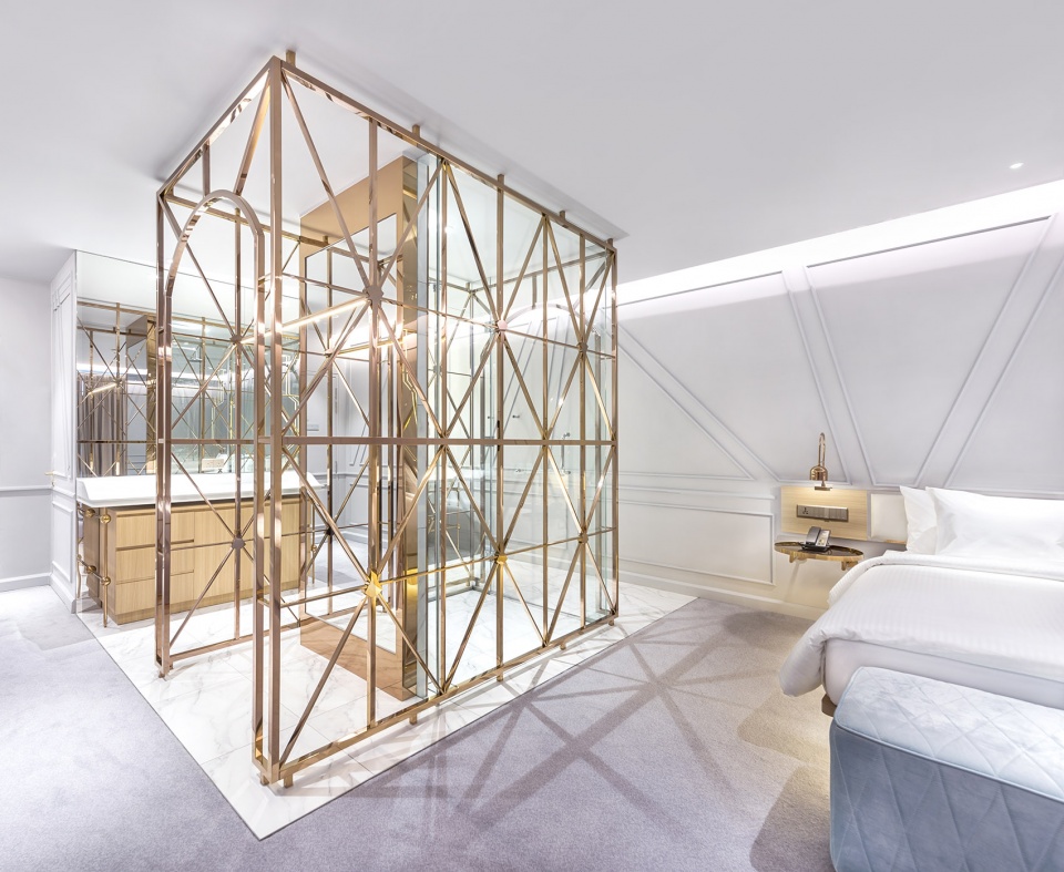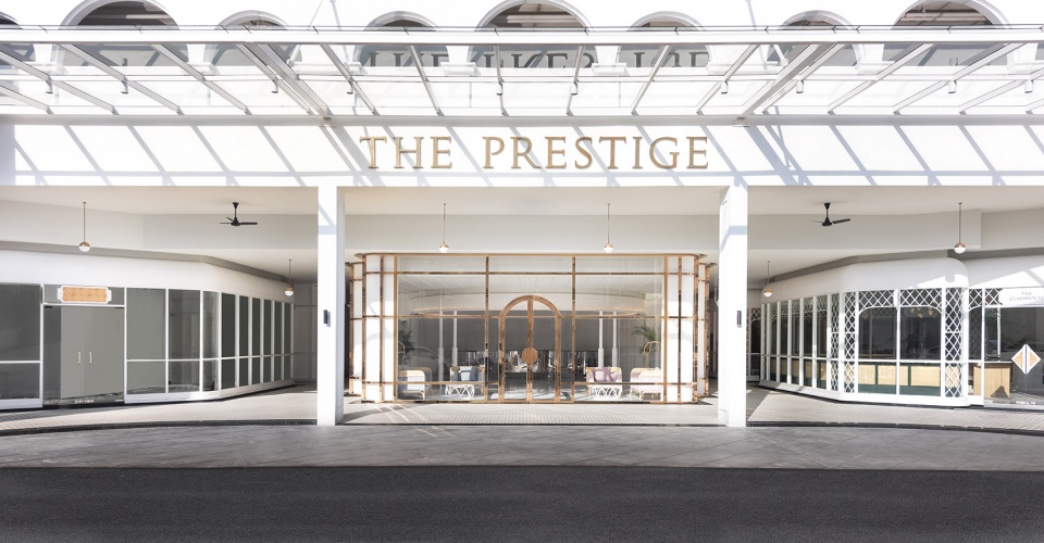 酒店名称“The Prestige”旨在彰显优雅且精致的品牌形象,同时受到了同名电影《致命魔术》的启发,将维多利亚时期的风格与幻觉艺术进行了结合。浮现、消失和漂浮等错视元素被巧妙地引入整个酒店空间,并体现在一系列室内细节上,例如与传统建筑相呼应的地面图案、看似由球体支撑的定制接待台,以及客房中隐藏的暗门等等。在首层的落客区,接待区、玻璃屋餐厅和商店空间通过黑白相间的地面图案被统一起来,看上去像是在眼前消失又浮现。