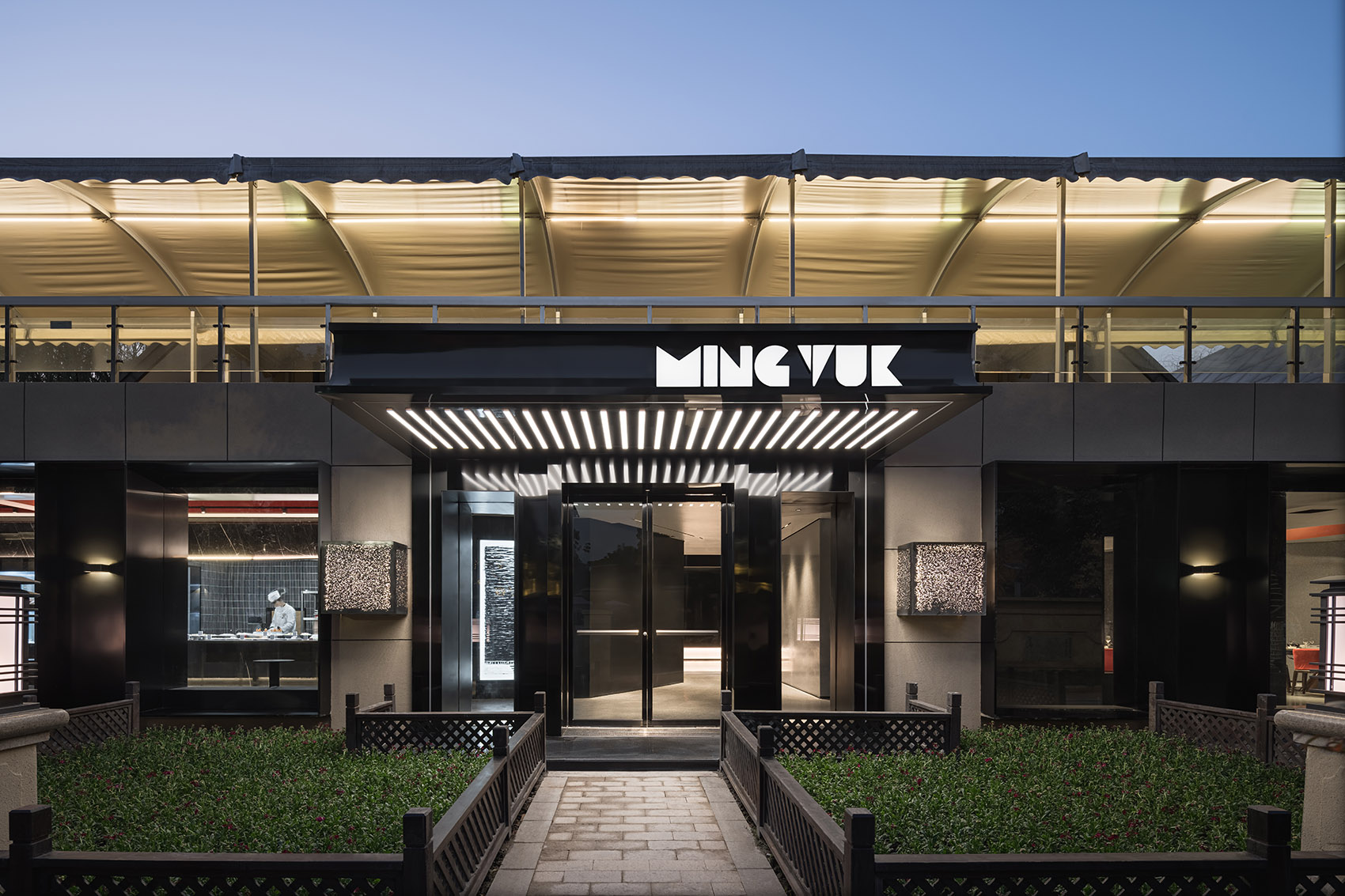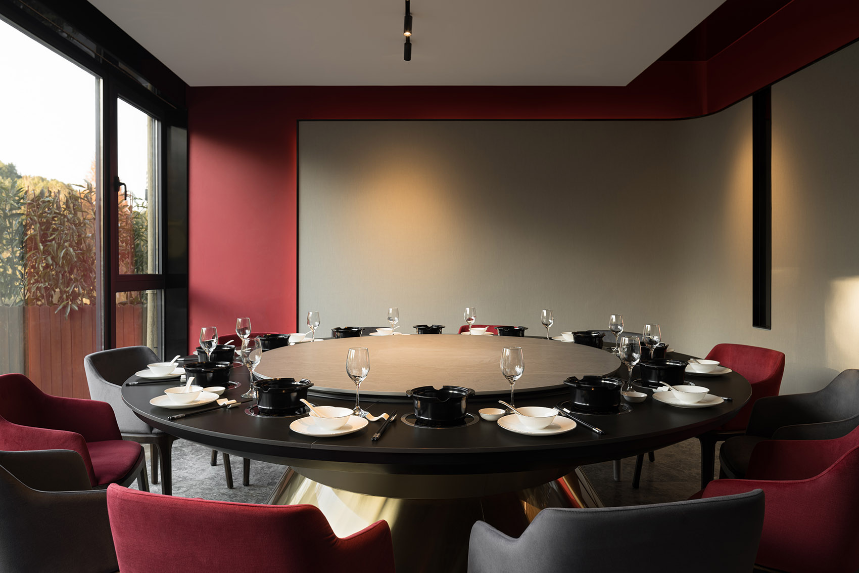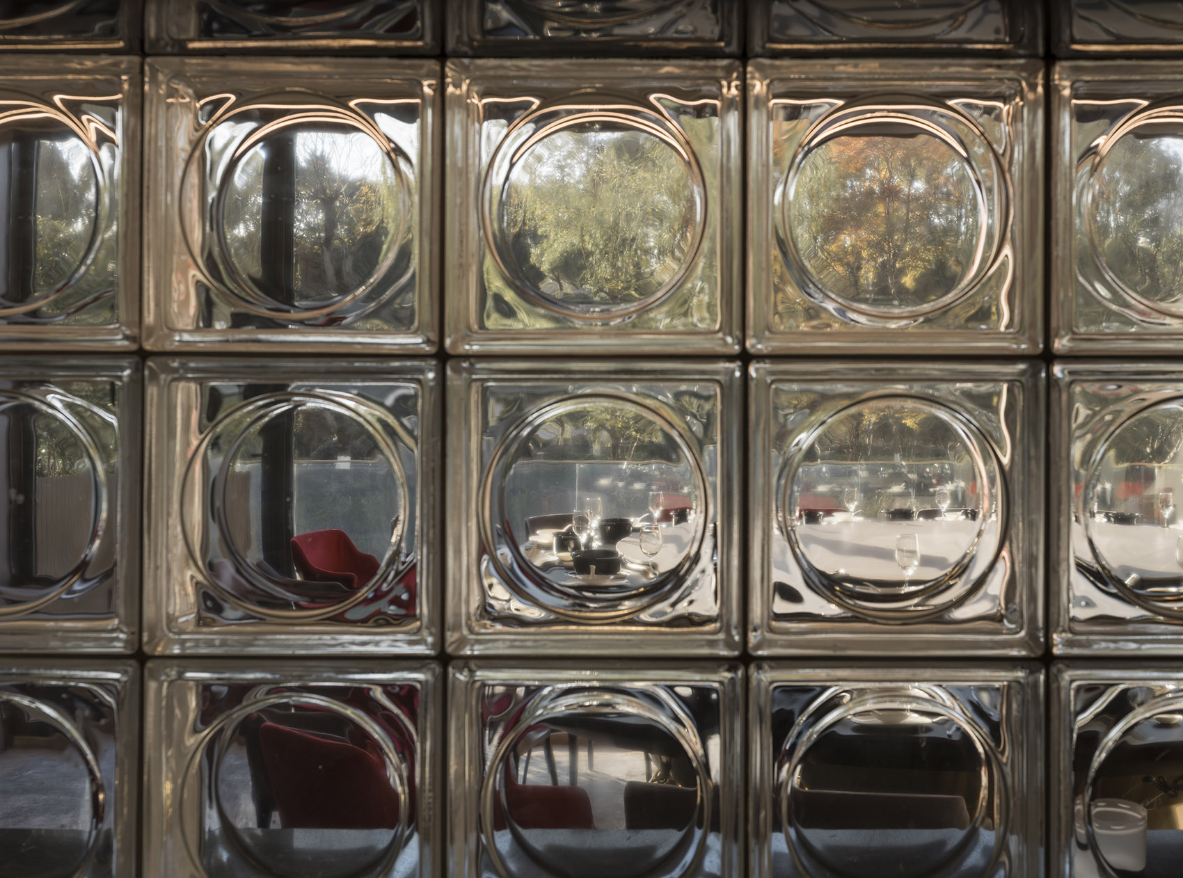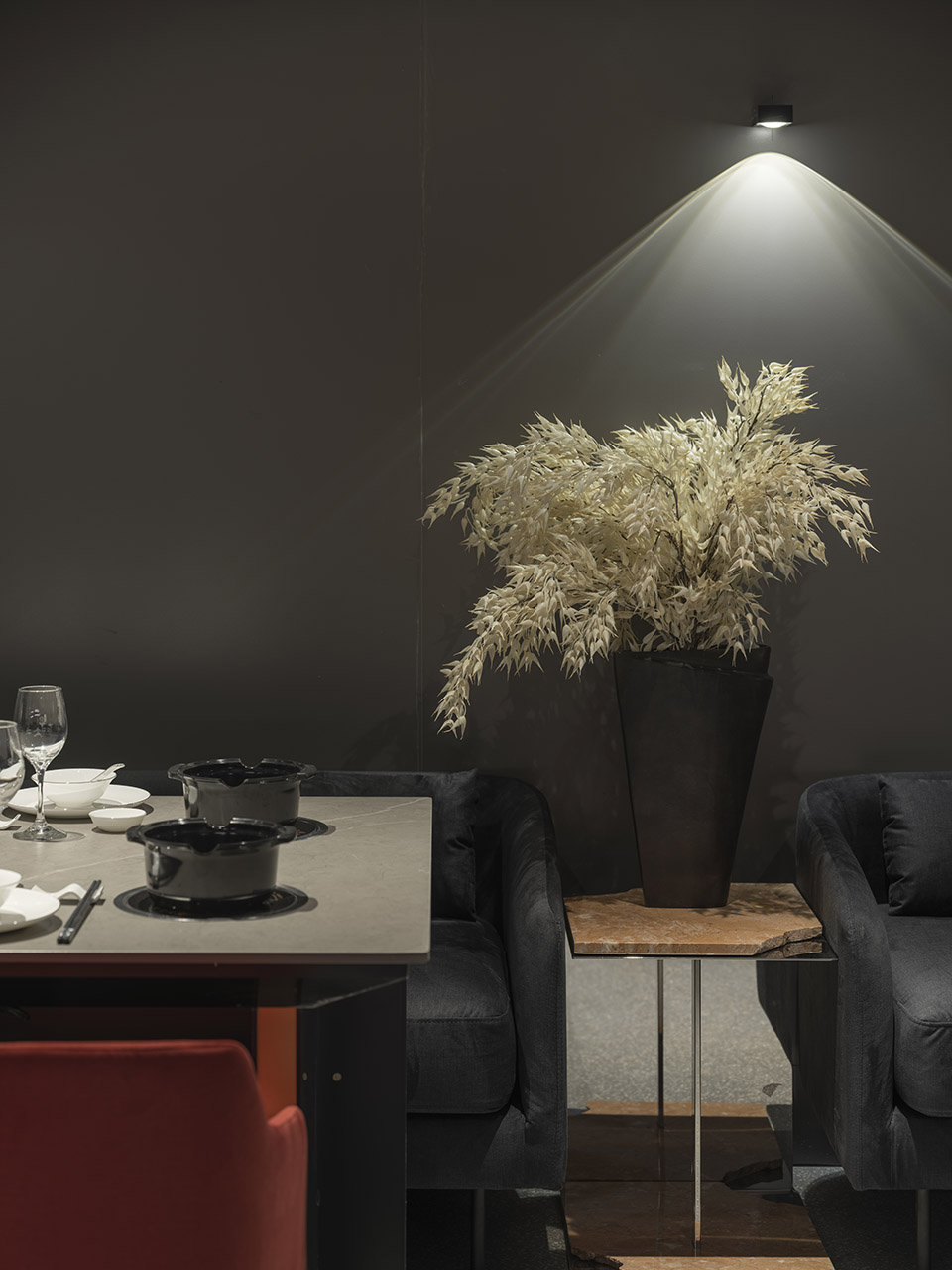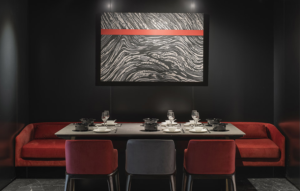 空间的感受,除了围合,设计上对光线和视线进行控制。空间中加入的黑钢的行政通道,故意遮蔽掉了一些自然光线,希望通过暗色的调性来烘托空间的氛围;而包厢外原本幽暗的走道,则选用了玻璃砖,让户外的景观和光线穿过包厢,隐约的穿透进来。