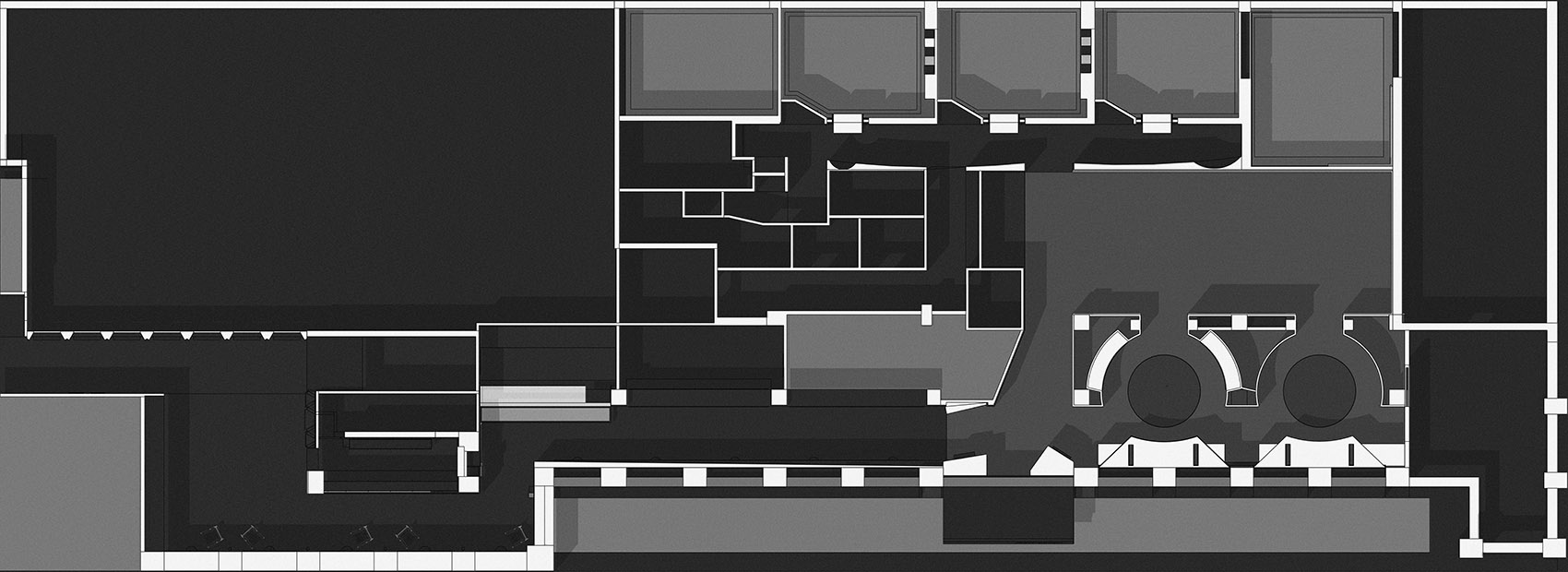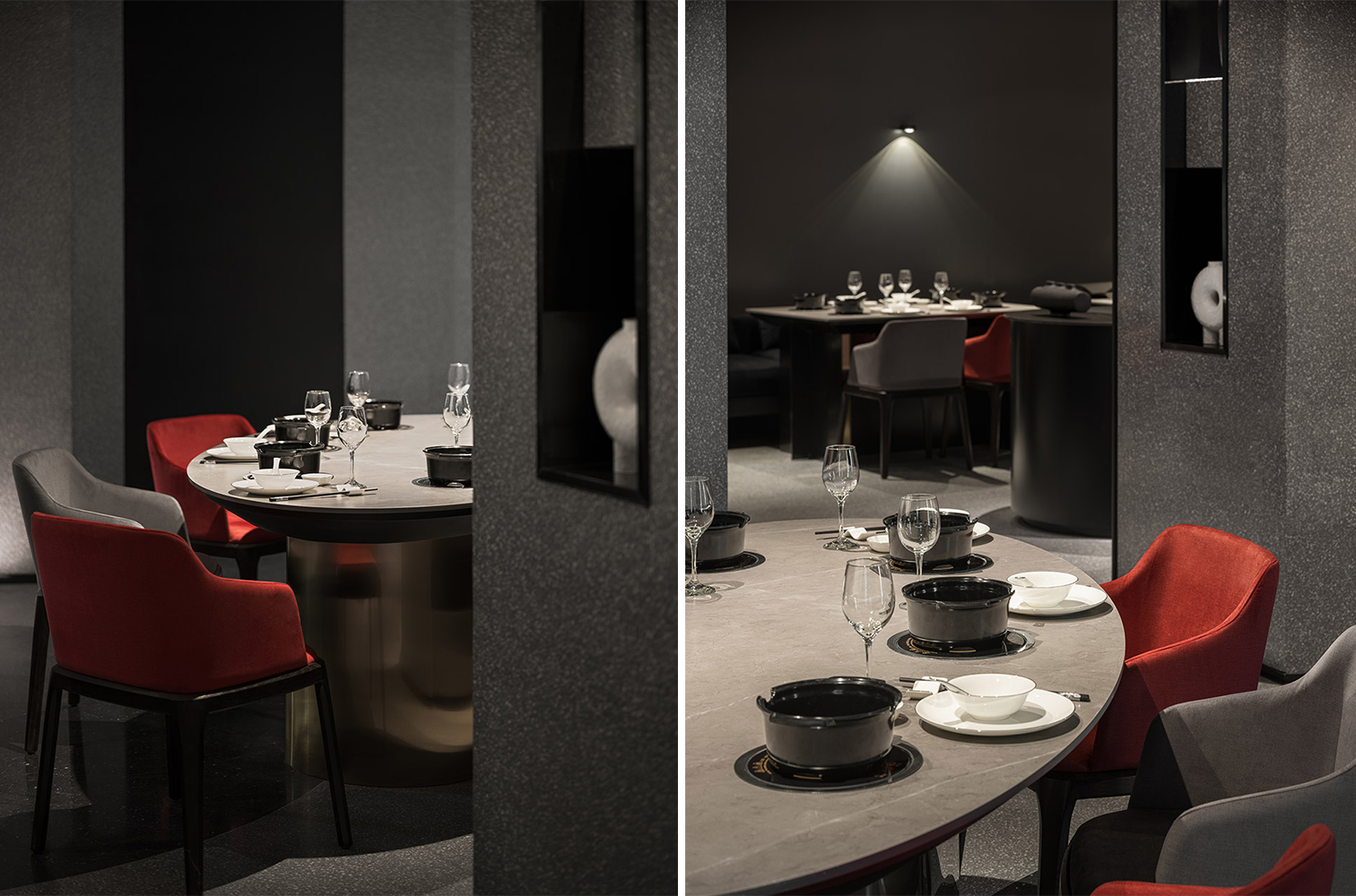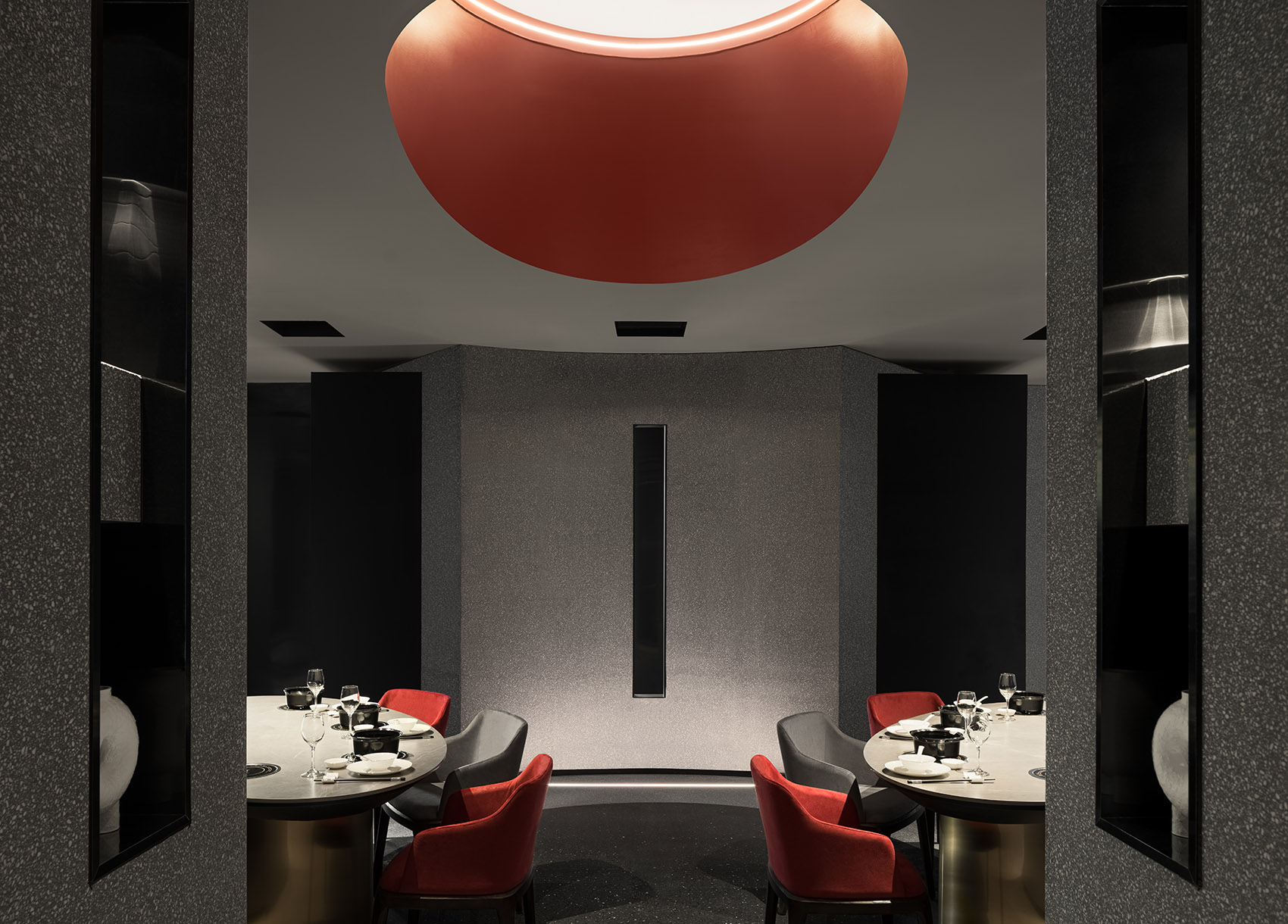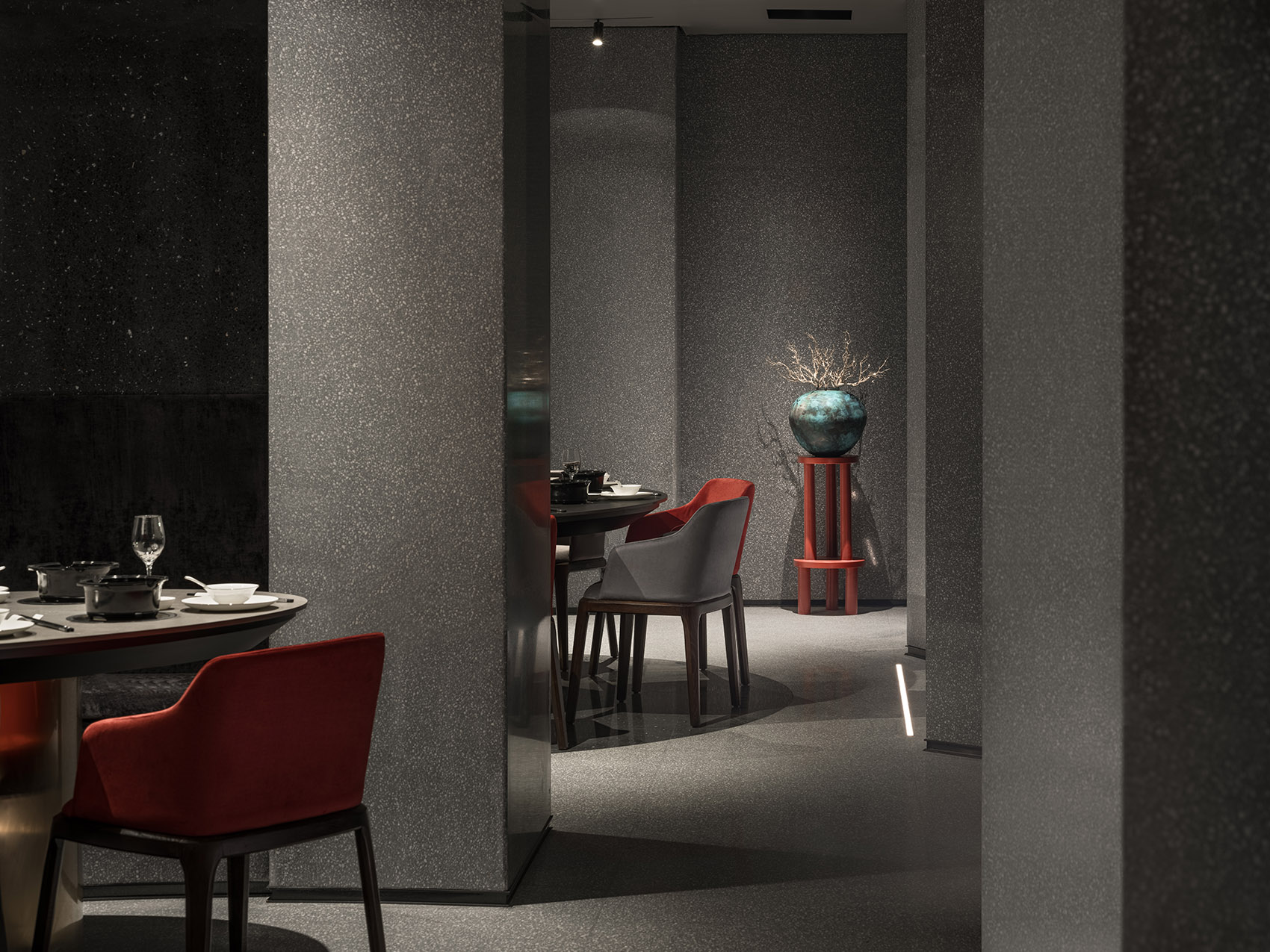 在满足业主的需求下,通过纤薄的黑色钢板结构制造出多一层的交通空间,提供餐厅独立的行政动线。钢板上开出的洞口,增加韵律感。行政通道和规则的长方形用餐大厅之间,置入两个类似圆形的空间区域,表皮均为灰色的水磨石,弧形墙面阳角在不规则角度的情况下显得纤细,和本身石材的厚重感形成对比。
