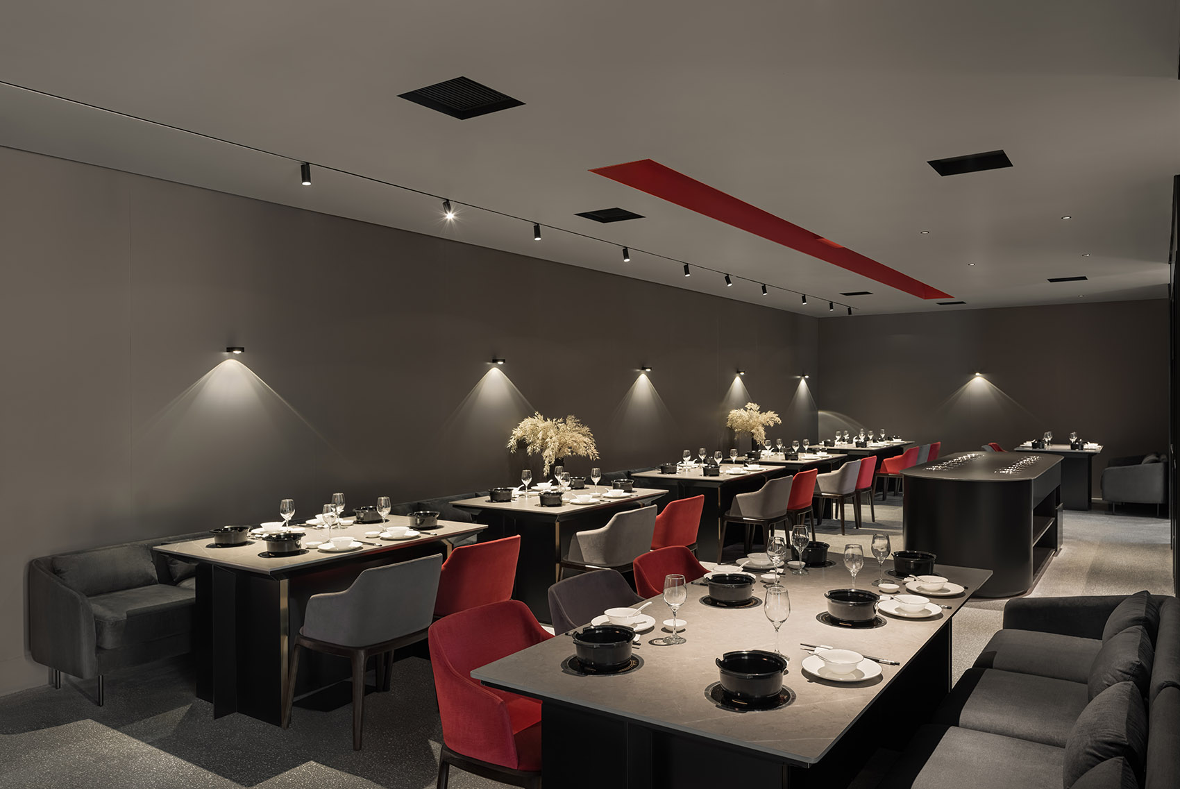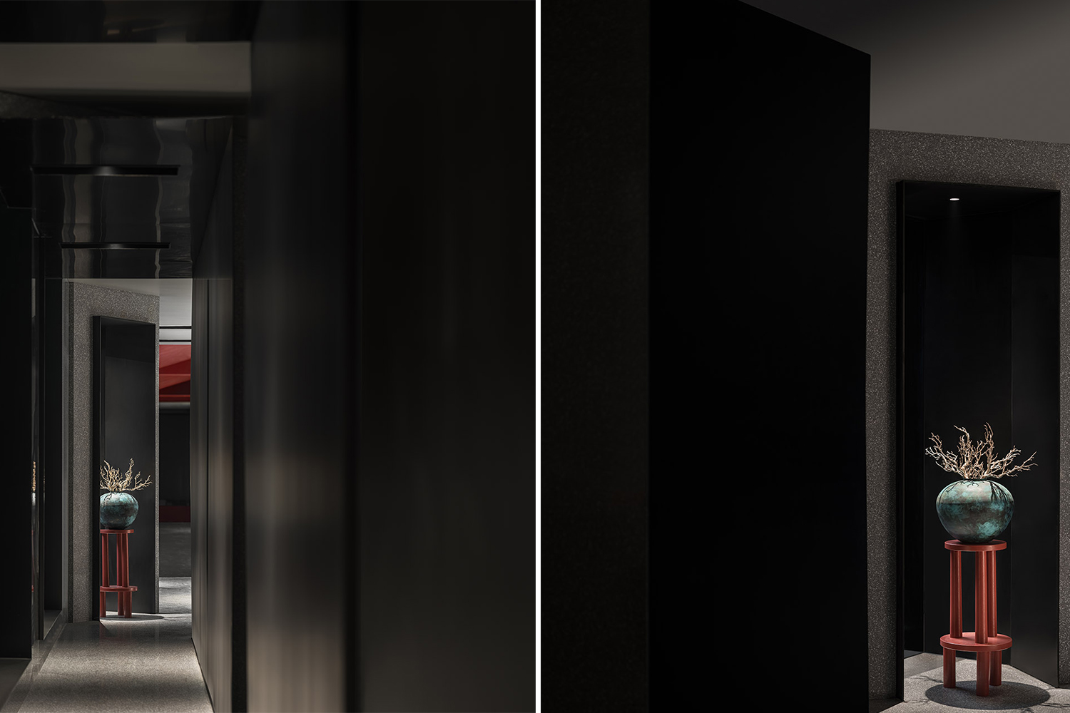 通过用餐大厅,包厢过道由一面不规则弧形墙和备餐台面的体块所组成,包厢入口故意内退一些,留出缓冲的空间,空间的节奏也由此产生。