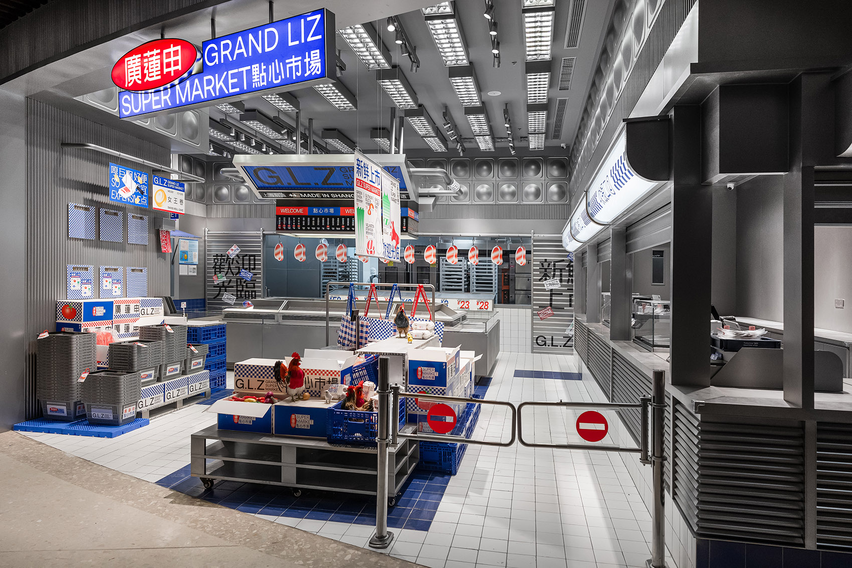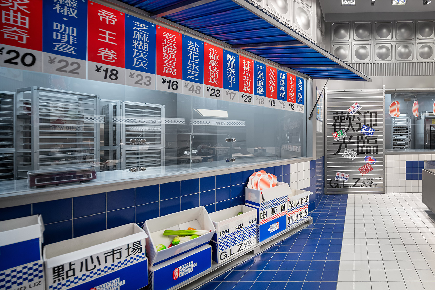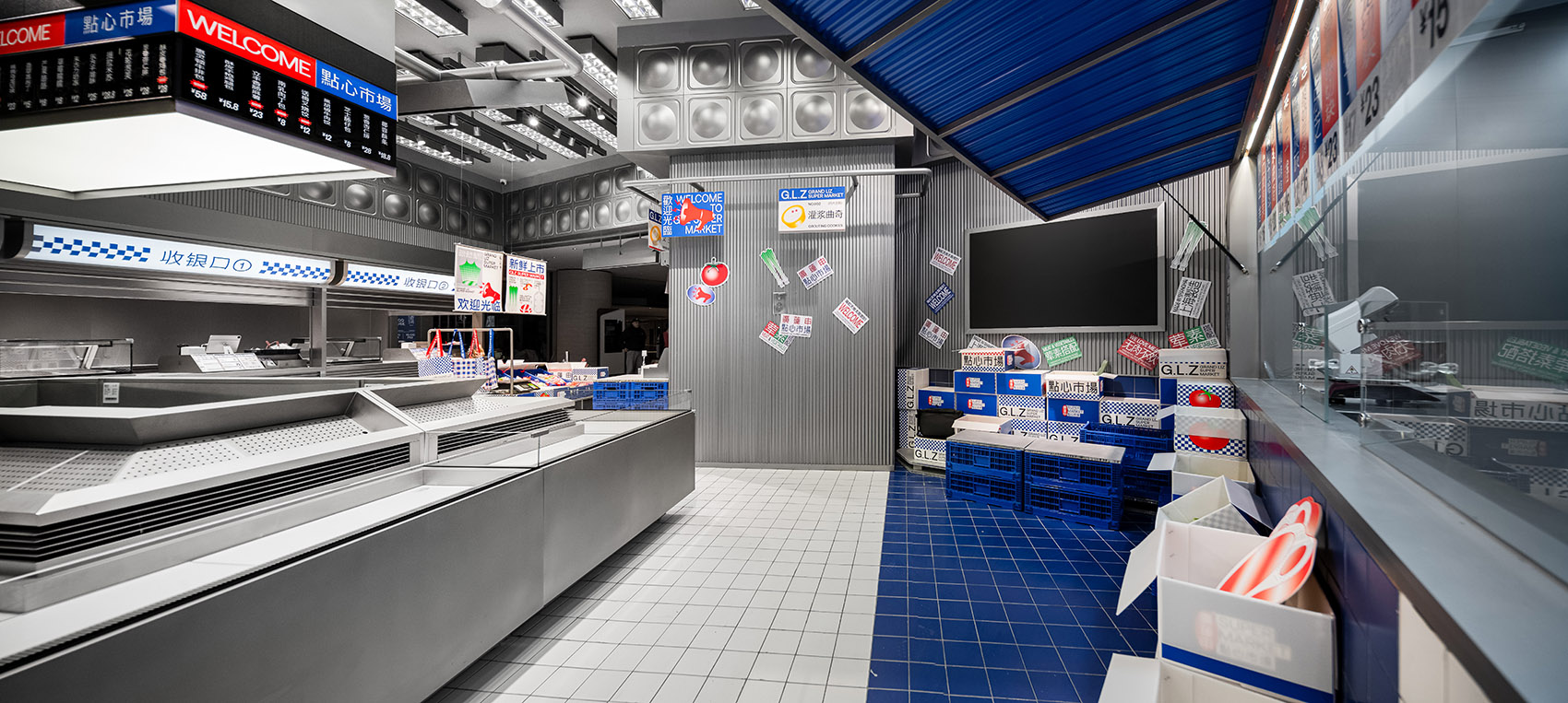 点心市集是廣莲申第一个主题店,我们将产品的销售与生产都贯穿到市集的场所氛围中,空间材料与颜色,也从市场中最有代表性的元素中提取——金属波浪板、白色小瓷砖、塑料感的蓝红配色、随处张贴的“牛皮癣”小广告、堆积如山的货物,凌乱却充满着民间智慧…这一切的细节都在给你“还原”一个市场该有的样子,但又是一个通过巧妙设计和重组升华后的“日常市场场景”,我们希望呈现给消费者的是一个年轻、时尚、有话题性、有分享欲望的新零售空间。市集中的摊主们总会灵活运用手边任何的物件给自己打造一个舒适的休息角落,比如用两个篮筐堆砌起来,再放上一块木板,就是一个小板凳——座位区。