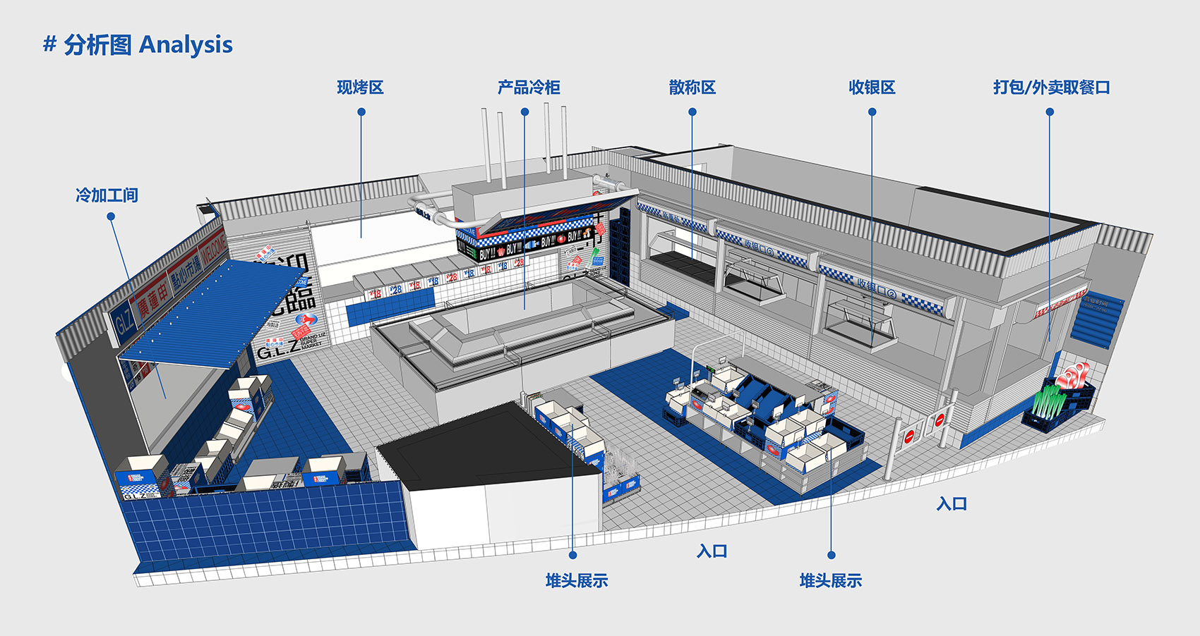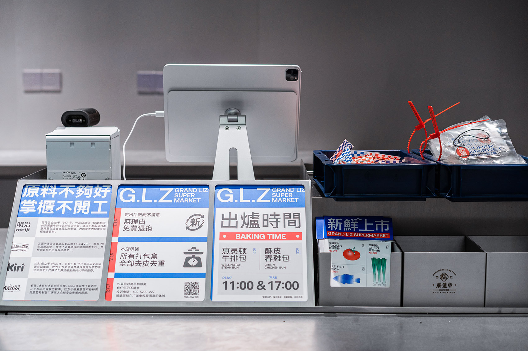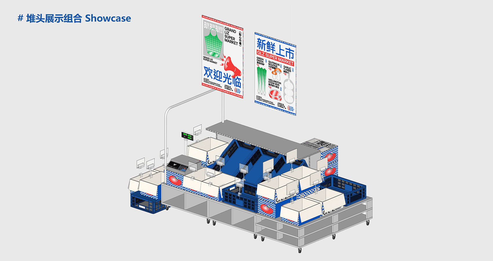点心市集是廣莲申第一个主题店,我们将产品的销售与生产都贯穿到市集的场所氛围中,空间材料与颜色,也从市场中最有代表性的元素中提取——金属波浪板、白色小瓷砖、塑料感的蓝红配色、随处张贴的“牛皮癣”小广告、堆积如山的货物,凌乱却充满着民间智慧…这一切的细节都在给你“还原”一个市场该有的样子,但又是一个通过巧妙设计和重组升华后的“日常市场场景”,我们希望呈现给消费者的是一个年轻、时尚、有话题性、有分享欲望的新零售空间。市集中的摊主们总会灵活运用手边任何的物件给自己打造一个舒适的休息角落,比如用两个篮筐堆砌起来,再放上一块木板,就是一个小板凳——座位区。