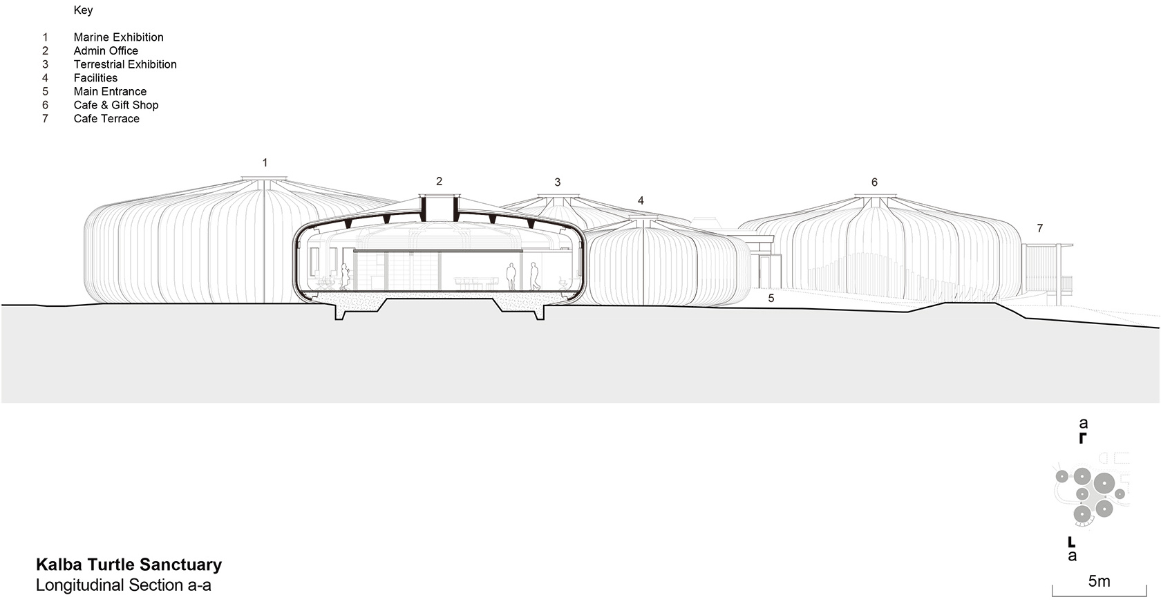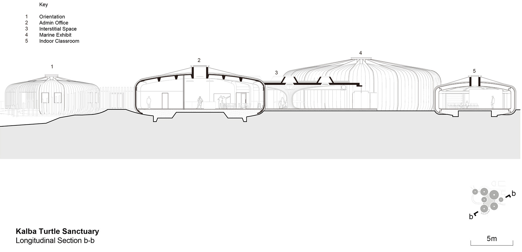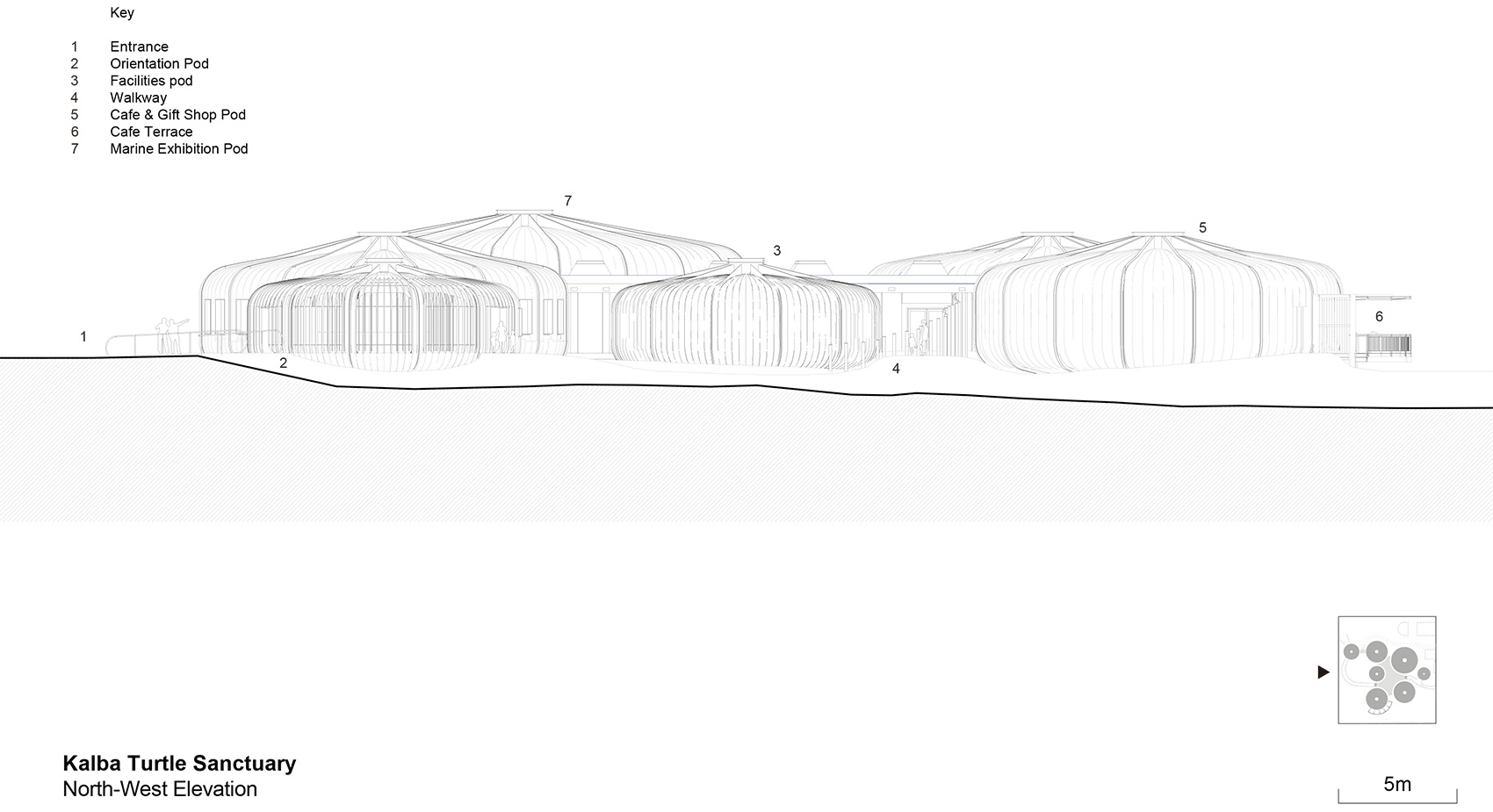 舱体的几何形状受到了海胆外骨骼的启发,并有意地与Buhais地质博物馆的轮廓形成对应。舱体被设计为预制混凝土结构,简单而坚固的底盘被抬升于潮汐地点,以最大限度地减少对既有地形的破坏。