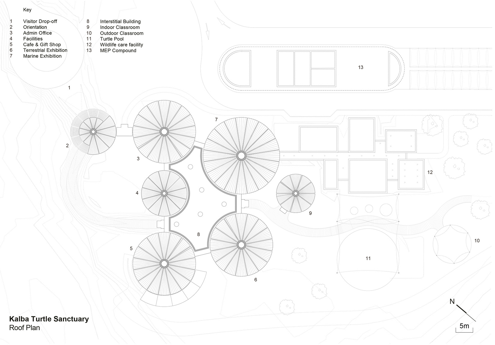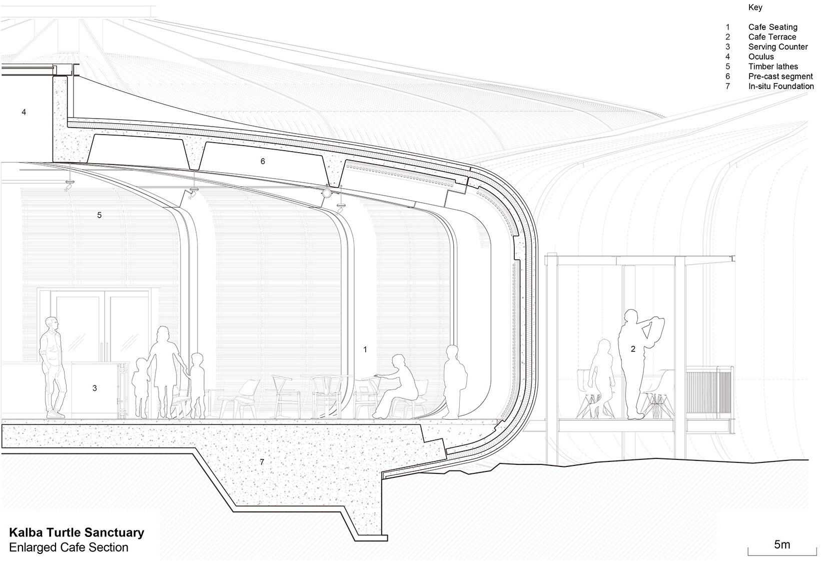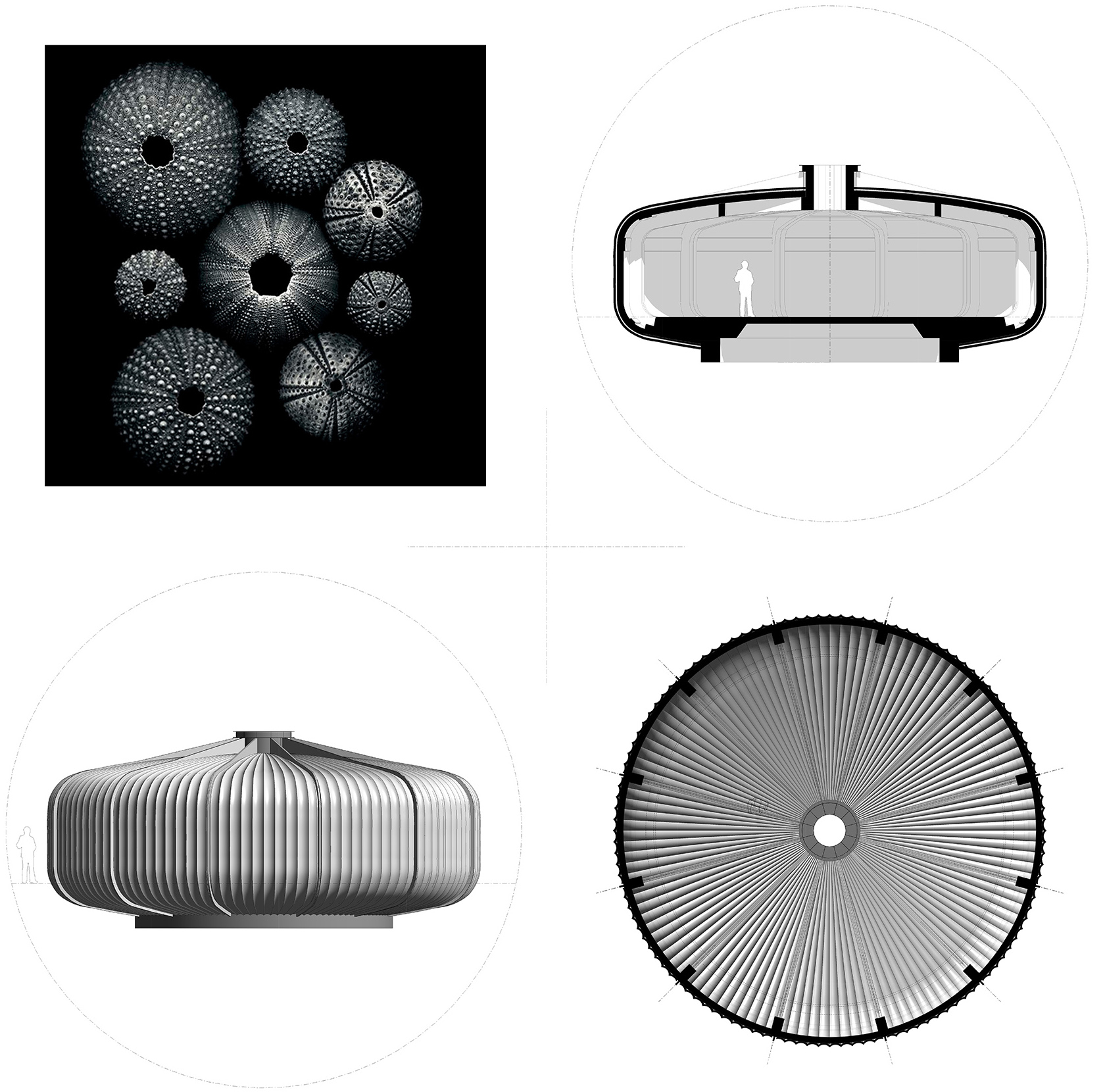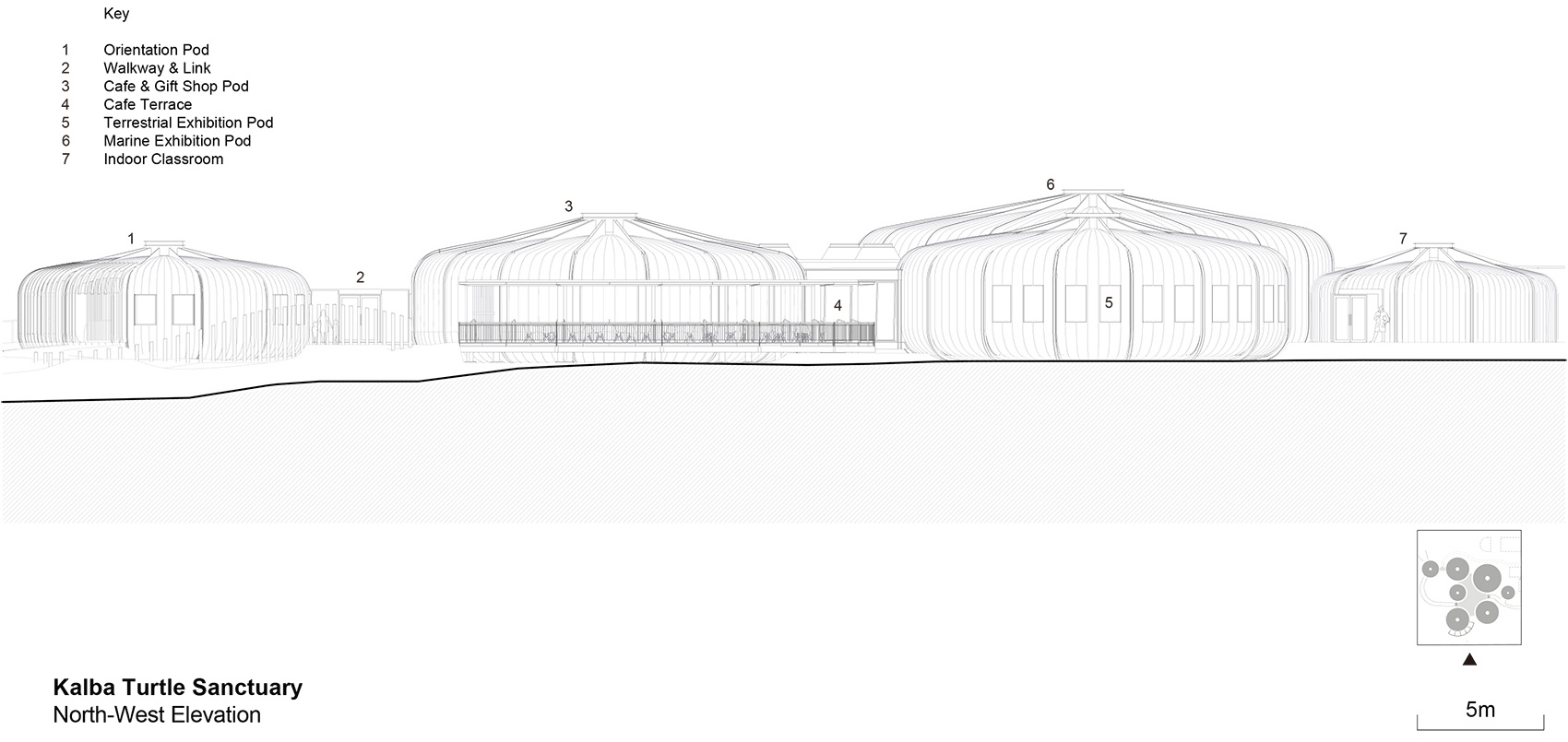 舱体的几何形状受到了海胆外骨骼的启发,并有意地与Buhais地质博物馆的轮廓形成对应。舱体被设计为预制混凝土结构,简单而坚固的底盘被抬升于潮汐地点,以最大限度地减少对既有地形的破坏。