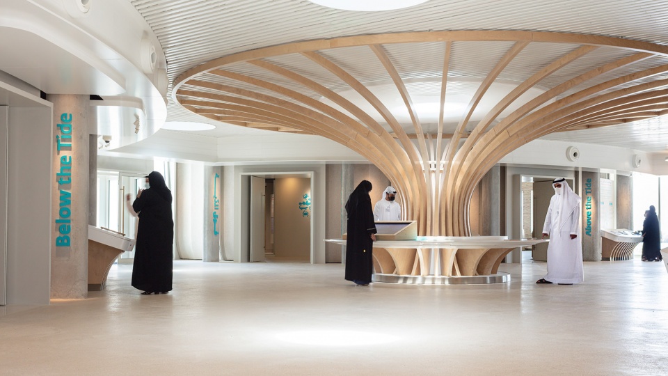 Hopkins Architects负责人Simon Fraser表示:“在这样一处场地上做设计是一次极为难得的机会,我们为Buhais地质博物馆设计的开创性圆形建筑形式也同样非常适合这一丰富的生态环境,这主要取决于它们能够轻盈地与地面相触碰。我们用当地废弃贝壳制成的柔软的扇形预制覆层对该原型进行了改造,使其与海洋环境相呼应,呈现出更加柔美、与周围环境更加协调的外观。”