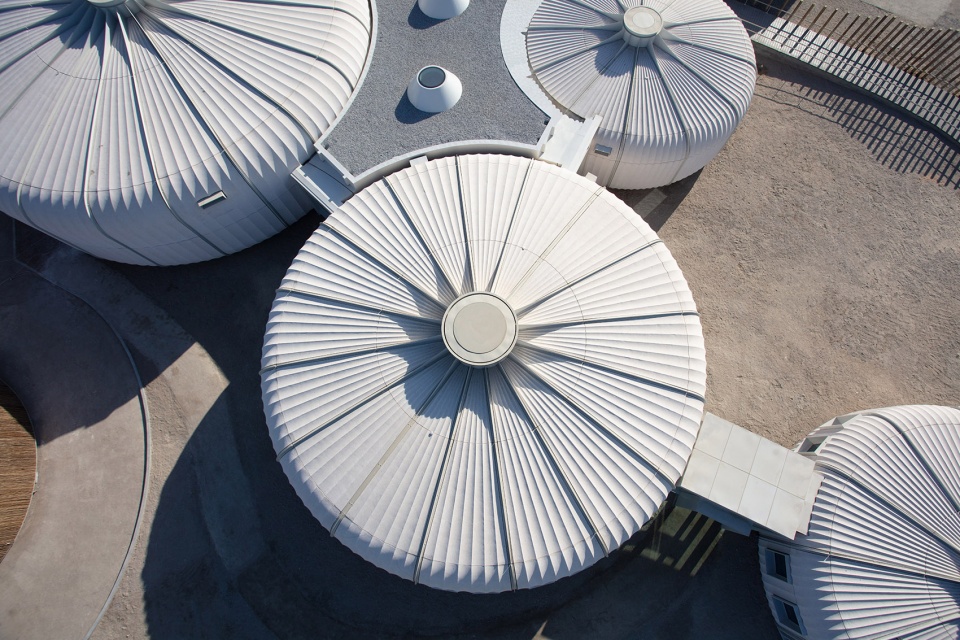 ▼舱体外部以白色的扇形预制混凝土单元包覆,呼应了来自当地海岸的贝壳