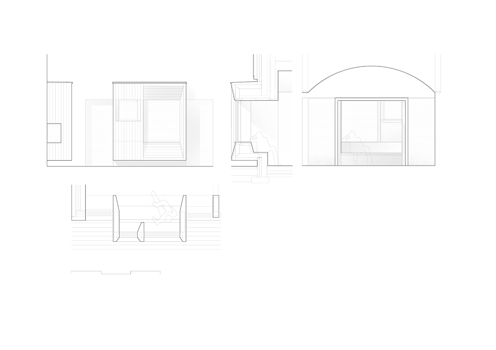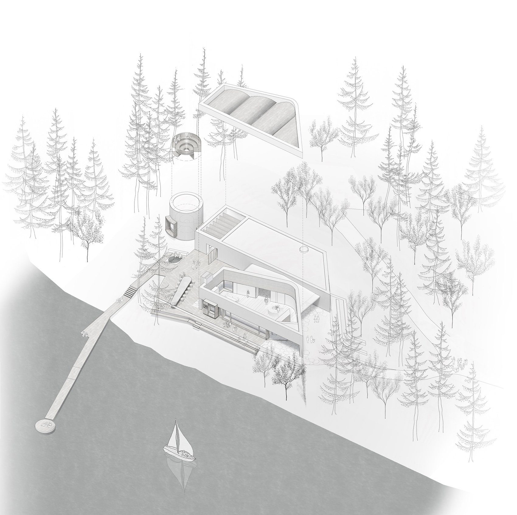 艺术桑拿的体验起始于它的建造方法。在环绕博物馆的公园南区、道路靠近水面的位置,一条被谨慎置入的分岔路将游客悄悄带往一个半私密的空间,在这里他们将遇见一处姿态低调的迎宾门廊,作为连接后方空间的过渡地带。整条路线贯穿室内和室外空间,沉浸于芬兰独特的风景之中。新建筑作为一处庇护所,为一系列专为本项目创作的艺术作品创造了背景,同时也“框选”出多处精彩壮观的视野。