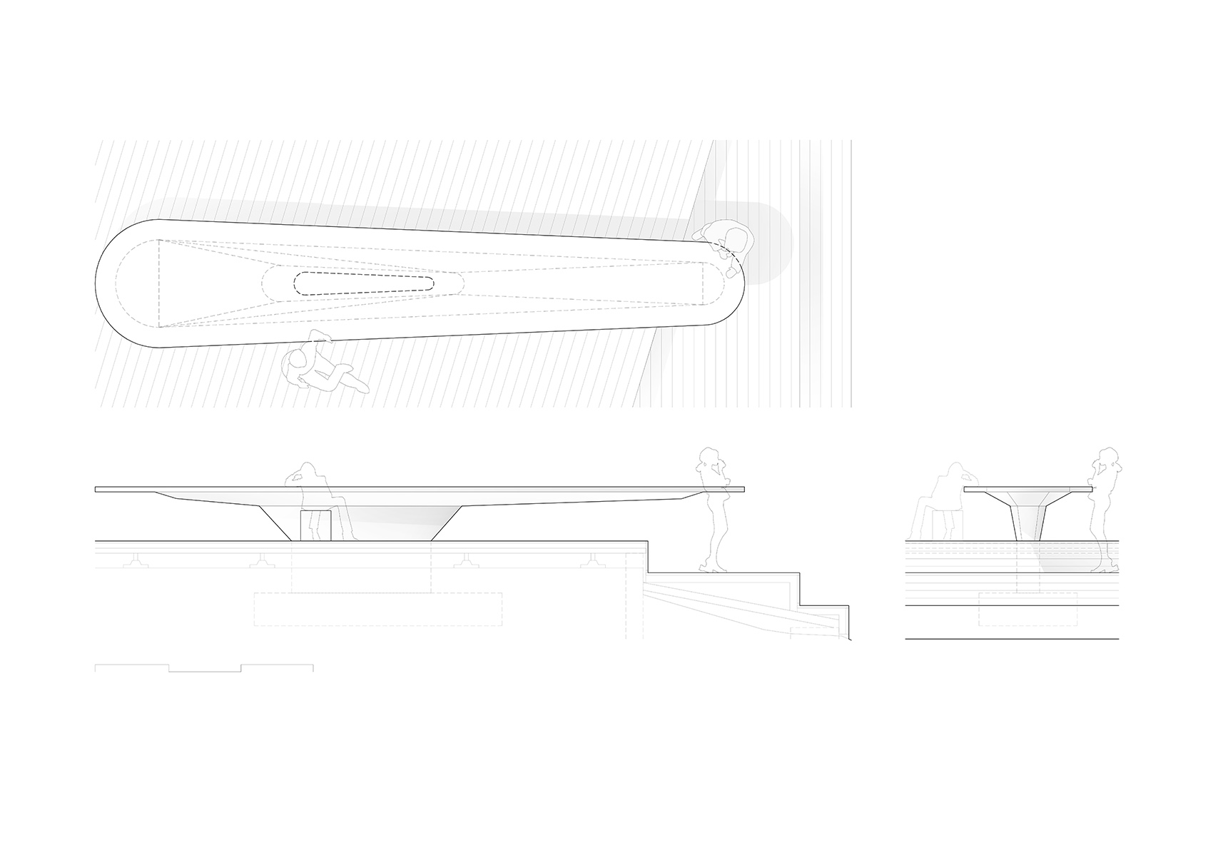 建筑外部设有一个宽阔的露台,其三面环绕着建筑或自然环境,并完全向湖面敞开。在这里,Candela桌子成为了视觉的焦点。这件作品是为纪念西班牙建筑师Félix Candela而特别设计,他以优雅的方式将几何学与静力学结合在空间结构中,并将其支撑在一个中心点上。Candela桌子采用了与建筑外墙覆盖物相同的材料,在表面的处理上,预制混凝土以抽象的方式增强了建筑几何的简洁性。
