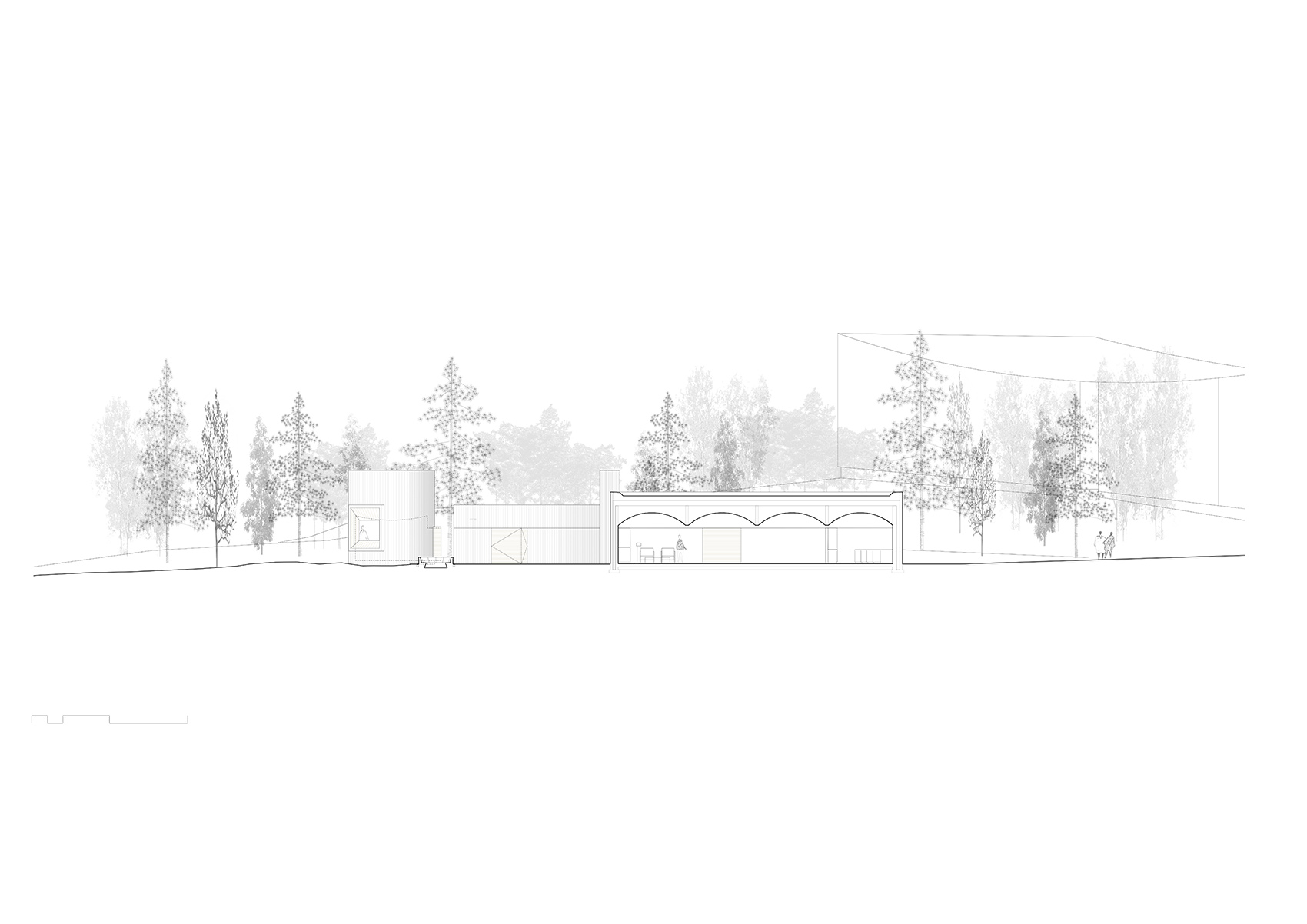 Mendoza Partida事务所和BAX工作室在2011年赢得了由Serlachius基金会组织的国际设计竞赛,为Gösta Serlachius博物馆扩建了Gösta新馆。此次,他们将当时应用在Gösta新馆的逻辑和知识带入了新的空间。建筑体量是基于对轻质木结构的理解和优化而建造的,它与森林产生关联,但本身坐落在一块坚实的人造石质基座之上。