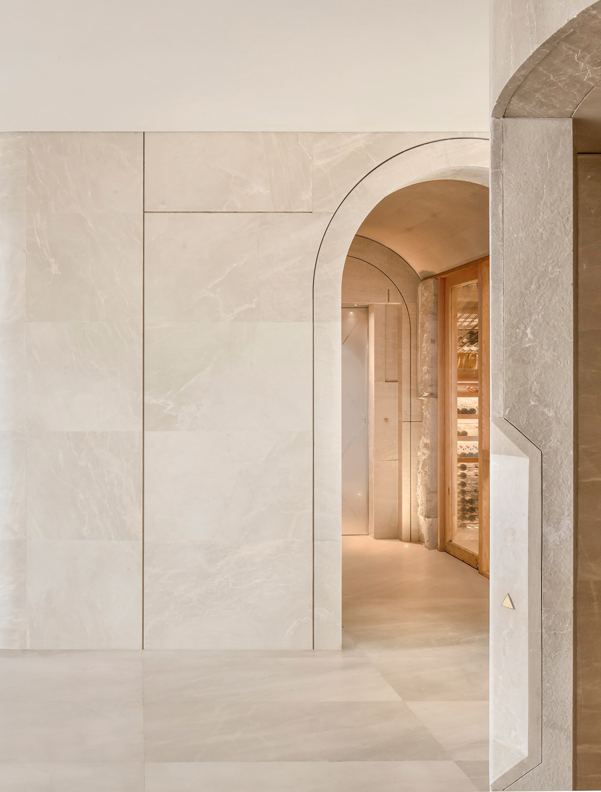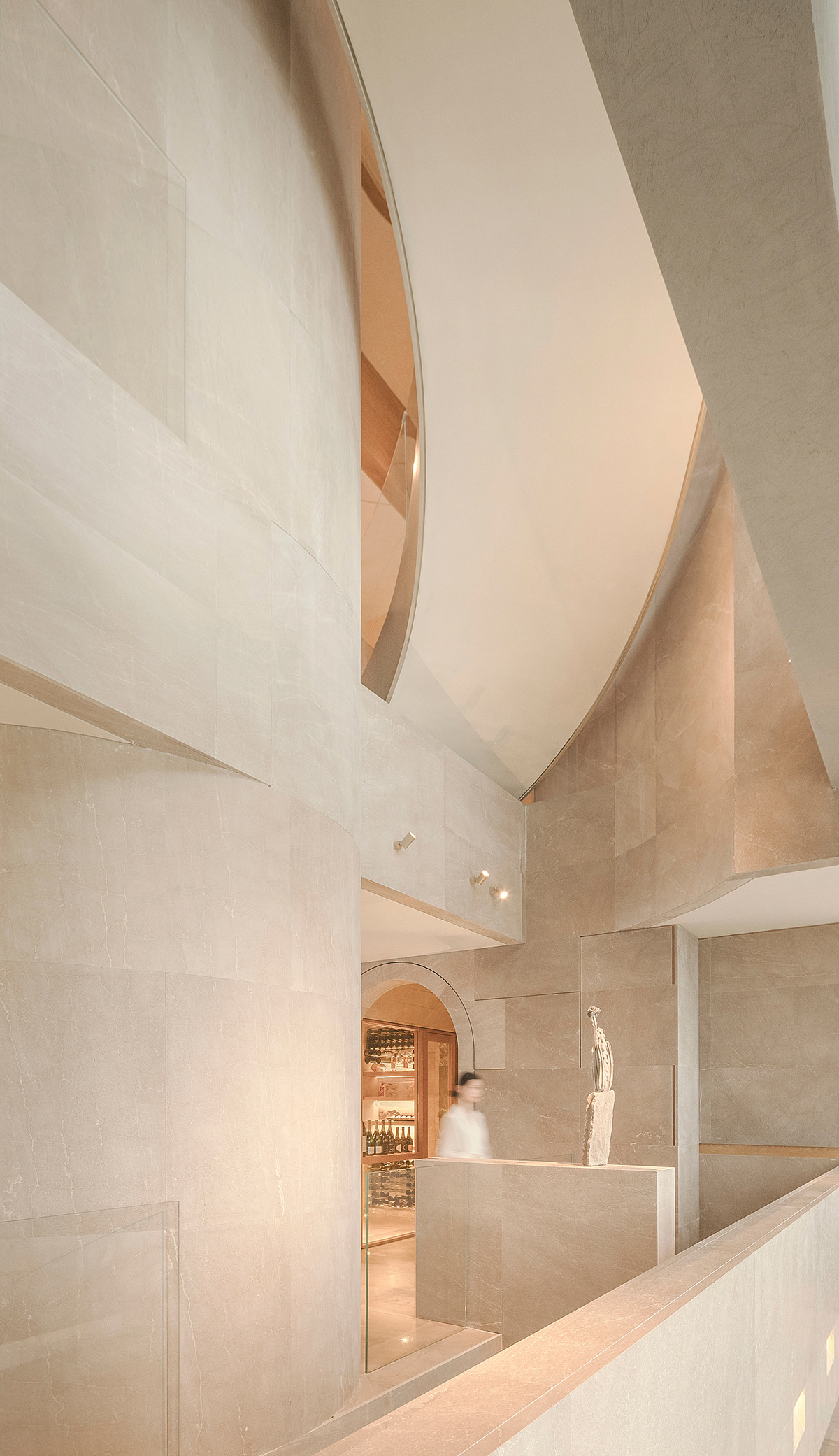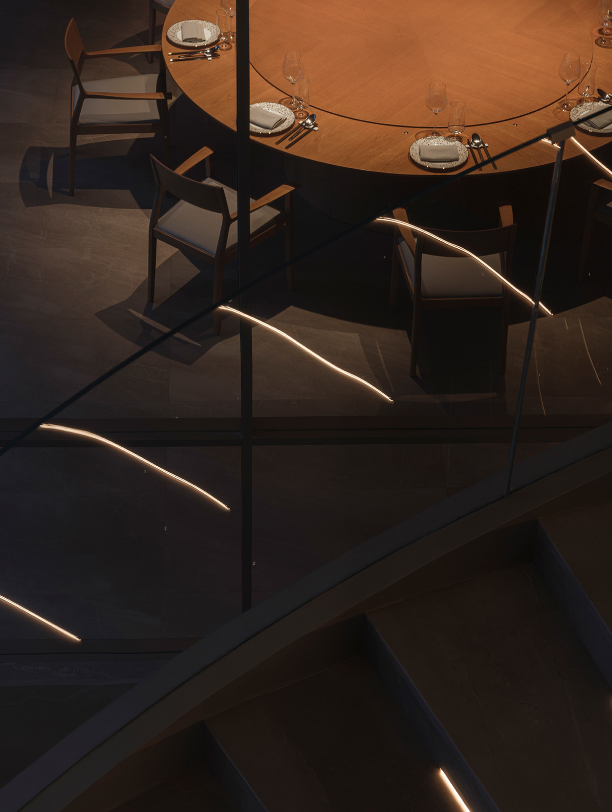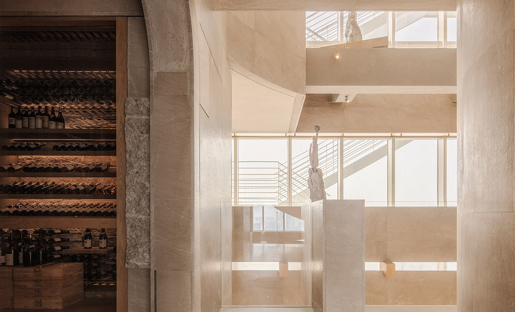 酒窖走廊同时也是电梯转换区间,故意拉长的空间距离;狭长进深所形成的慢镜头感;视觉味觉听觉的观感漫步其中……慢慢渗透至醇厚浓郁的餐饮气氛。