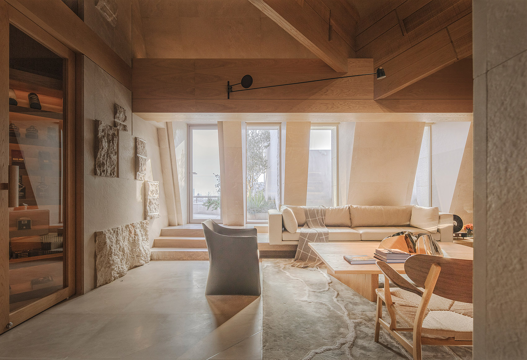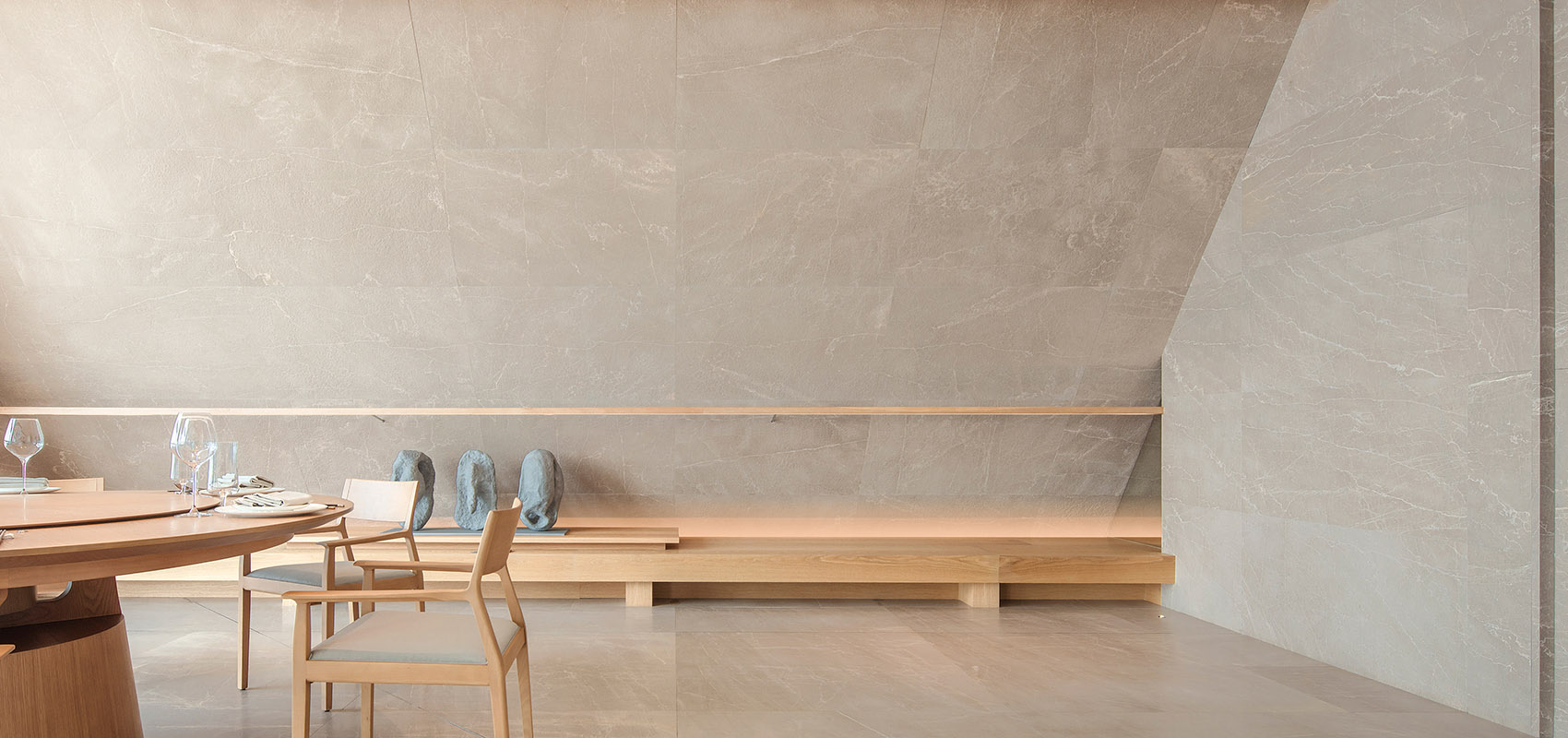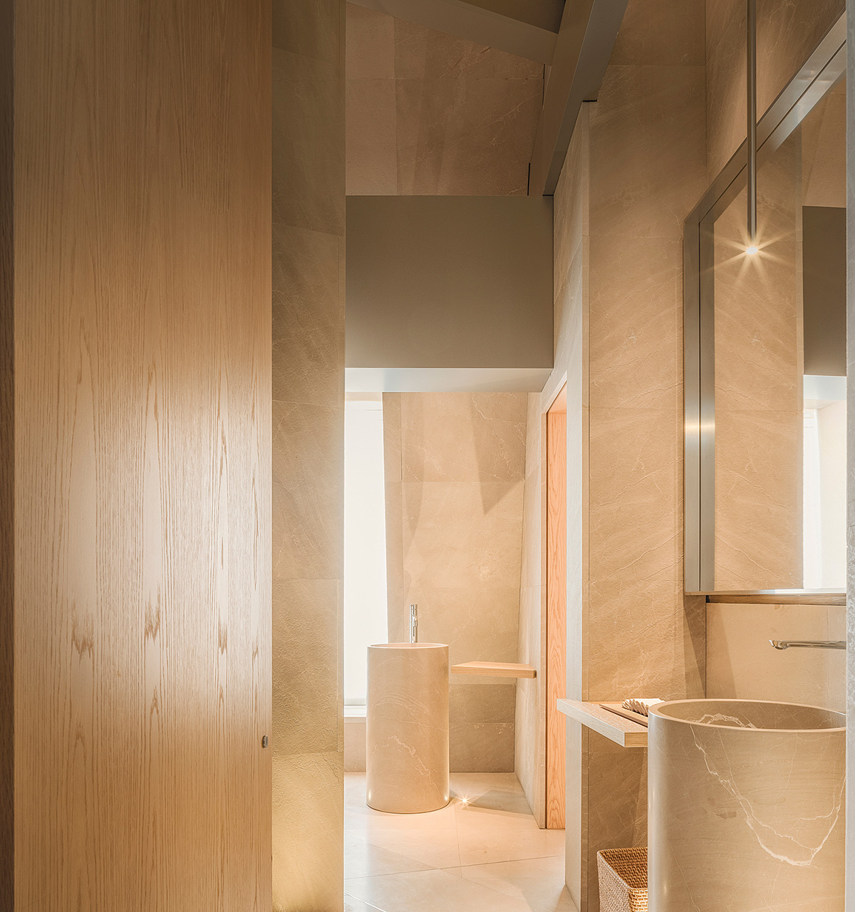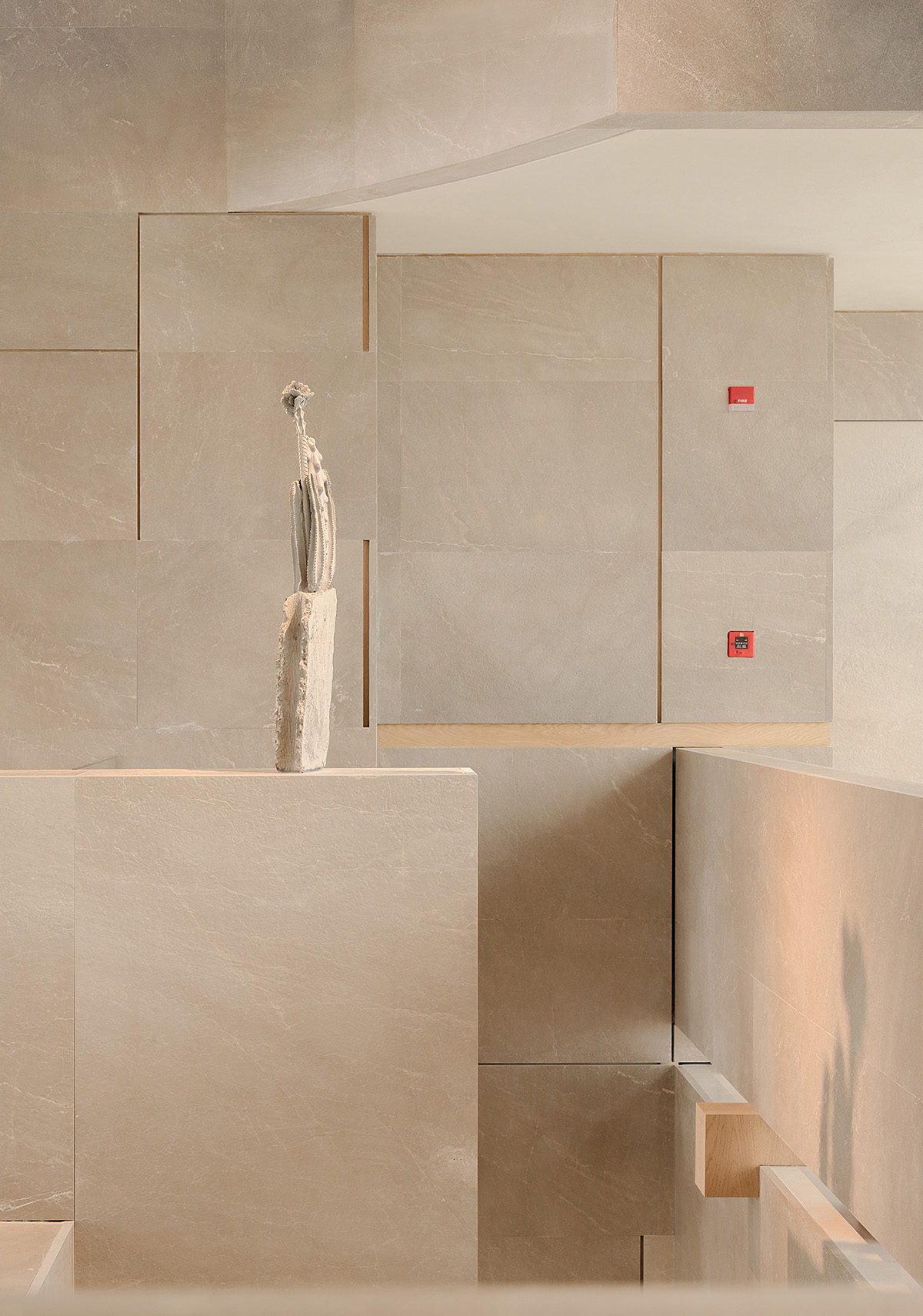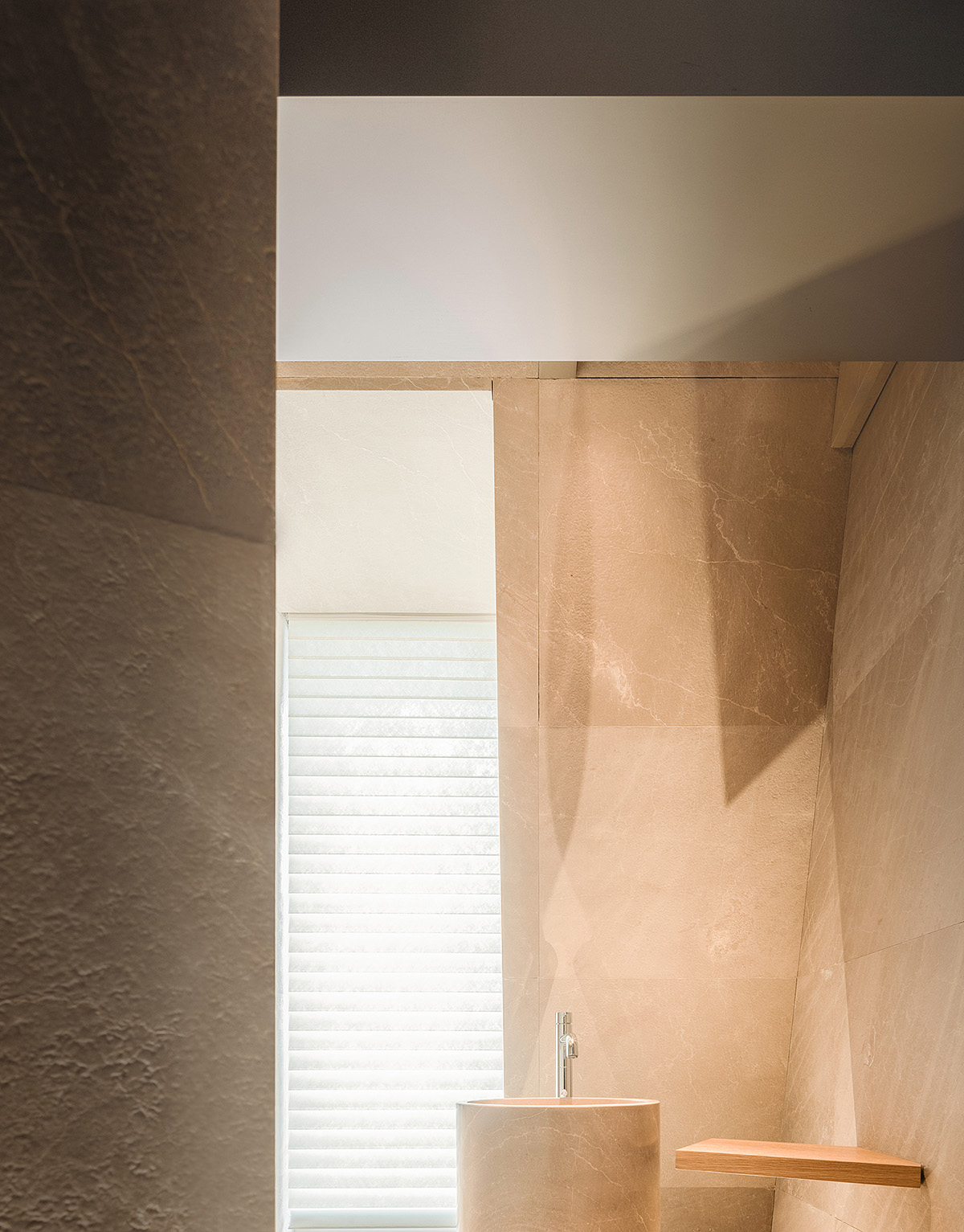材料:贵州米黄石、橡木、质感漆