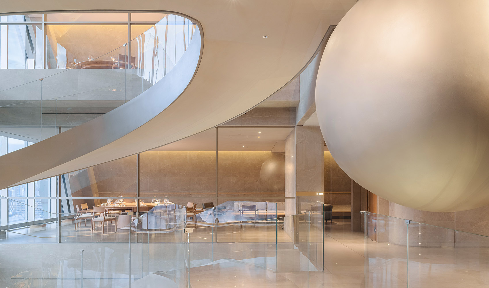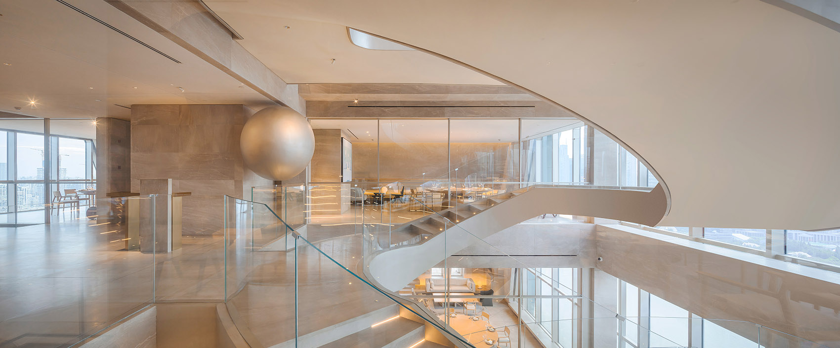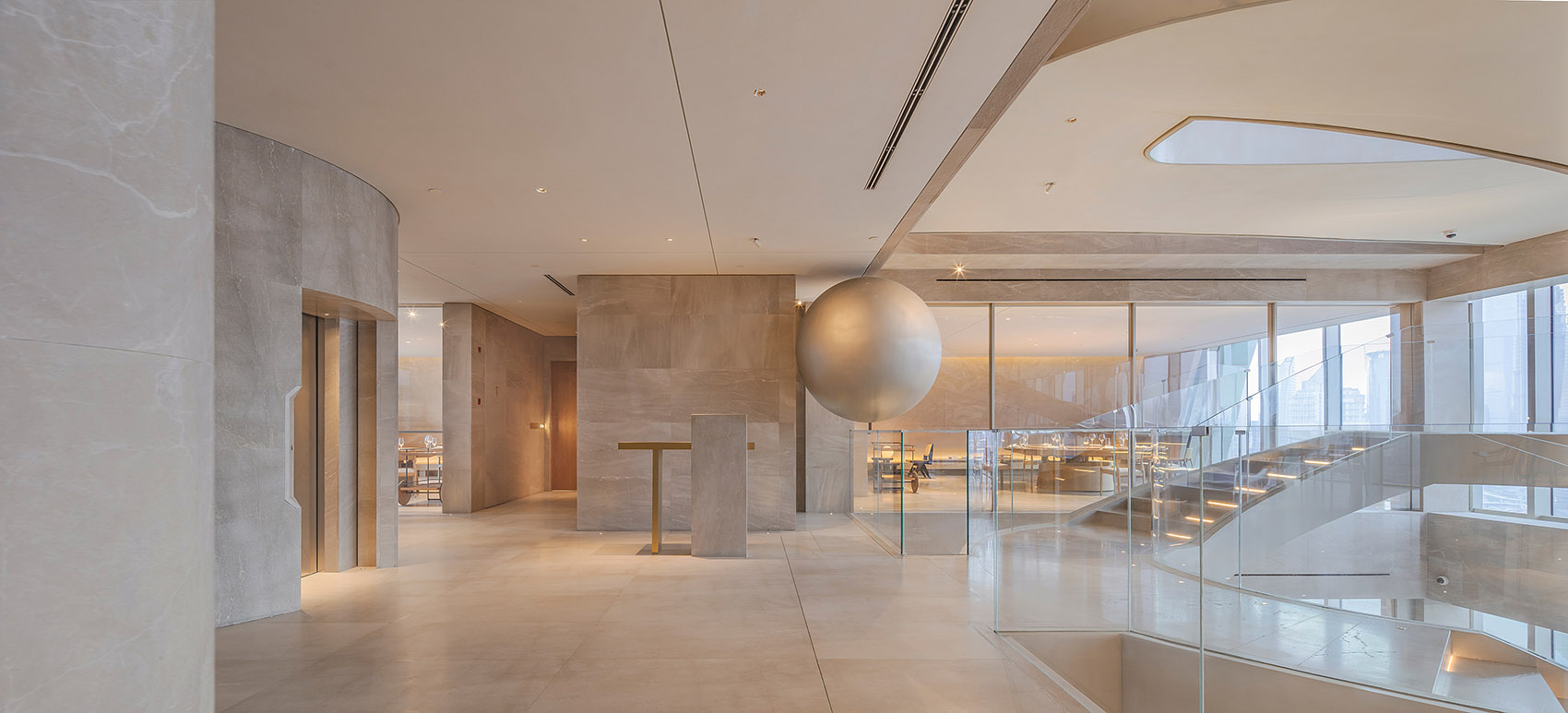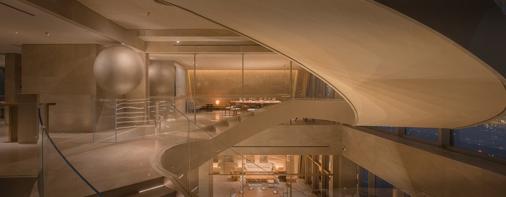 在30层接待台及旋梯中间处,设有一个悬浮的球体装置,珍珠般瑰丽晶莹,与外滩东方明珠交相辉映,宛如波提切利笔下维纳斯诞生的美丽传说,灵动神秘,引发遐想浮翩。