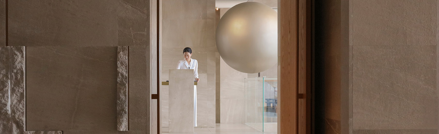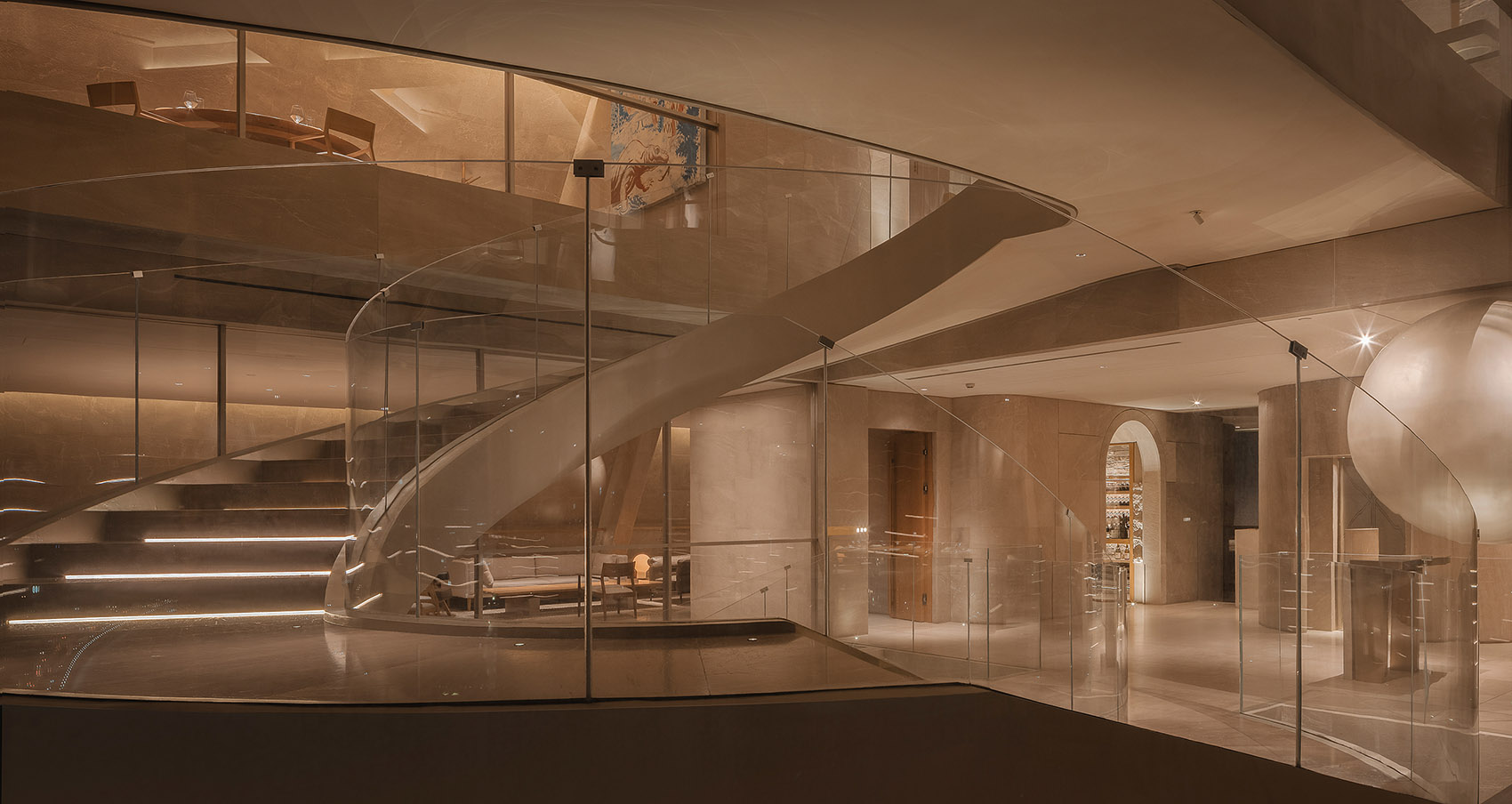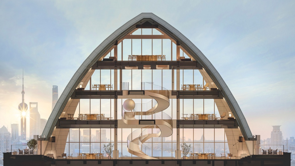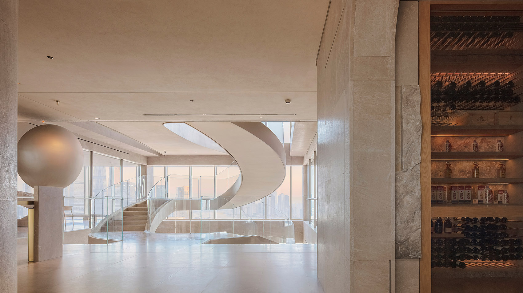 在30层接待台及旋梯中间处,设有一个悬浮的球体装置,珍珠般瑰丽晶莹,与外滩东方明珠交相辉映,宛如波提切利笔下维纳斯诞生的美丽传说,灵动神秘,引发遐想浮翩。