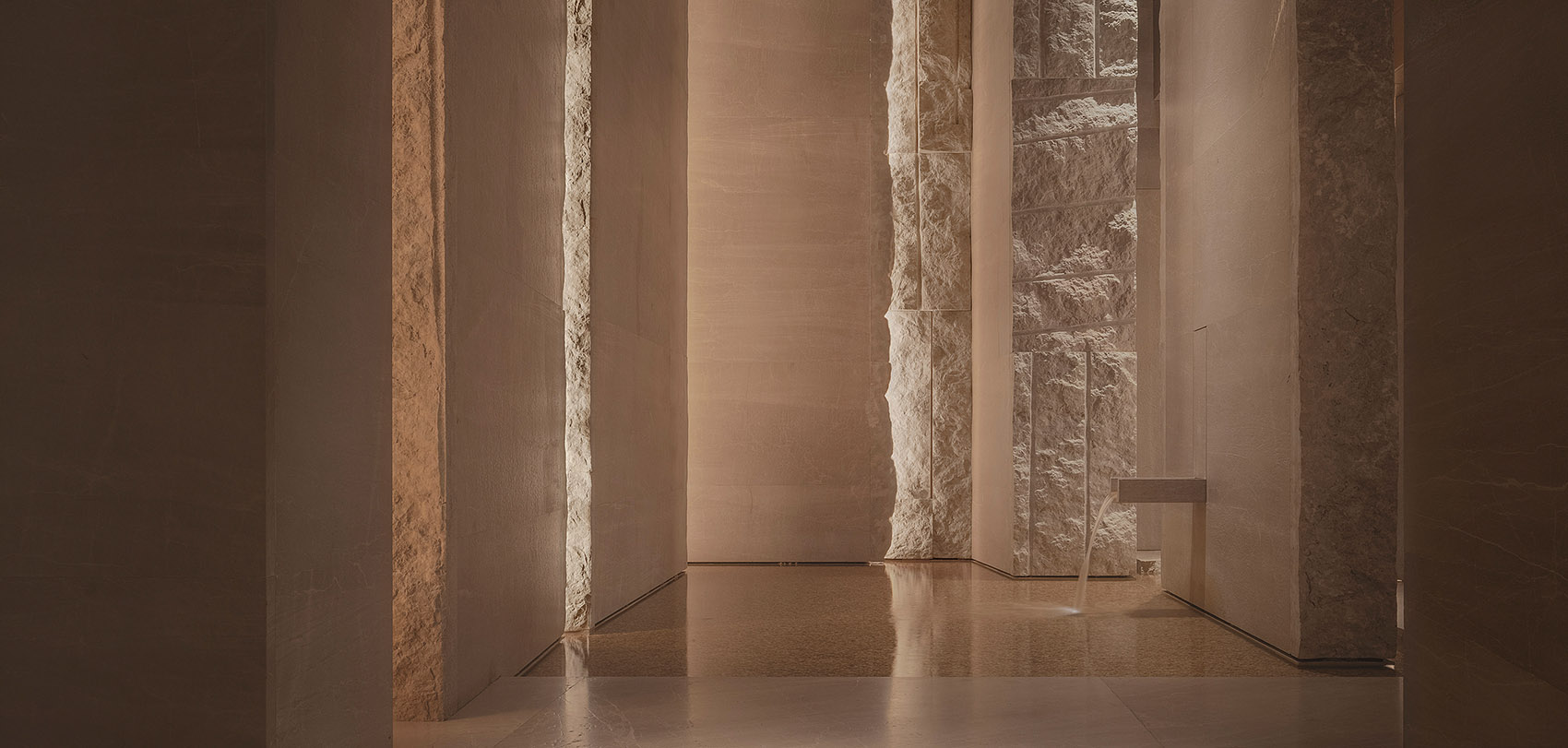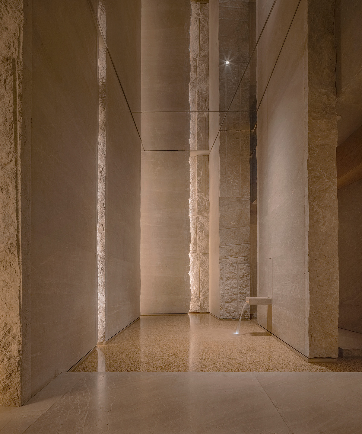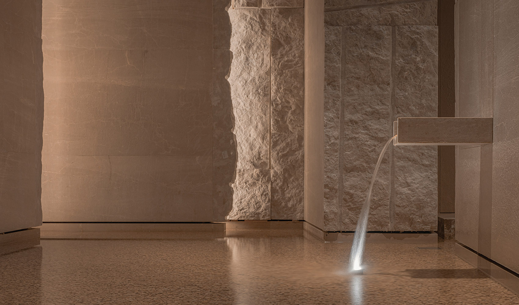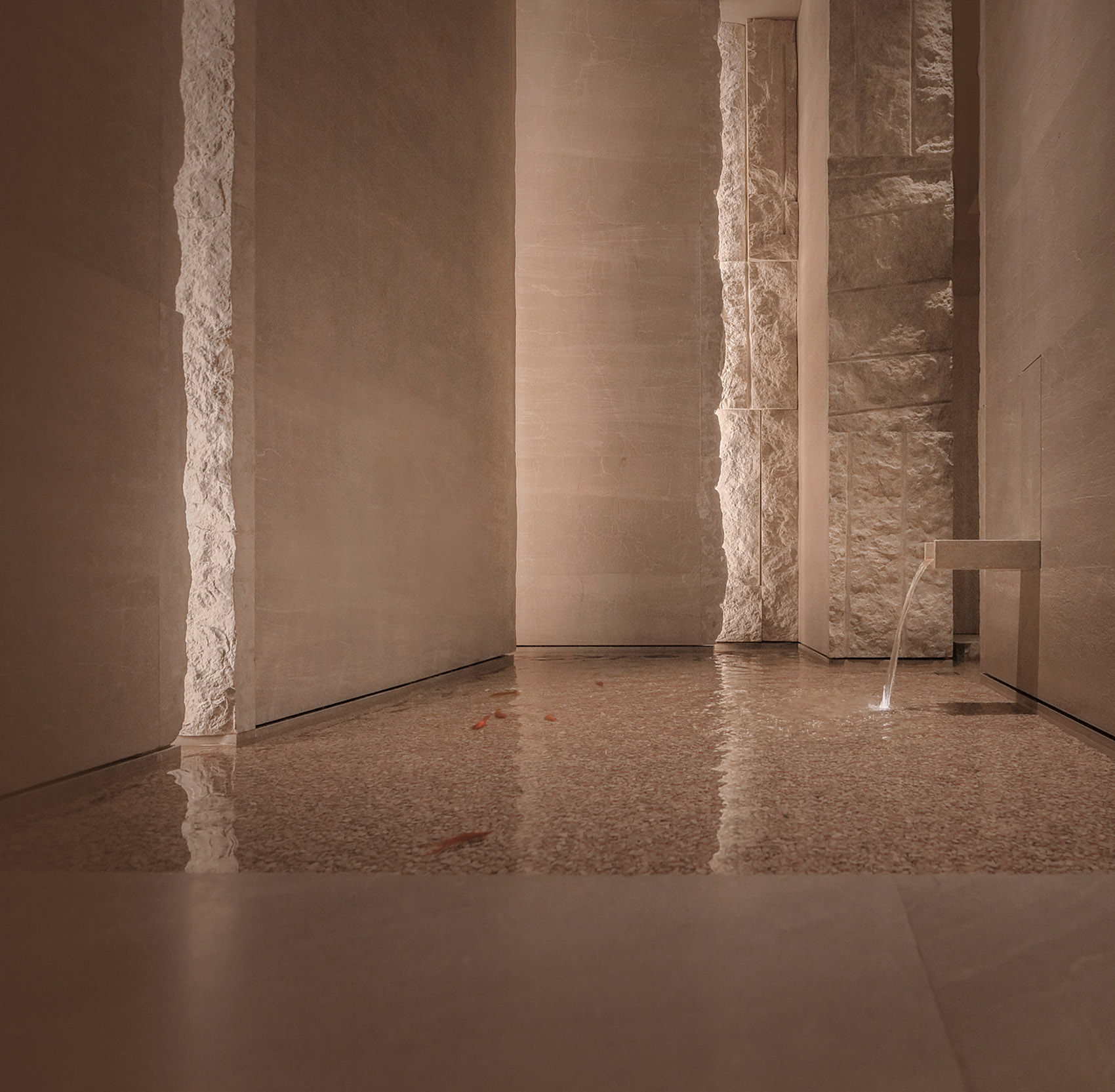 入口处和水池区域,以亚光与糙面的原石处理,自然斧劈,形成此境。原粗石切割对比,以强烈的现代构成手法,水池底用米黄石英小碎,造境若河道细沙,流水静溢,山间溪径更着幽境,小鱼野趣其中。