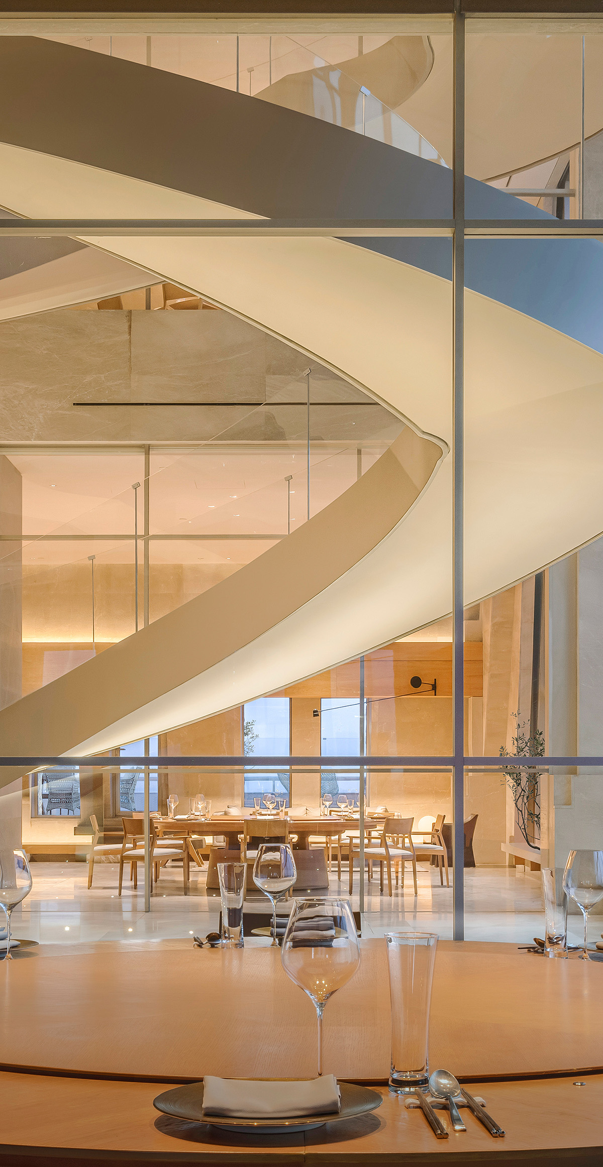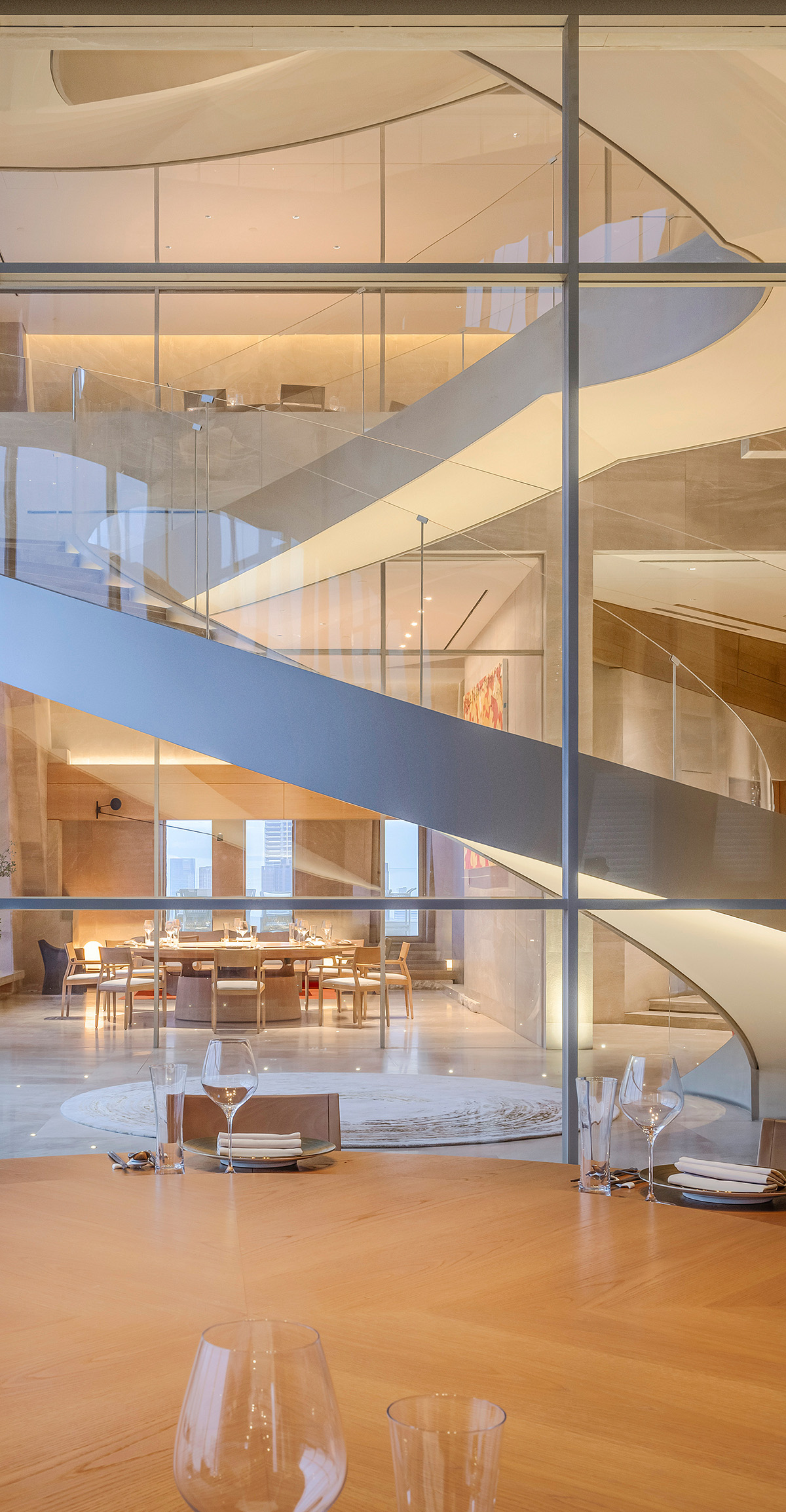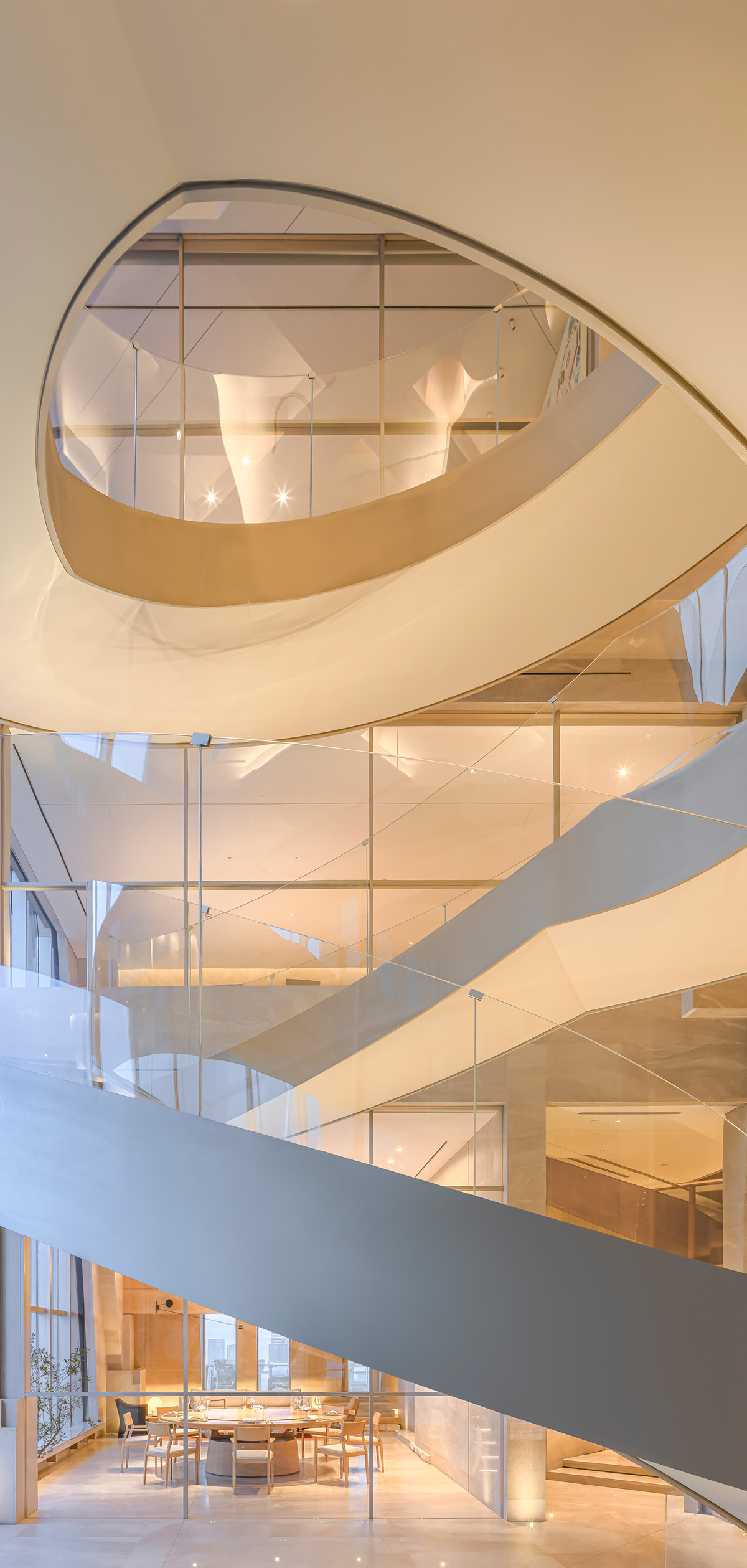 观景旋梯为整个室内提供更加丰富的空间层次,起点睛作用,同时分流了餐厅29至31层的部分人流,规范了整个餐饮的服务流程。