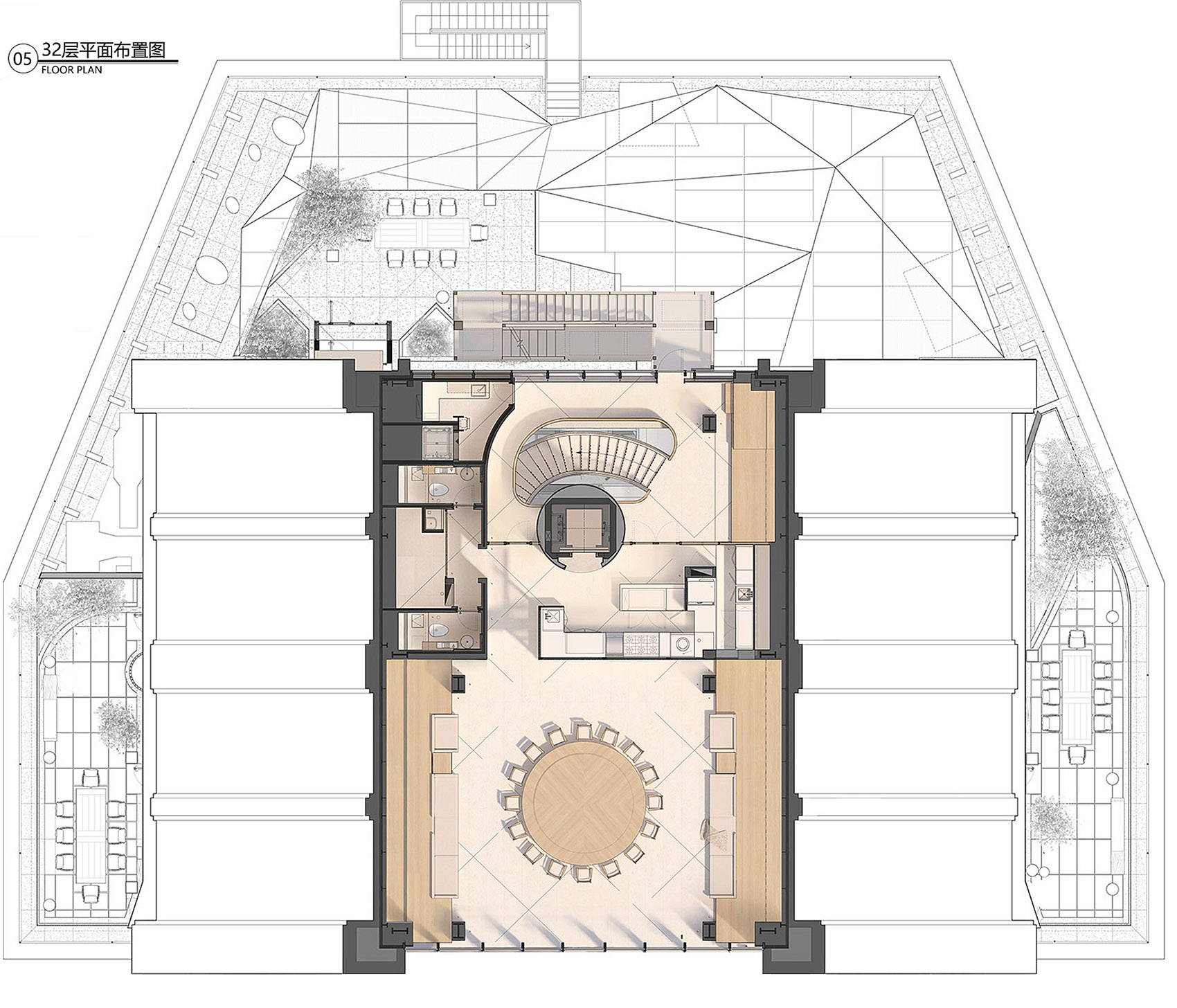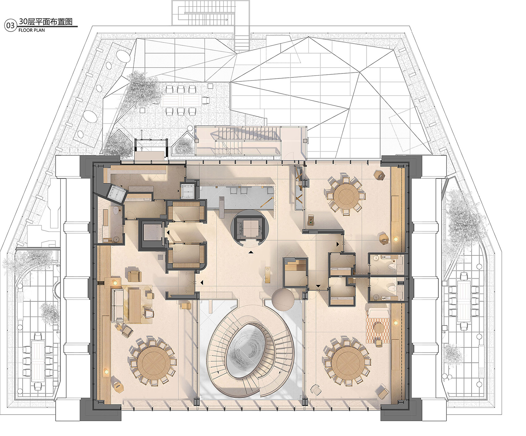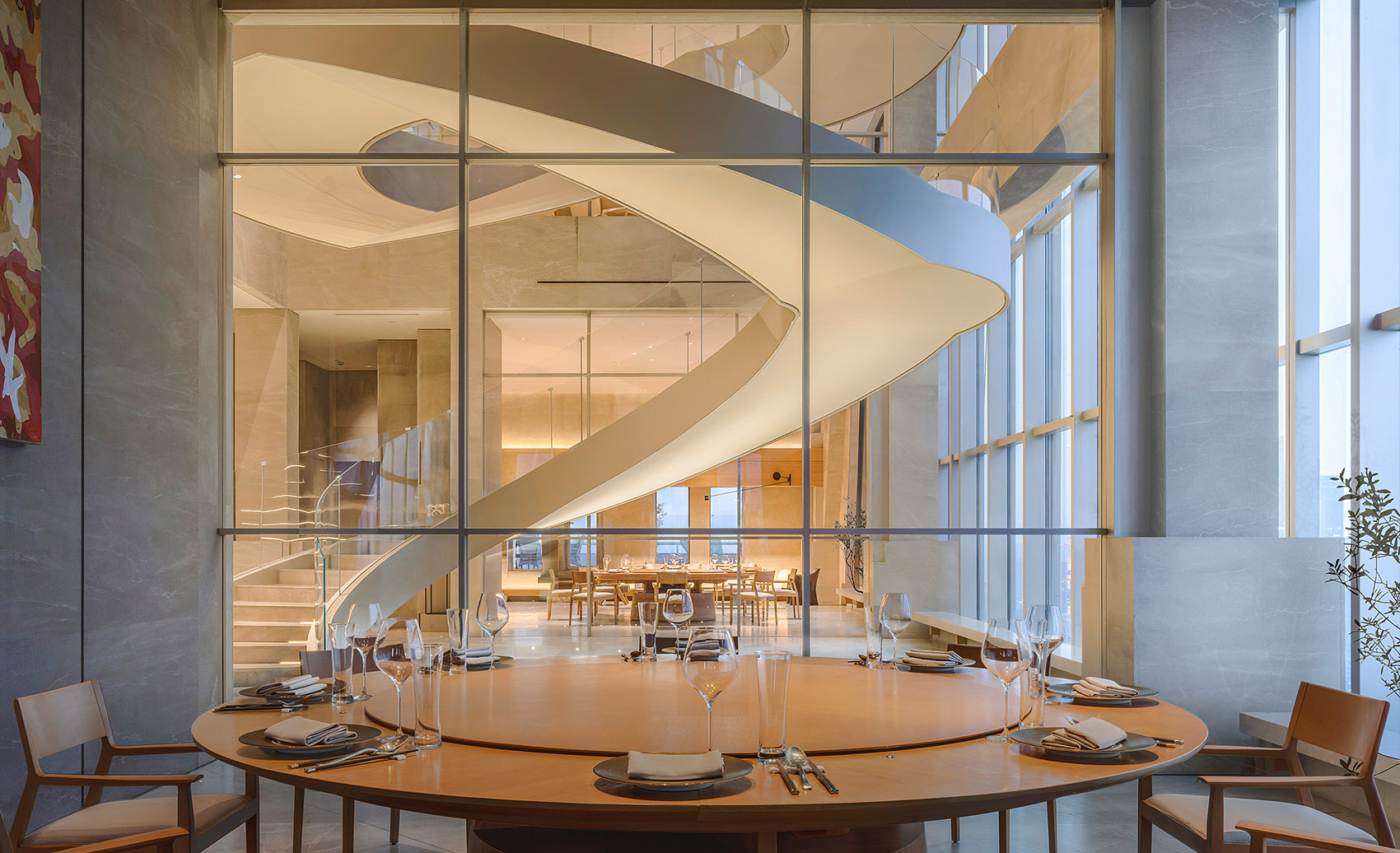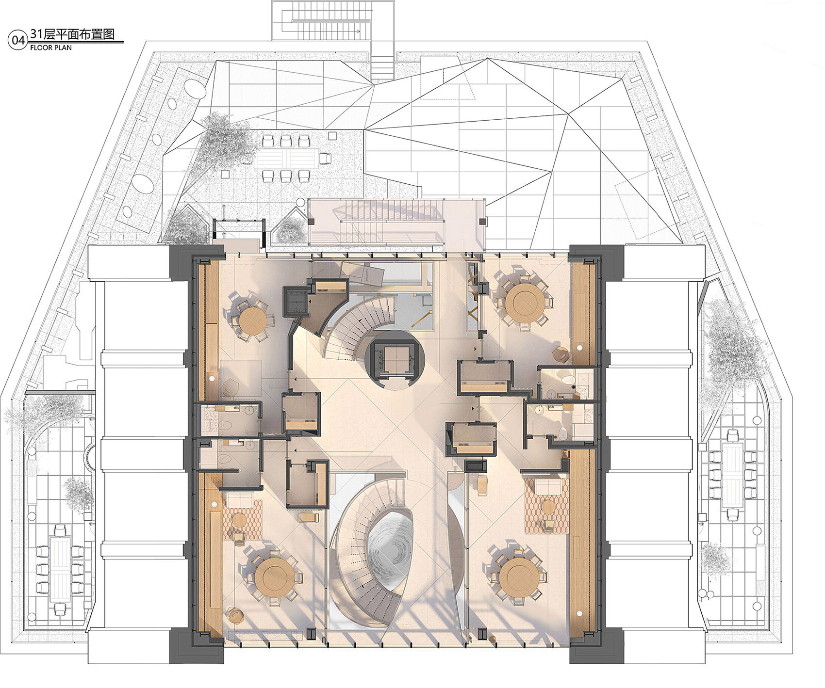 观景旋梯为整个室内提供更加丰富的空间层次,起点睛作用,同时分流了餐厅29至31层的部分人流,规范了整个餐饮的服务流程。