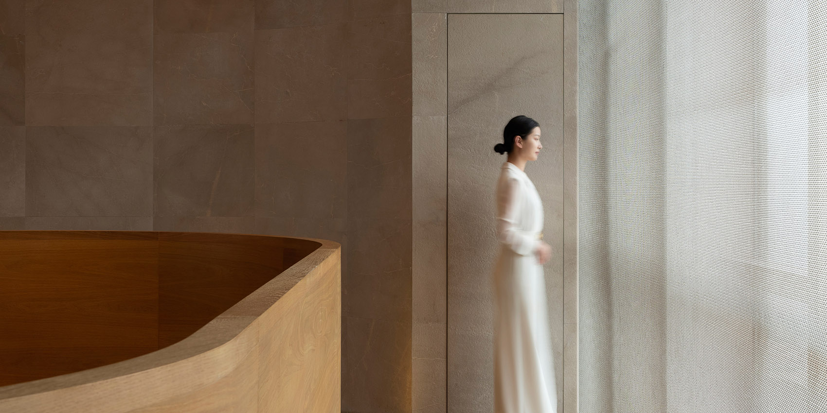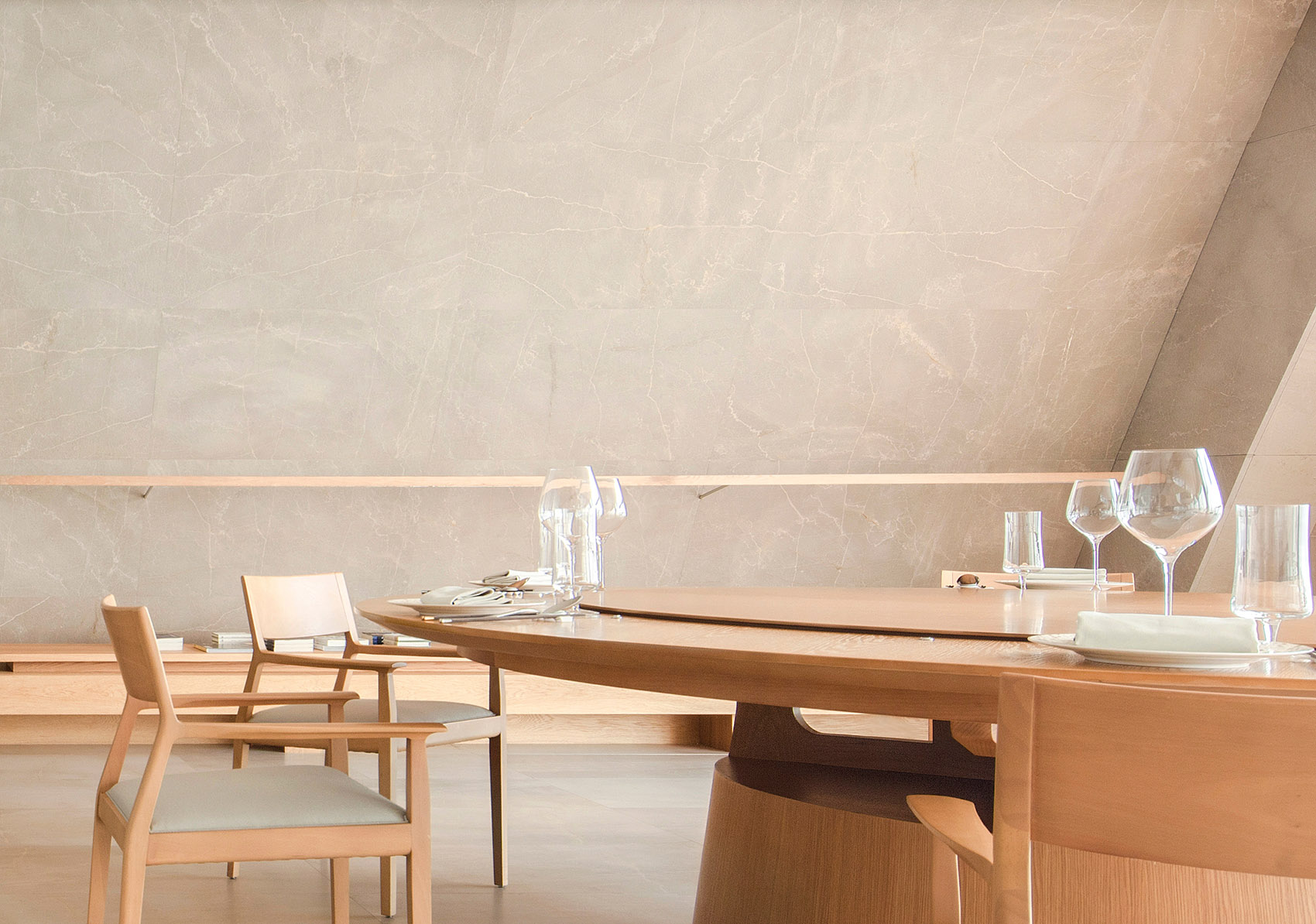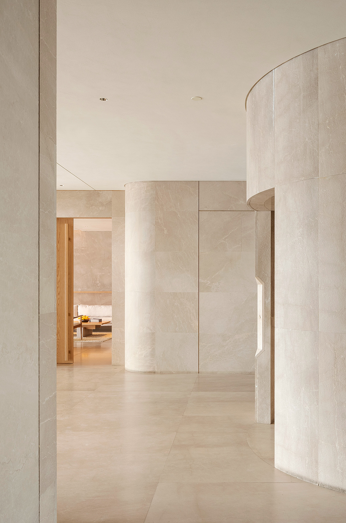 室内气氛营造手法处理,选材使用大面积米黄天然大理石,自然仿古面,以少量的原木点缀,所有的室内物品尽显温润,含蓄。无需过多色彩跳跃,不跟室外景色斗艳,整个空间气氛保持素雅宁静。