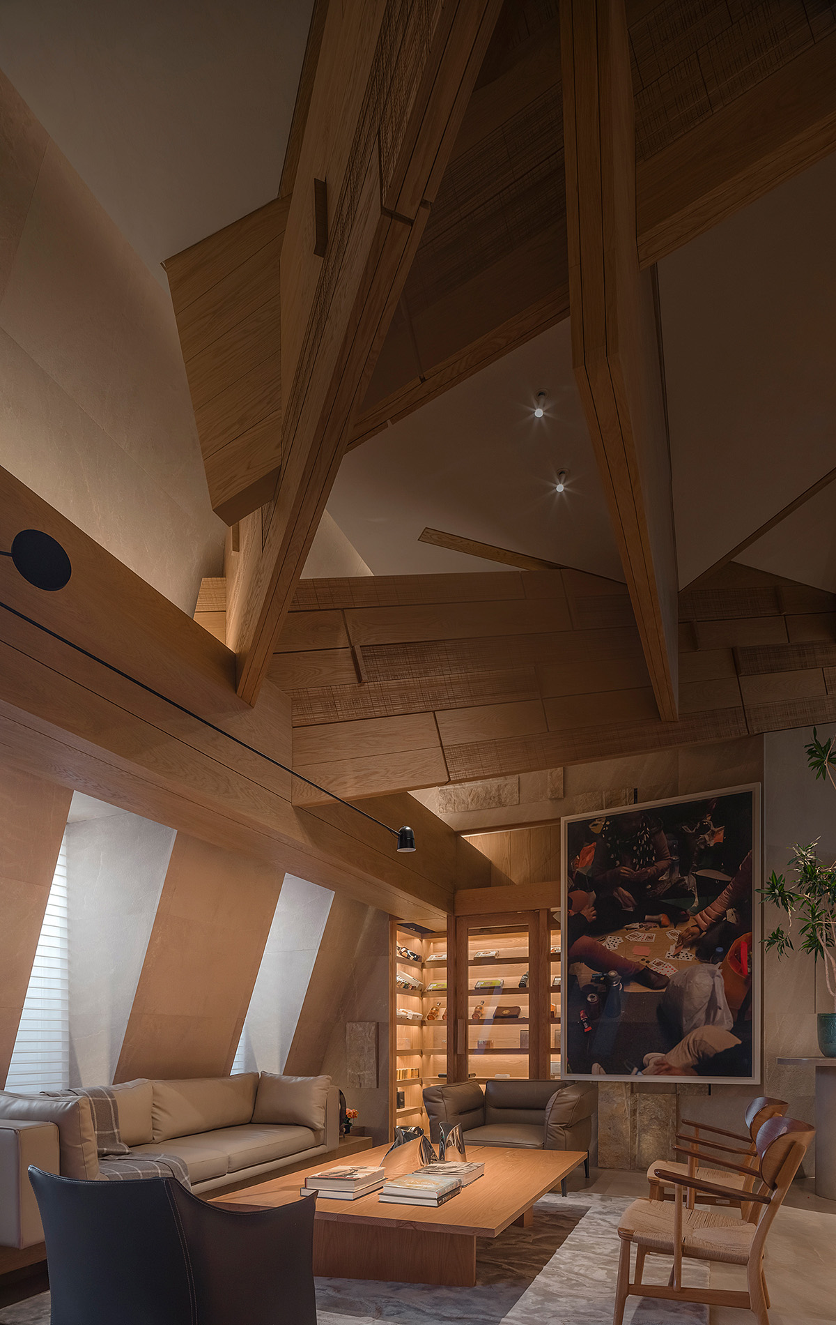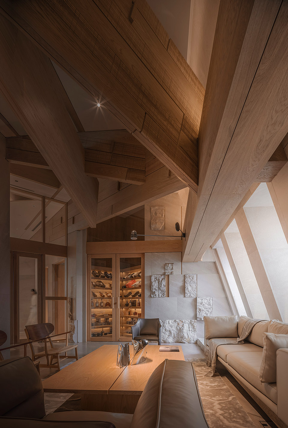 雪茄吧,汇聚洽谈、休闲、阅读、品酒等功能,这区域以木材穿插构造和粗旷的石材结合,强有力的视觉符号把这里塑造成特征明显的区域。设计语言略显放松,同时也让整个餐厅的使用功能更为丰富。