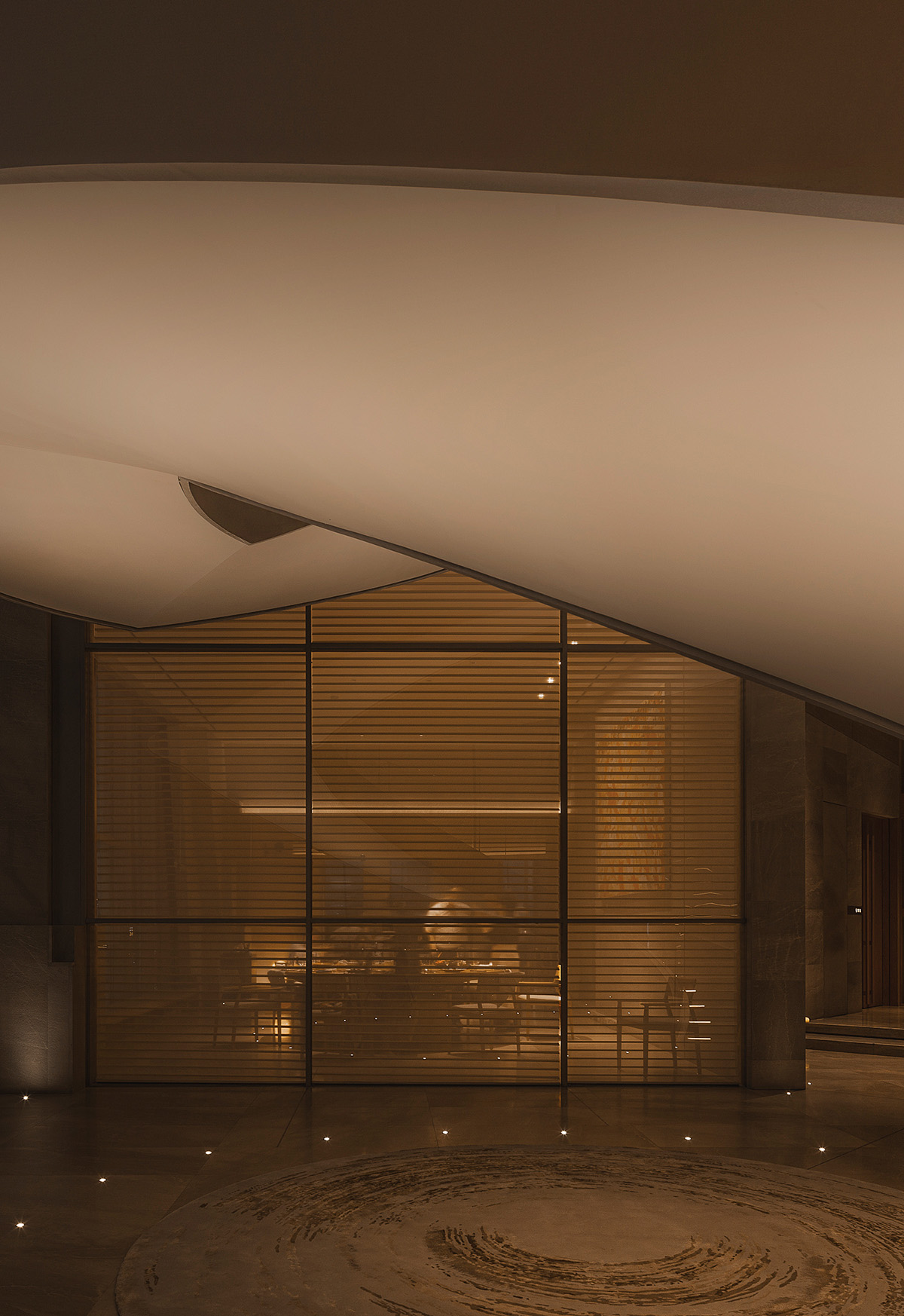 四层设计11个包间,让其与公共区更加宽敞开阔;片区人流减少,空间环境更加宁静,整体空间处理通透,玻璃幕与外环境的融合,形成更强大气场。包间玻璃墙都设有电动柔纱帘控制开合,缓缓降下的仪式感,自由把握私密社交需求。